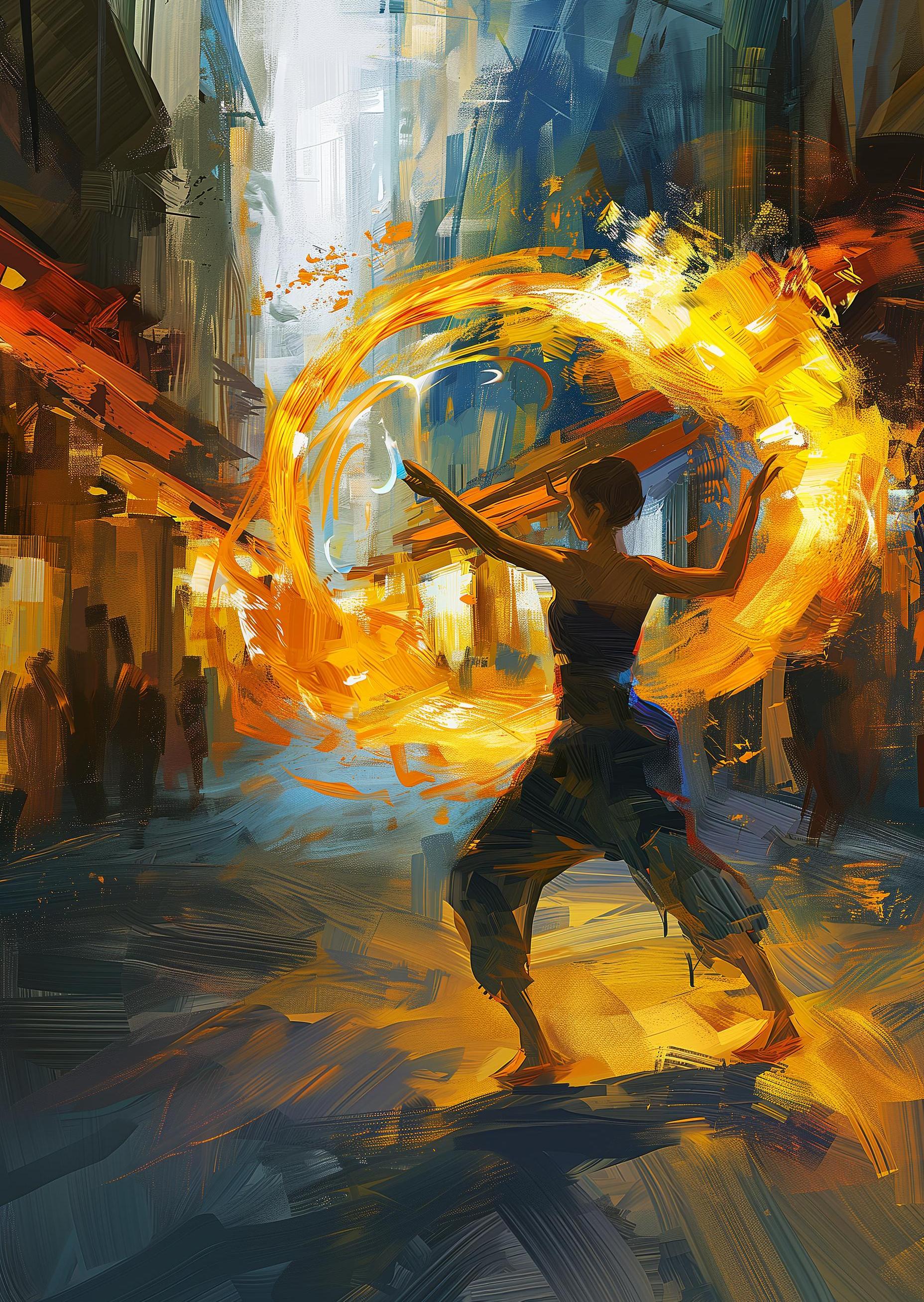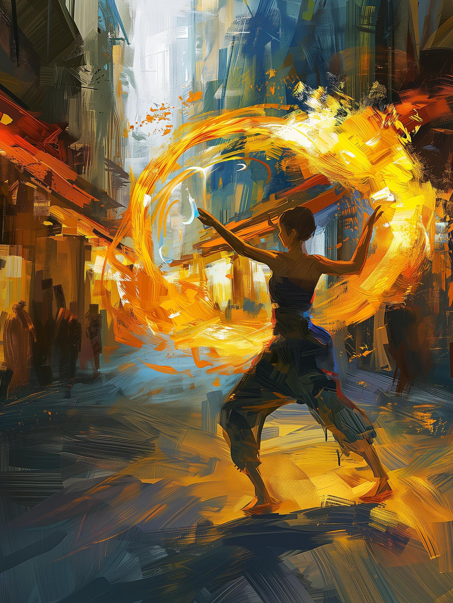 In a bustling canvas of bold strokes and vibrant hues, a dancer becomes the brush. Her limbs paint the air with fiery arcs, each movement a burst of light against the shadowed cityscape. It's as if the sun itself has been captured, spinning and leaping in her graceful hands. This is a dance of creation, a spectacle where every swirl ignites a story, and every leap sculpts the space. She is both artist and art, her dance a vivid splash on the fabric of the world.