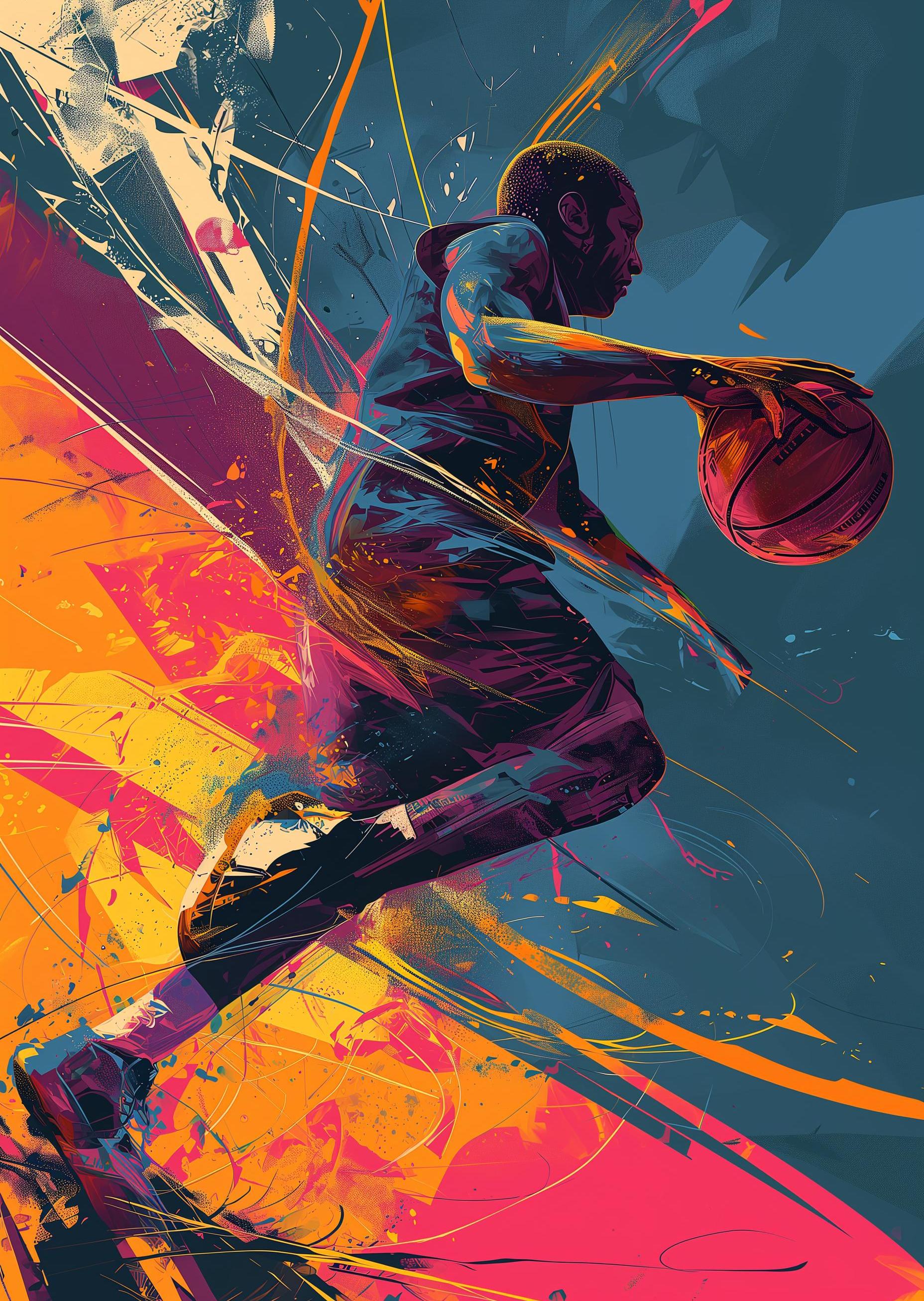In a burst of color and motion, a basketball player charges down the court. His muscles tense as he dodges opponents, eyes fixed on the hoop. The crowd's cheers fill the air, a wild backdrop to the pulsing energy of the game. Sweat blends with determination, his breath sharp in his lungs. Time ticks down; the ball leaves his hands, soaring toward a hopeful basket. The buzzer blares, and all eyes follow the ball's flight, willing it through the net.