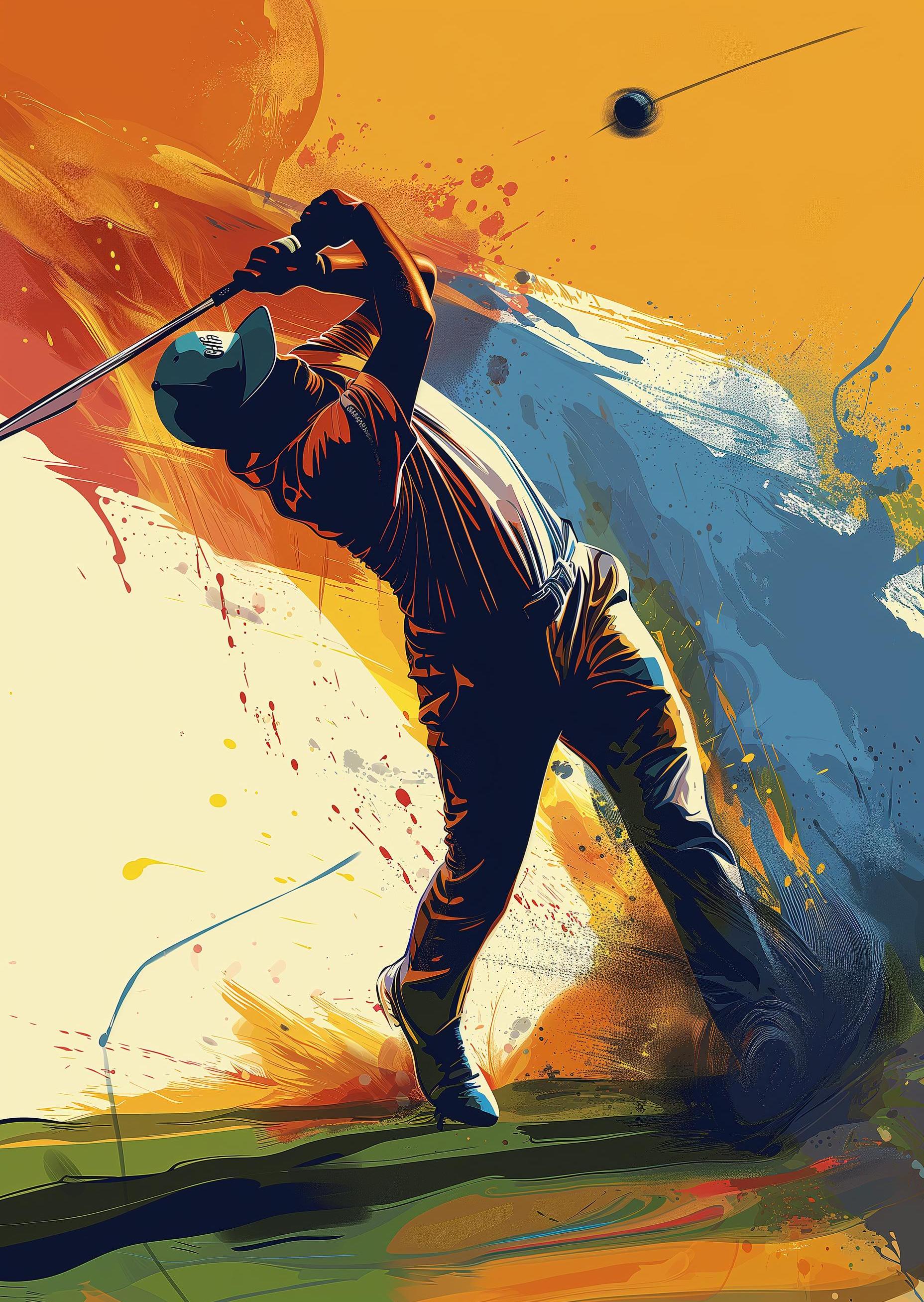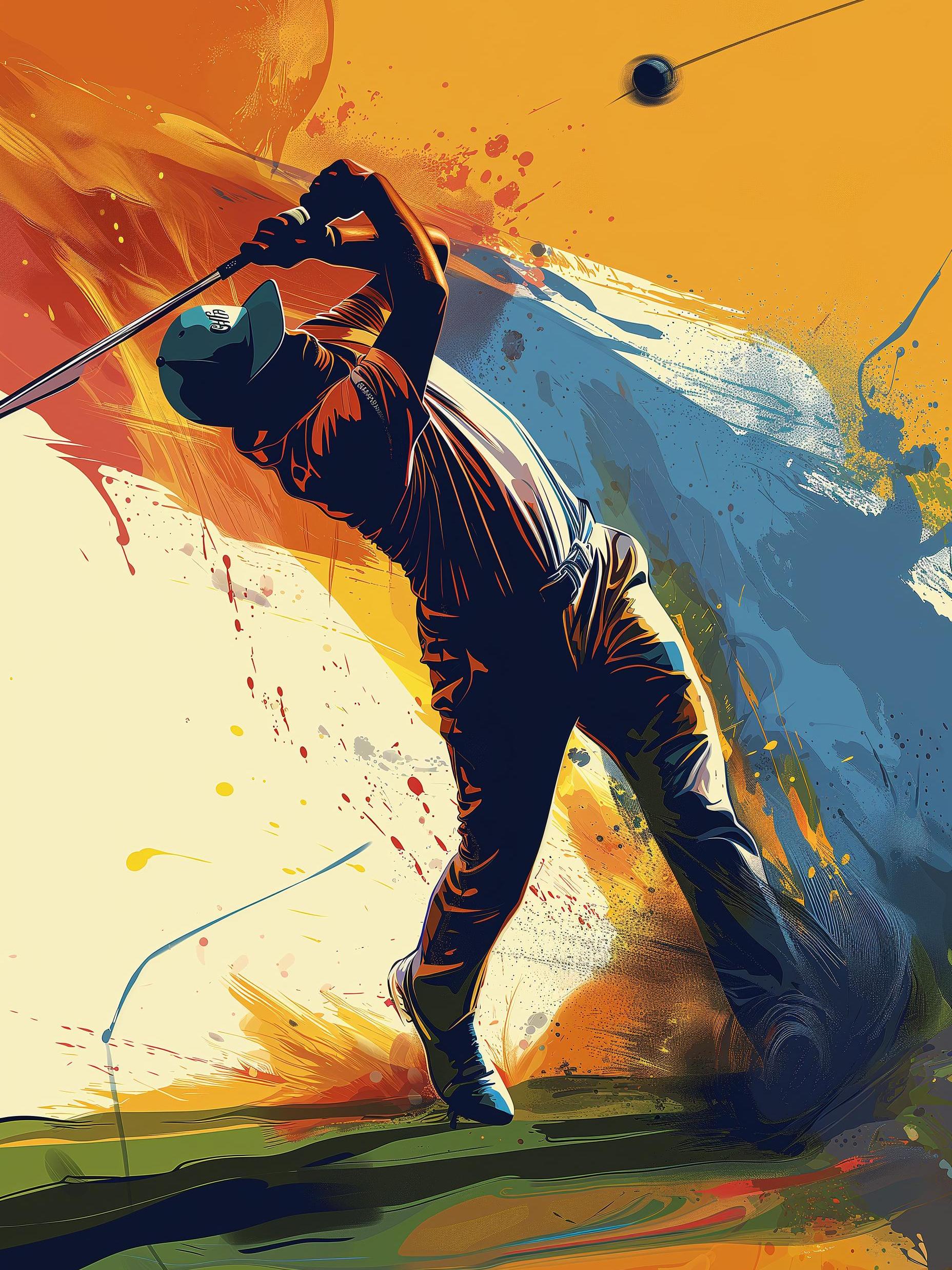 In a world of vibrant strokes and bold colors, a golfer stands focused, with sweat on his brow. With a firm grip and tense muscles, he swings, slicing through the air with power. The ball soars, its fate hanging in the silence. Eyes trail its flight, hearts race, and the crowd holds its breath, waiting to erupt in cheers as the ball finds its mark. It's more than a game; it's a moment where skill and nerves are put to the ultimate test.