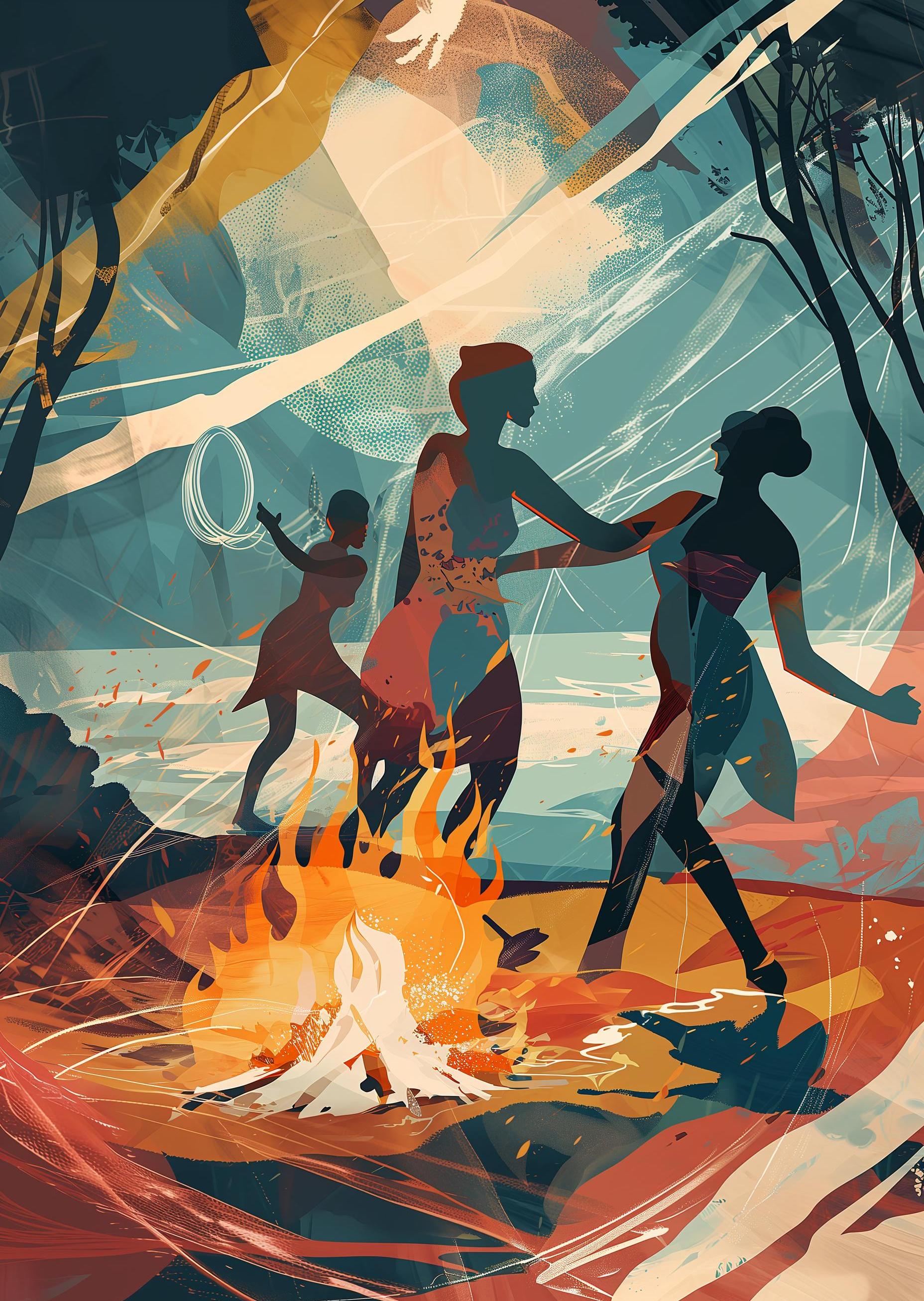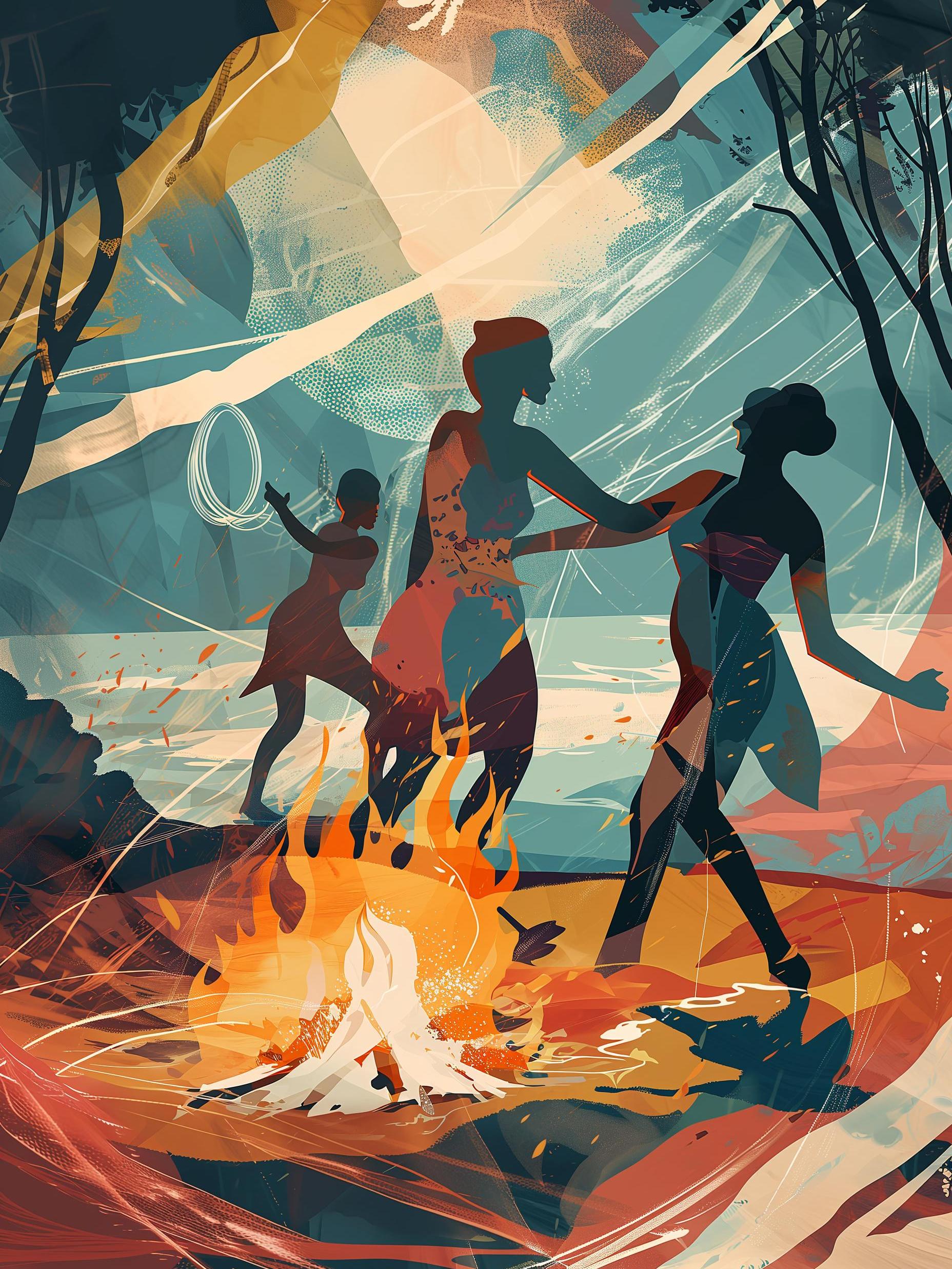 In a vivid dance of colors and shapes, three figures meld with the wild dance of nature. A child, hoop in hand, jumps with pure delight. Nearby, a woman stokes a lively fire, feeding it with gentle care, as it crackles and pops, casting a warm glow. Another figure reaches out, connecting with a companion, symbolizing a bond as strong as the striking trees that frame them. This lively scene is a celebration of life, connection, and the vibrant energy that flows through each moment when the heart is light and the world is a stage for joy and togetherness.