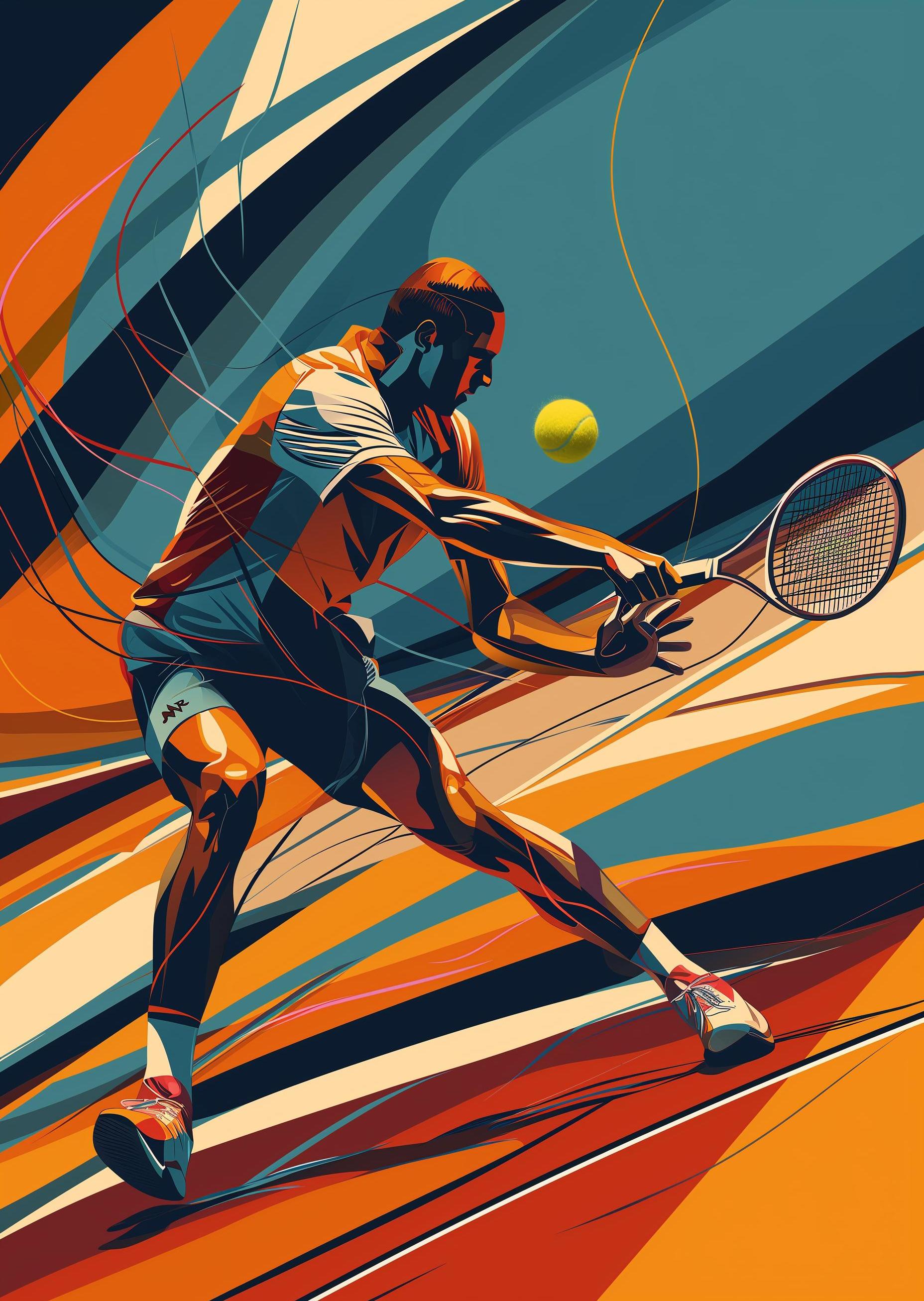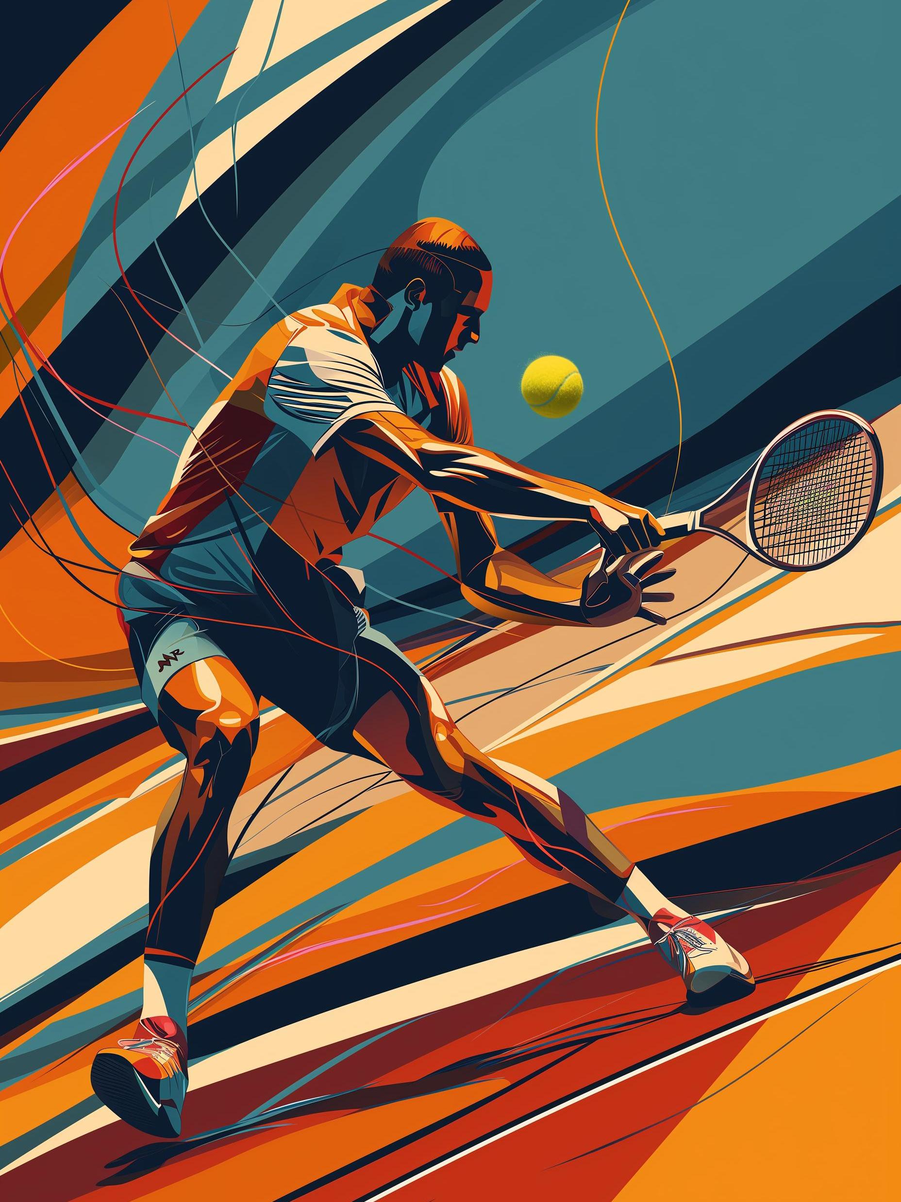 In the heat of the match, a tennis player dashes across the court, his body stretched to the limit. The crowd is silent, the air thick with expectation. He swings with all his might, racing to meet the bright yellow ball. It's a dance of speed and skill, each move full of urgent energy. Eyes locked on the target, he hits the ball with a powerful backhand. The volley is sharp, the competition fierce. Both players are determined, but only one can win. This moment, charged with tension, holds the promise of victory or the sting of defeat. The player's focus never wavers; he's ready for the challenge.