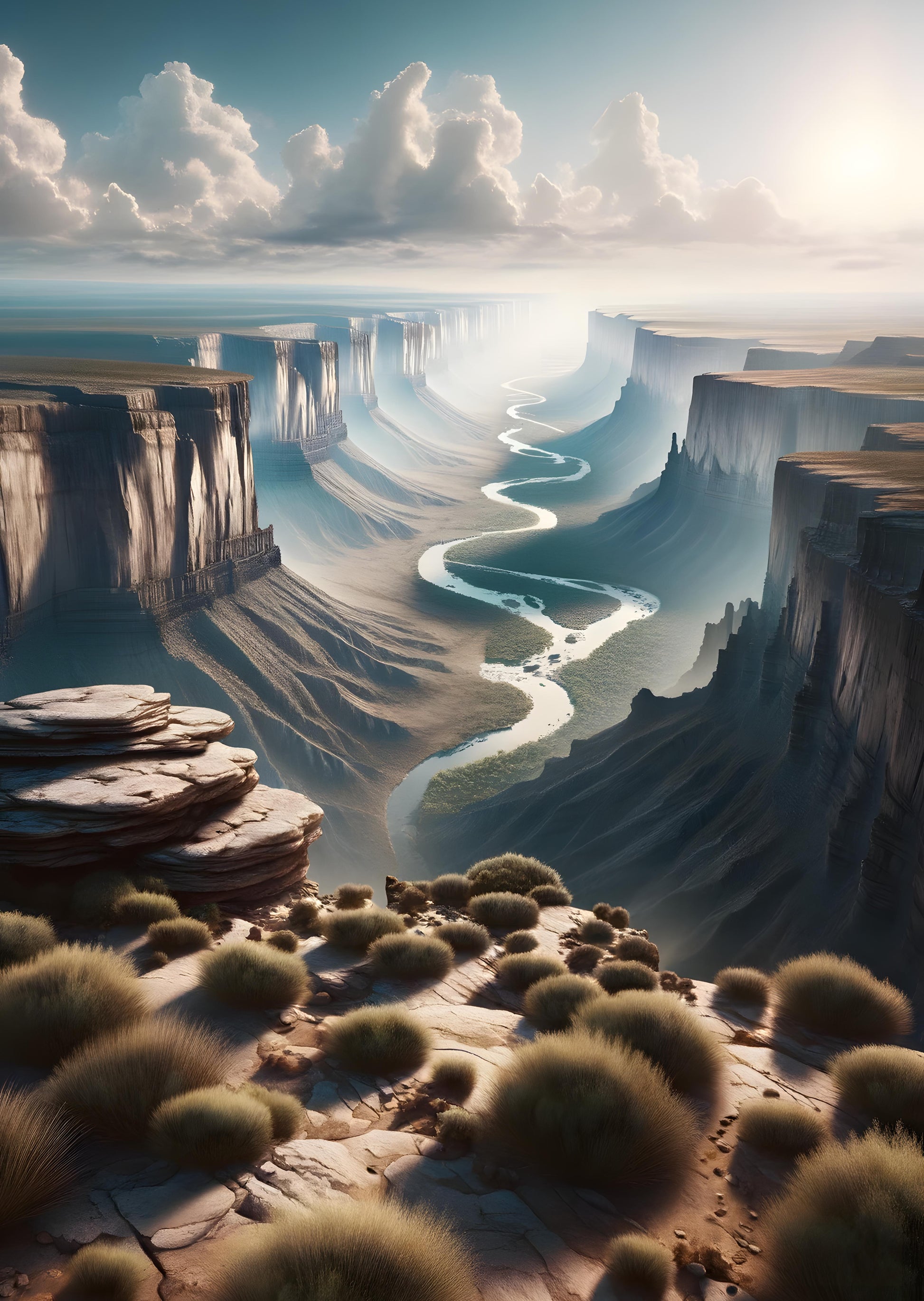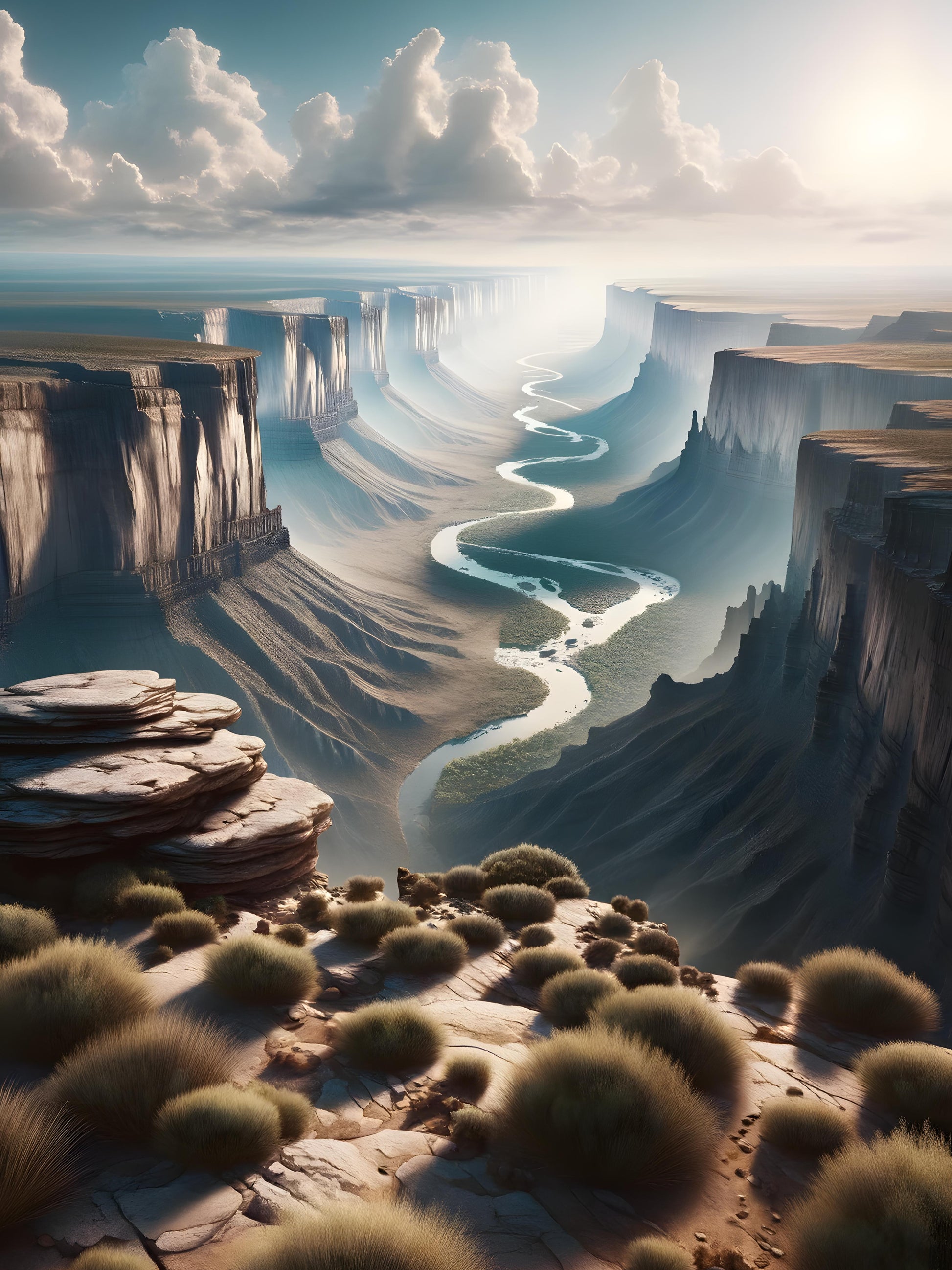 In a vast, rugged canyon bathed in the glow of the morning sun, an emerald river snakes through towering cliffs. It carves a path through the arid environment, providing a life-giving artery to the otherwise desolate landscape. On the edge, flat rocks and tufts of resilient grass huddle together, as if gathering to admire the expansive view below. Light filters in, casting soft shadows and highlighting the intricate layers of the rock formations. This is nature's canvas, a testament to time and the elements, a scene that evokes awe and a deep respect for the powerful forces that sculpt our world. It's a place that tells a story of perseverance, beauty, and the incredible scale of our planet's geological wonders.