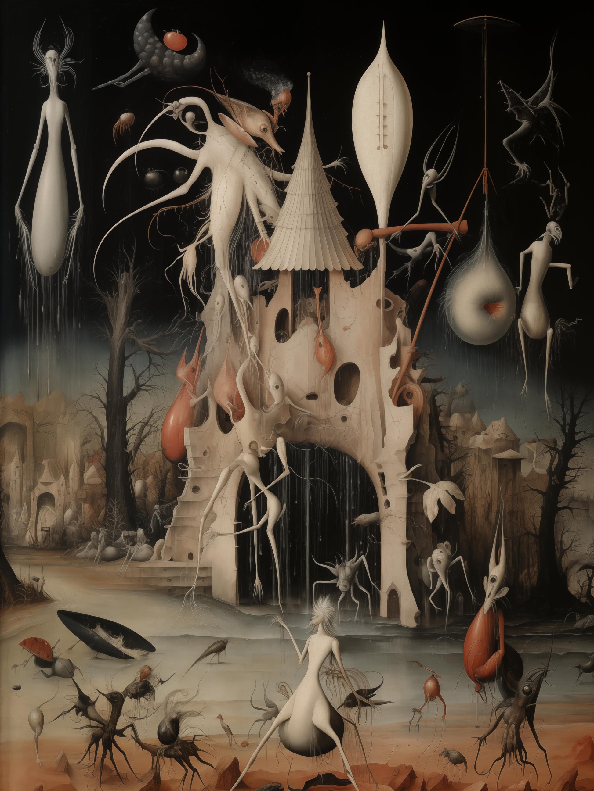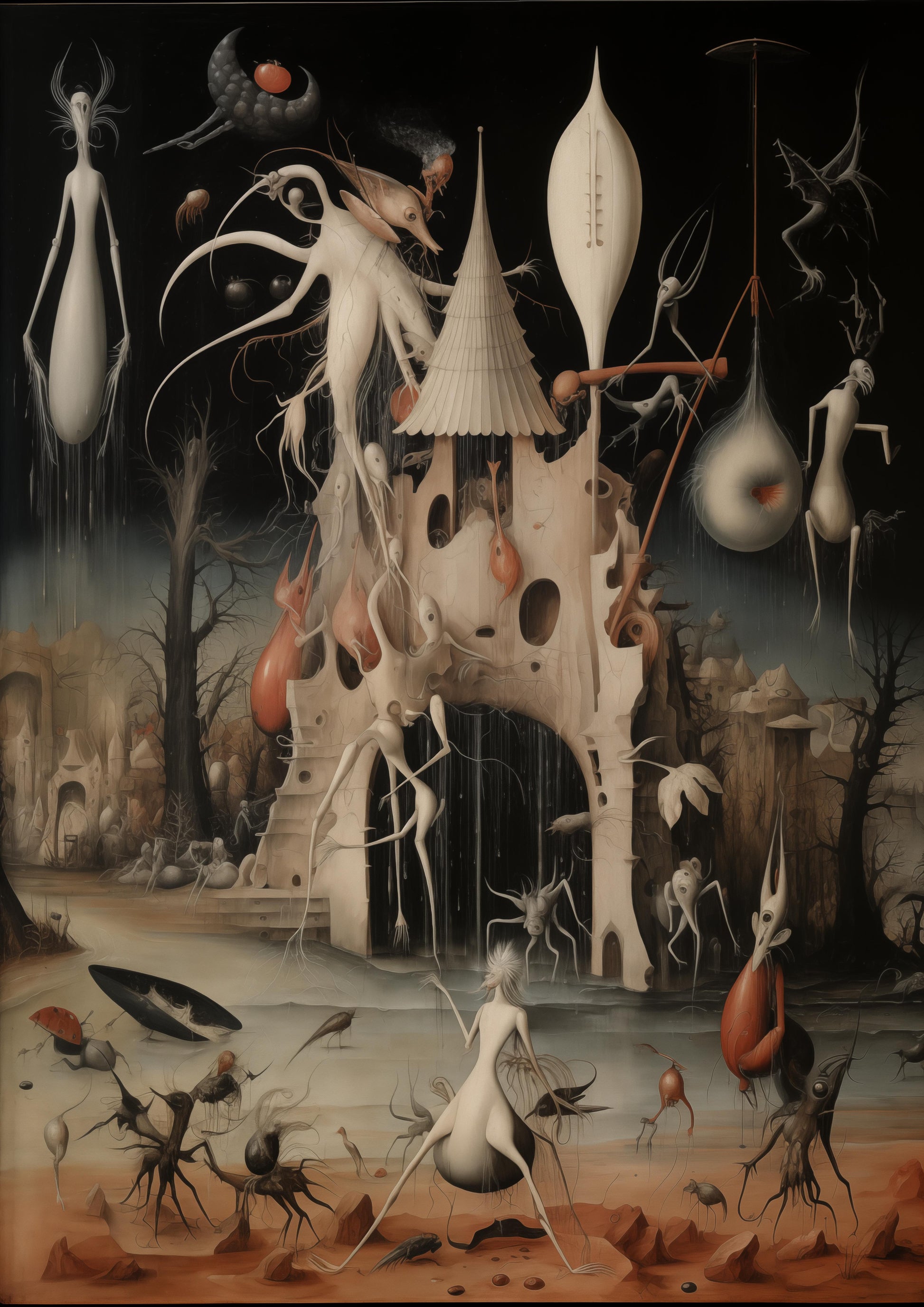 In a peculiar land, beyond the ordinary, there stood a castle of curious design where creatures of strange shapes and sizes roamed. It was a realm of contrasts, where the bleak met the bizarre. Foggy skies and rain enveloped everything, yet the beings appeared unaffected, each occupied with their own peculiar tasks. At the heart, a towering structure, riddled with holes and odd extensions, served as the focal point. Surrounding it, the inhabitants performed a silent dance of existence, neither joyful nor sorrowful. The castle, decaying yet standing tall, was a testament to the resilience and adaptability of its residents. This image reminds us that life, in all its oddities and mysteries, finds a way to continue. It encourages us to accept the unusual and to find our place amidst the chaos, to embrace the unexpected and find beauty in the inexplicable.
