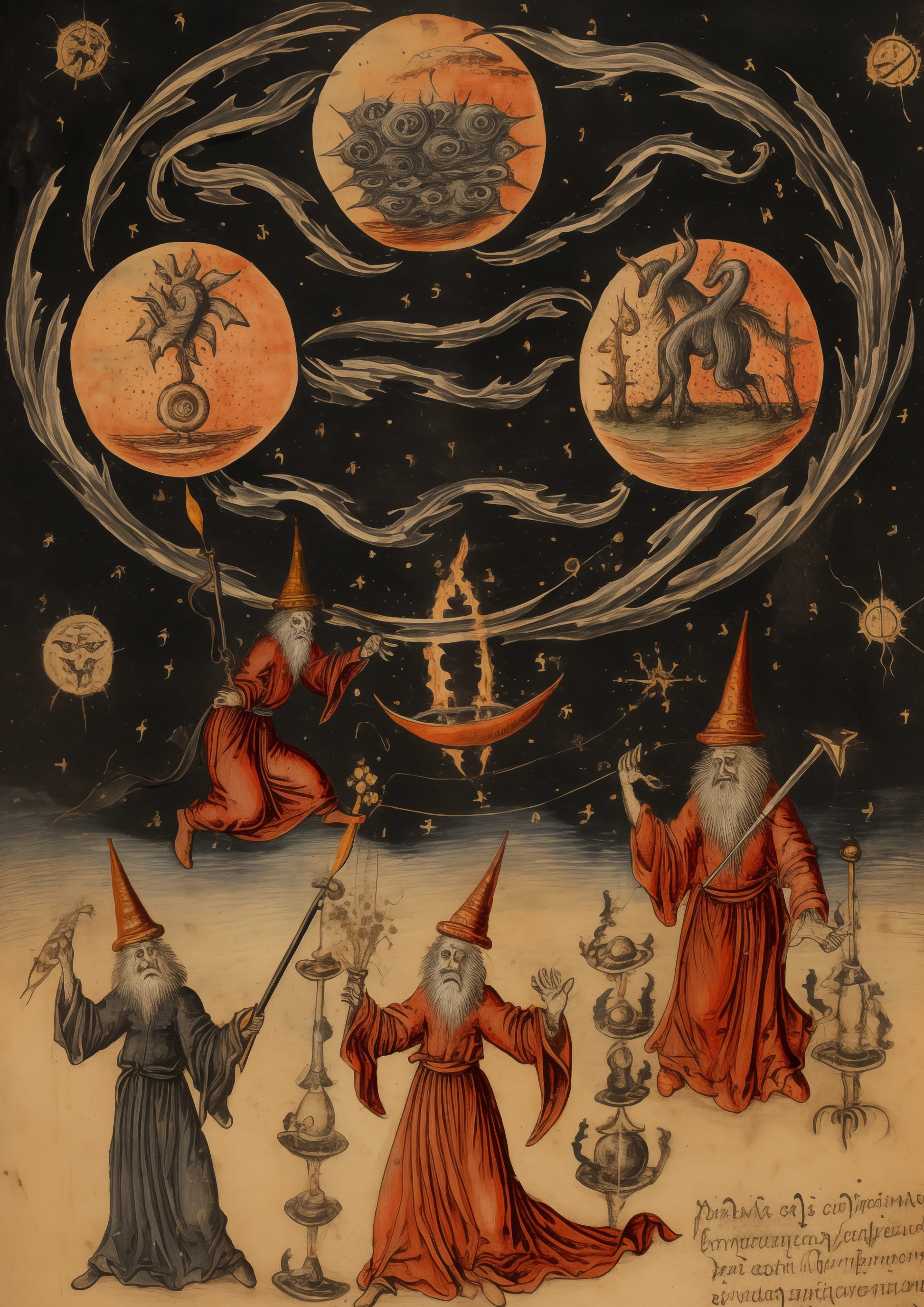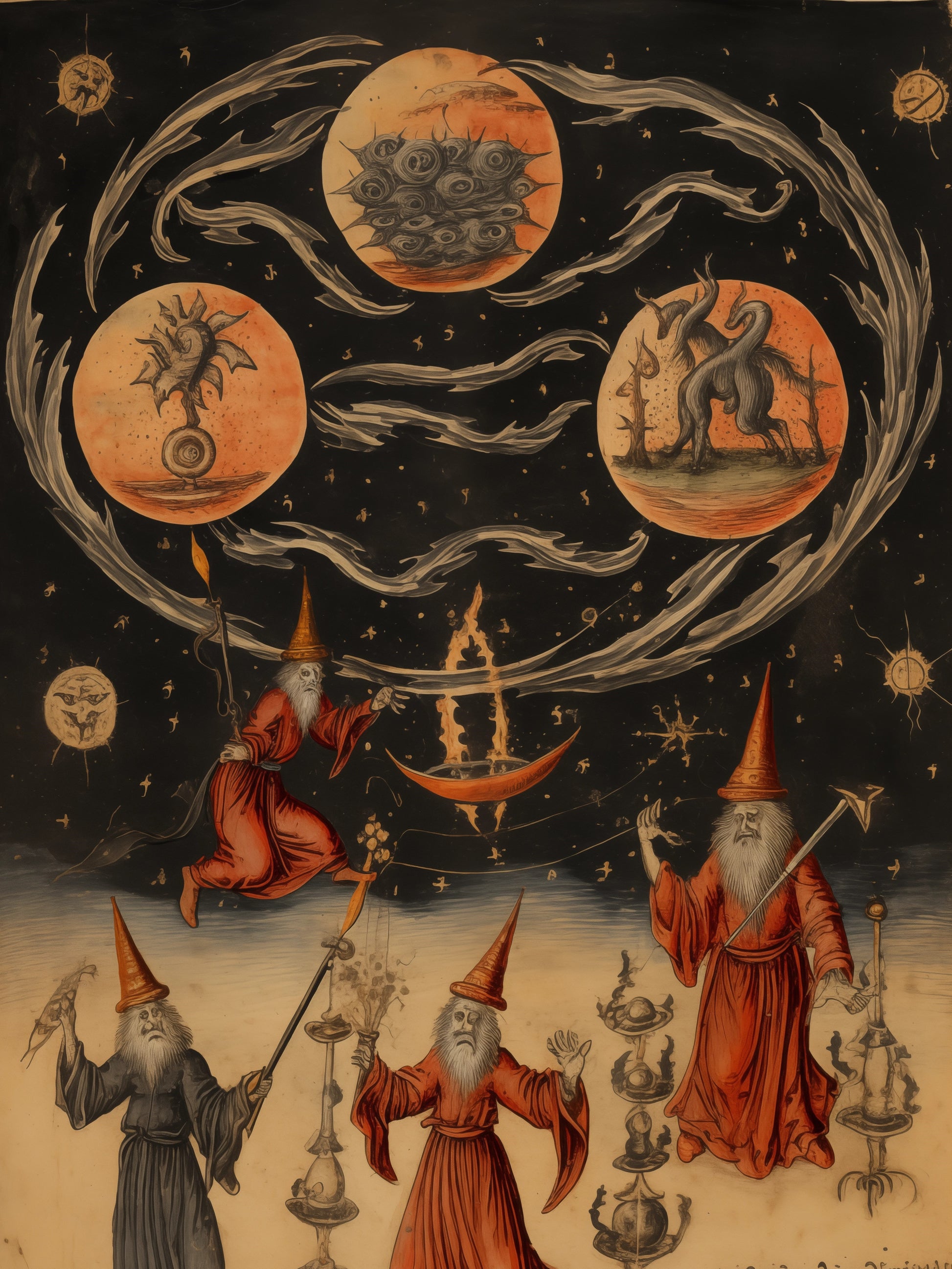 “Evoking Enchantments” captures a mesmerizing scene of multiple wizards casting spells under a bewildering sky, adorned with three significant emblems of their world. The sky dances with ethereal lights, echoing the power and magic coursing through their incantations. Amidst this mystical display, three artifacts stand as testament to the ancient wisdom and deep connections woven into their realm.