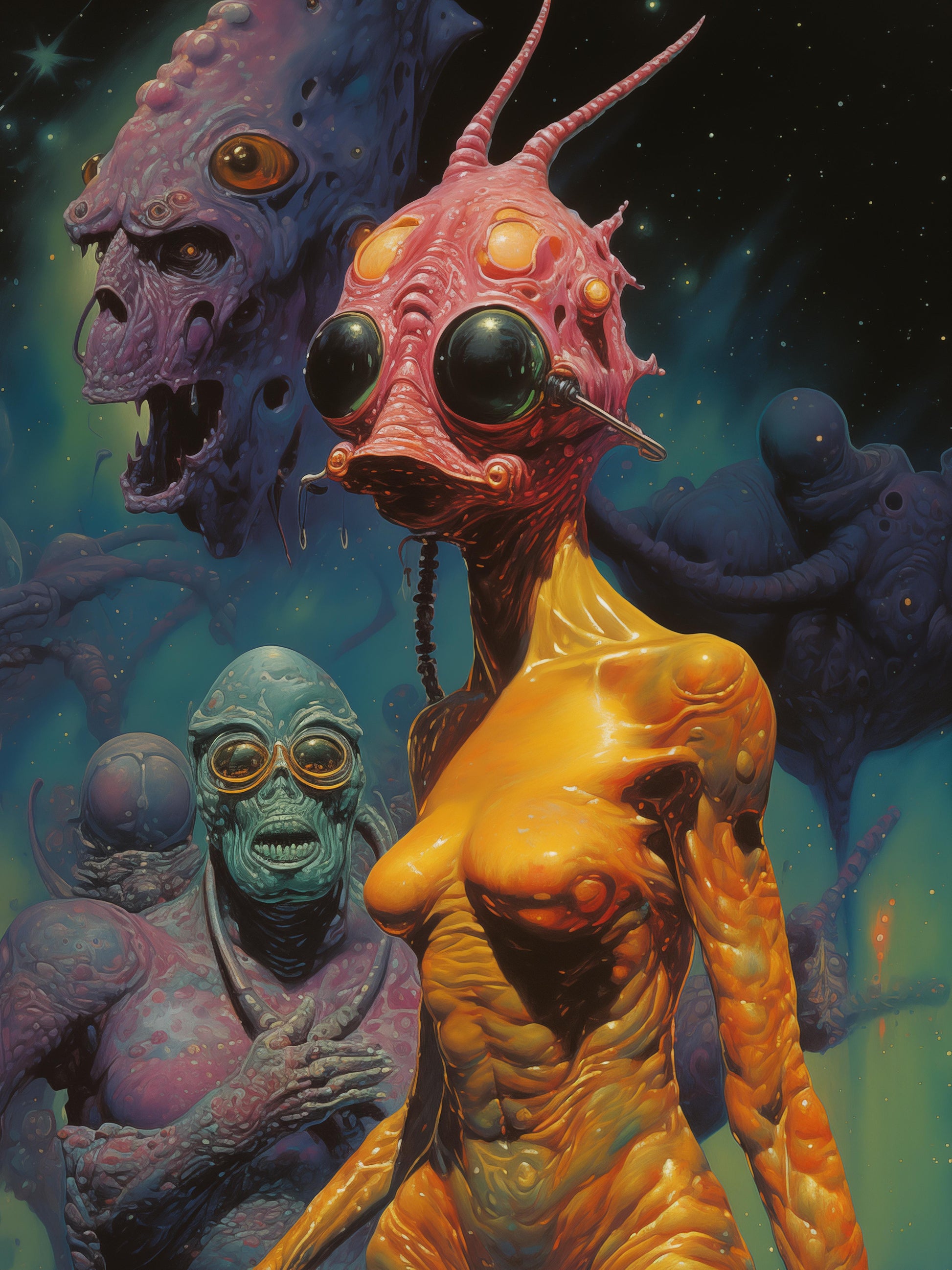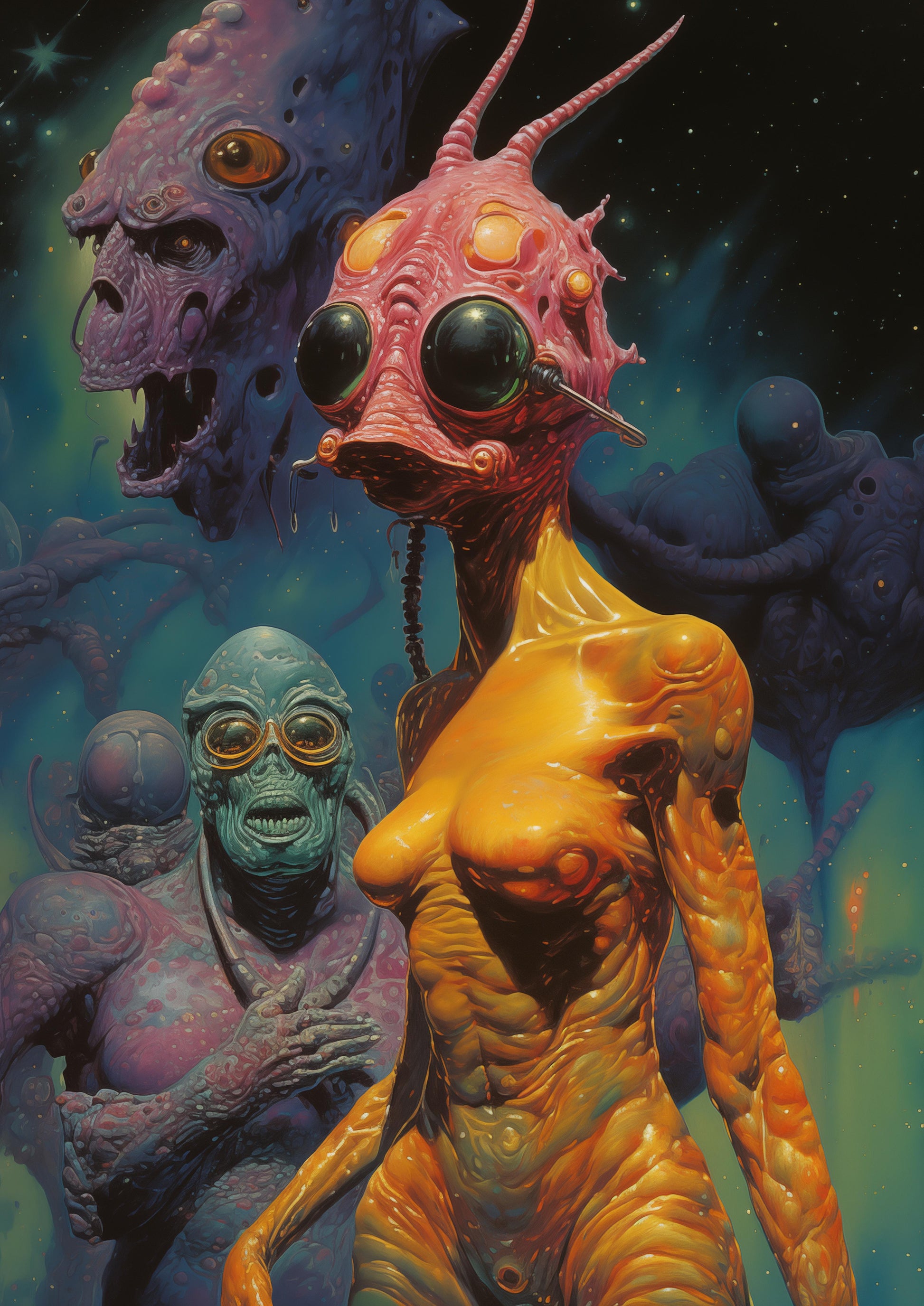 Embark on a cosmic journey with the poster “Extraterrestrial Ensemble“, which is part of the collection Celestial Oddities, inspired by extraterrestrial wonders. Explore bizarre landscapes, encounter unique aliens, and witness futuristic scenes that blend seamlessly with the cosmos. Each poster captures the essence of cosmic exploration, portraying otherworldly scenery and the enigmatic beauty of extraterrestrial realms.