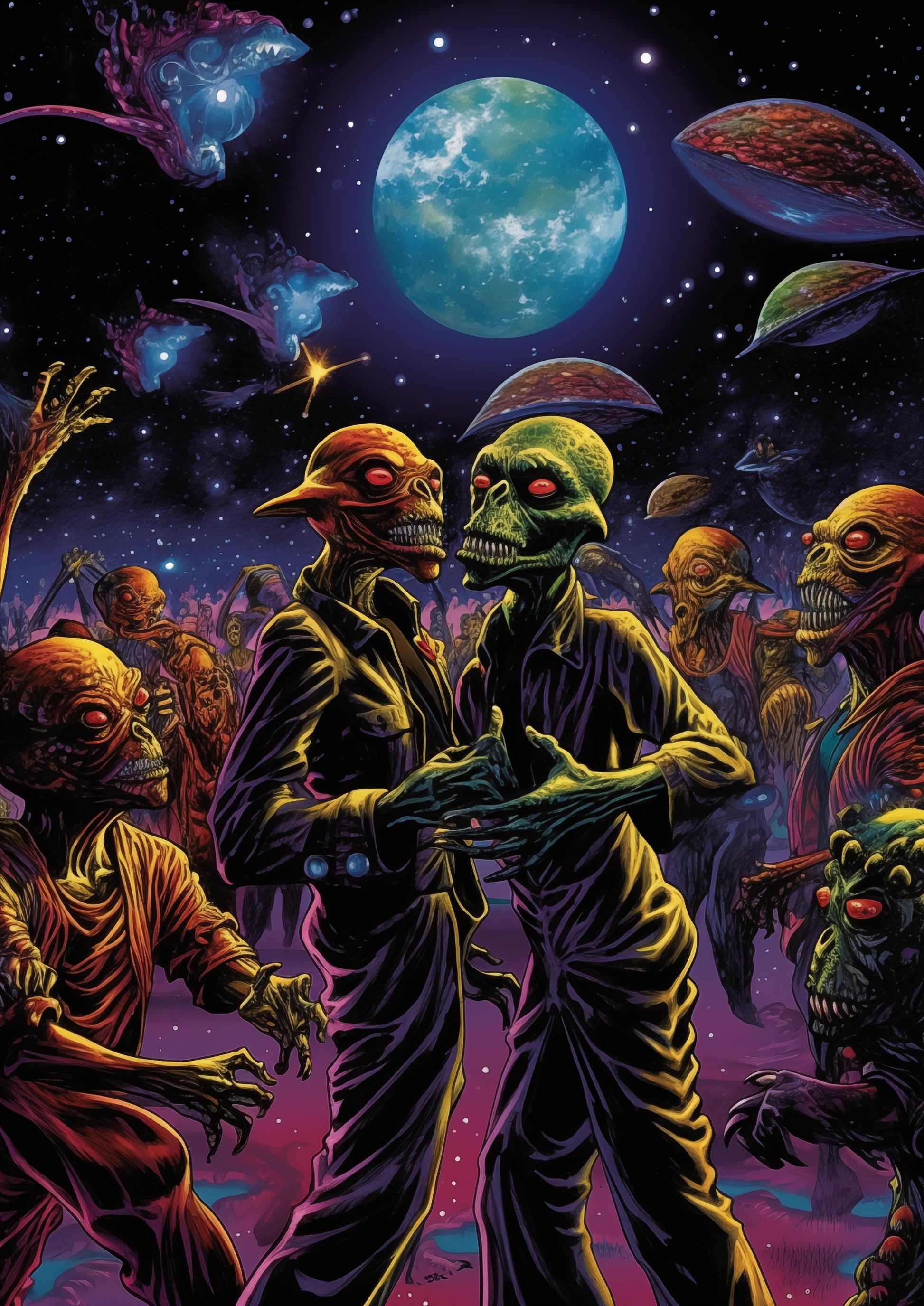 Embark on a cosmic journey with the poster “Extraterrestrial Waltz“, which is part of the collection Celestial Oddities, inspired by extraterrestrial wonders. Explore bizarre landscapes, encounter unique aliens, and witness futuristic scenes that blend seamlessly with the cosmos. Each poster captures the essence of cosmic exploration, portraying otherworldly scenery and the enigmatic beauty of extraterrestrial realms.