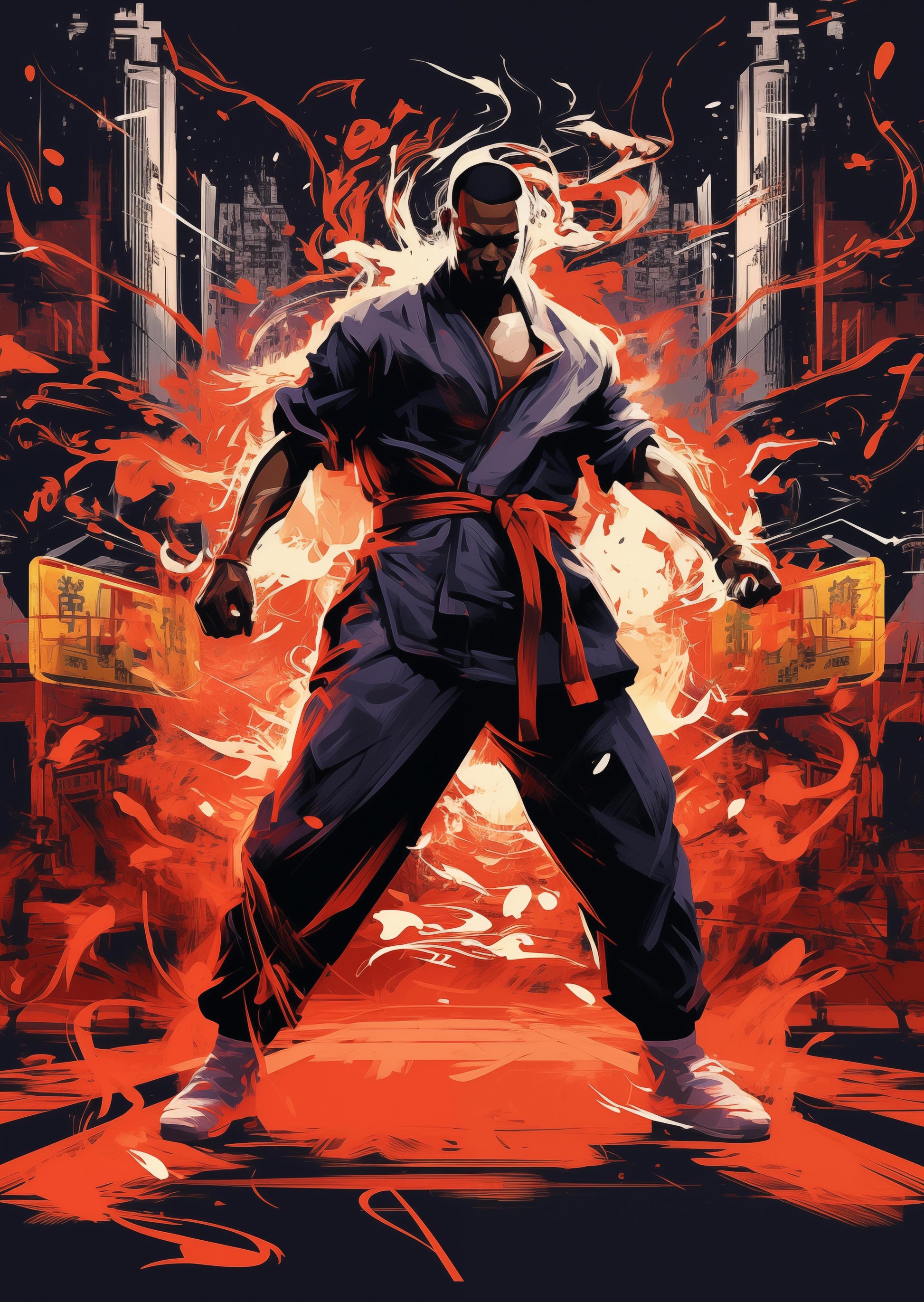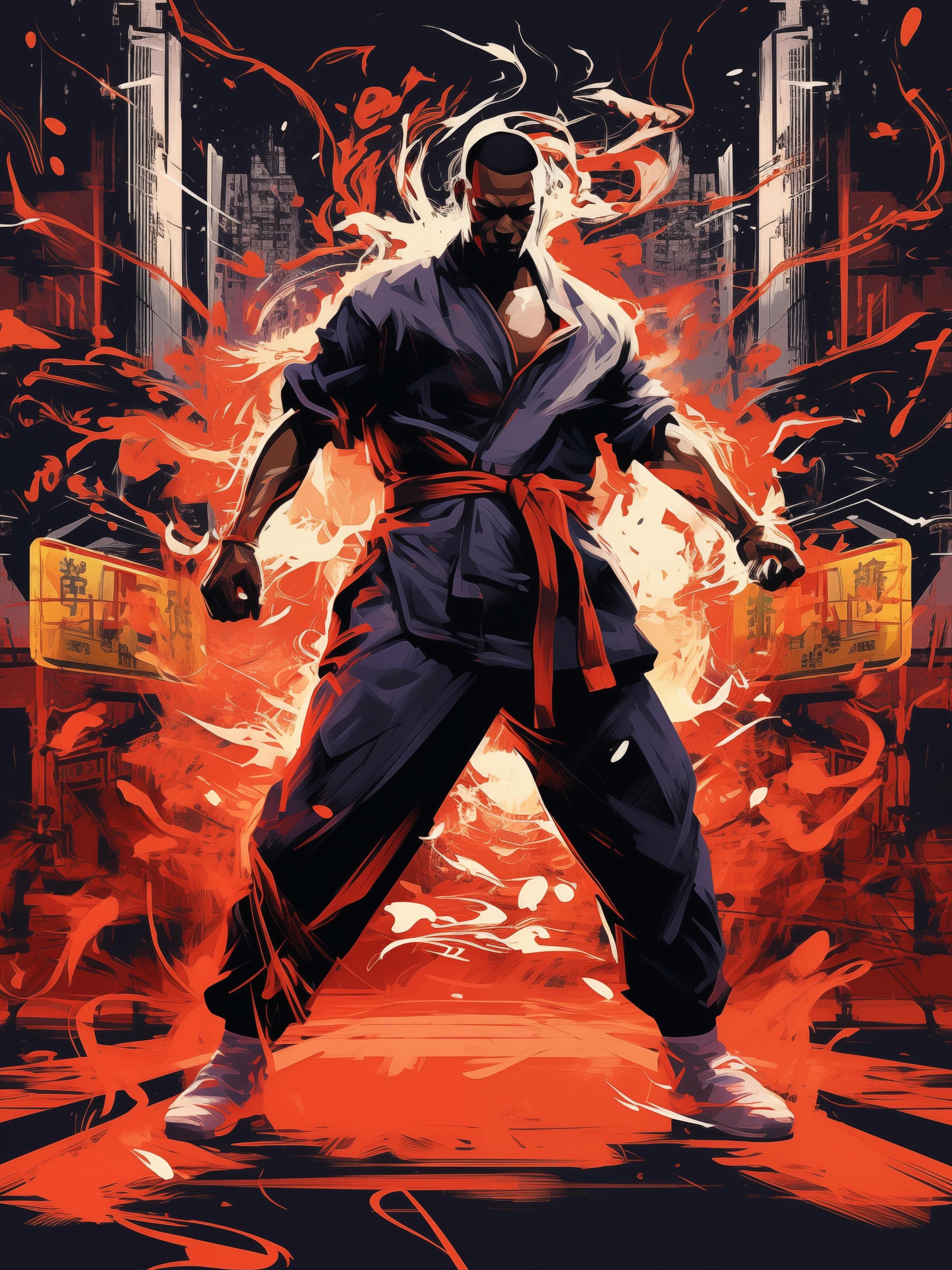 The scene is alive with energy as a powerful figure stands in the center of a sprawling city. Lithe muscles ripple underneath his karate gi. He clenches his fists, ready to strike. Around him, an aura of fierce determination ignites like fire, painting the sky with shades of bold defiance. This is no ordinary moment; it's a snapshot of skill and focus, where countless hours of training meet the split-second timing of combat. The city watches, holding its breath, as this athlete channels his spirit, preparing to unleash a whirlwind of power. The air crackles with anticipation—the next move will be a spectacle of strength and speed.