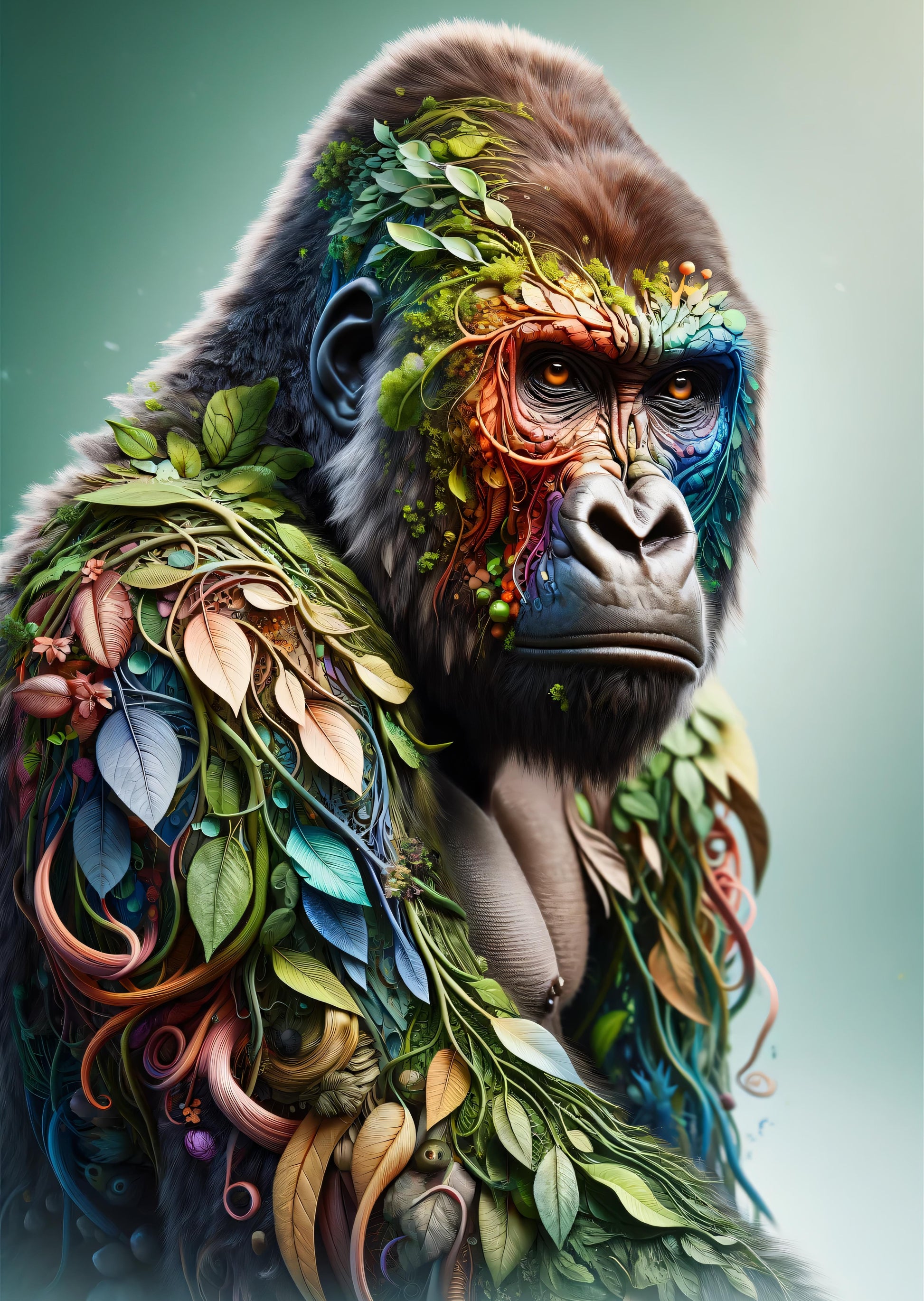 In a world where nature and creatures coexist, a special gorilla becomes a living canvas where life blooms. His thoughtful gaze tells a tale of deep connection between wildlife and the rich tapestry of flora that sustains it. Leaves and flowers grow from him, a symbol of unity and the precious cycle that binds all living things. This image reminds us of the delicate balance between animals and their habitats and the need for mutual care and respect. The gorilla, wise and pensive, wears the beauty of nature, urging us to cherish and protect the interwoven threads of life on Earth.