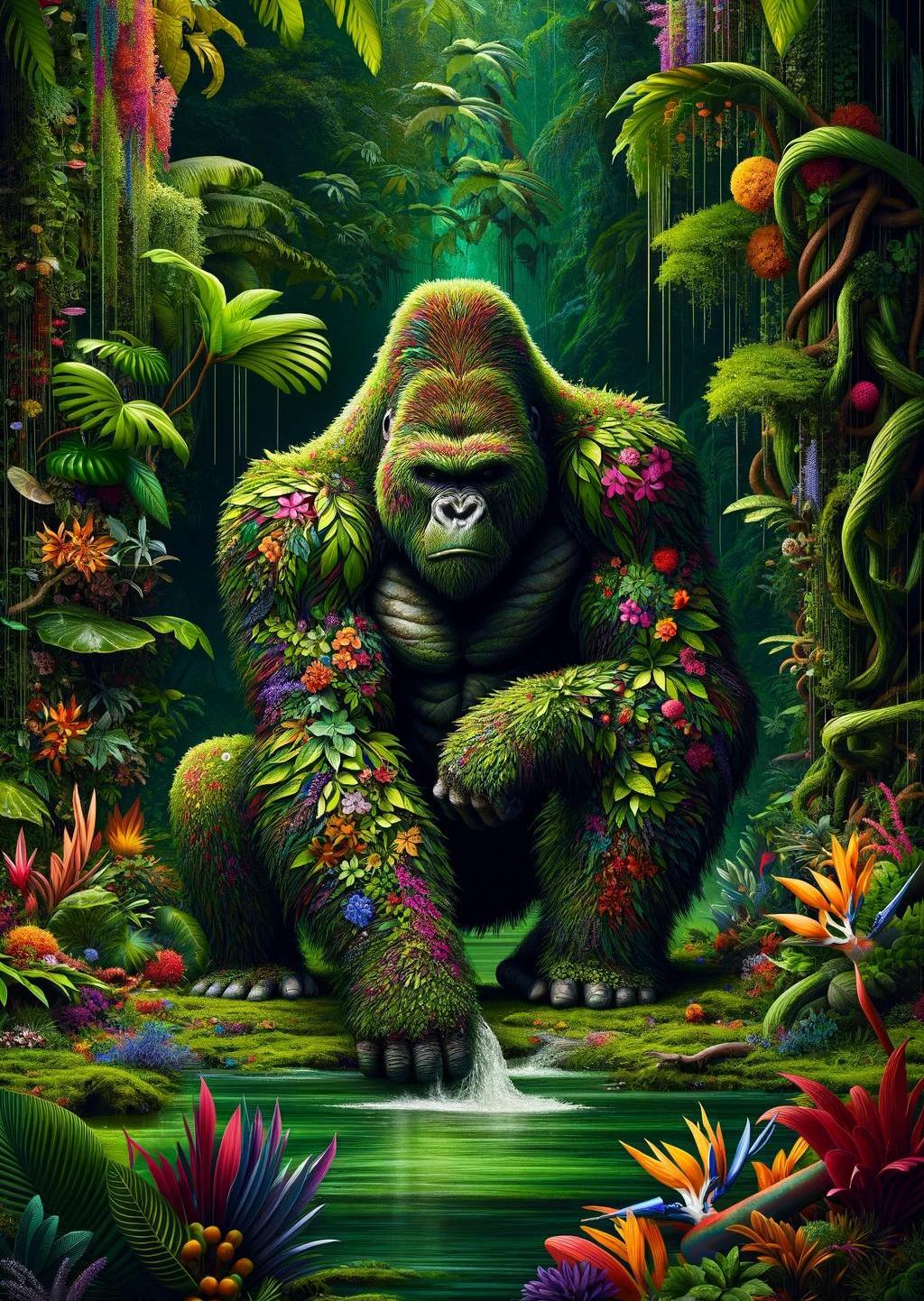 In a lush jungle, a great gorilla, cloaked in a vibrant tapestry of plants and flowers, stands as a guardian of nature. His steady gaze reflects a deep connection with the forest; his being, a living mosaic of the ecosystem he holds dear. This image tells a story of unity and care, where every leaf and petal is part of a greater whole. The gorilla, powerful yet gentle, symbolizes respect for the world around us and the delicate balance we must maintain. Through his colorful embrace, we see that each creature, no matter how big or small, plays a vital role in the health of our planet.