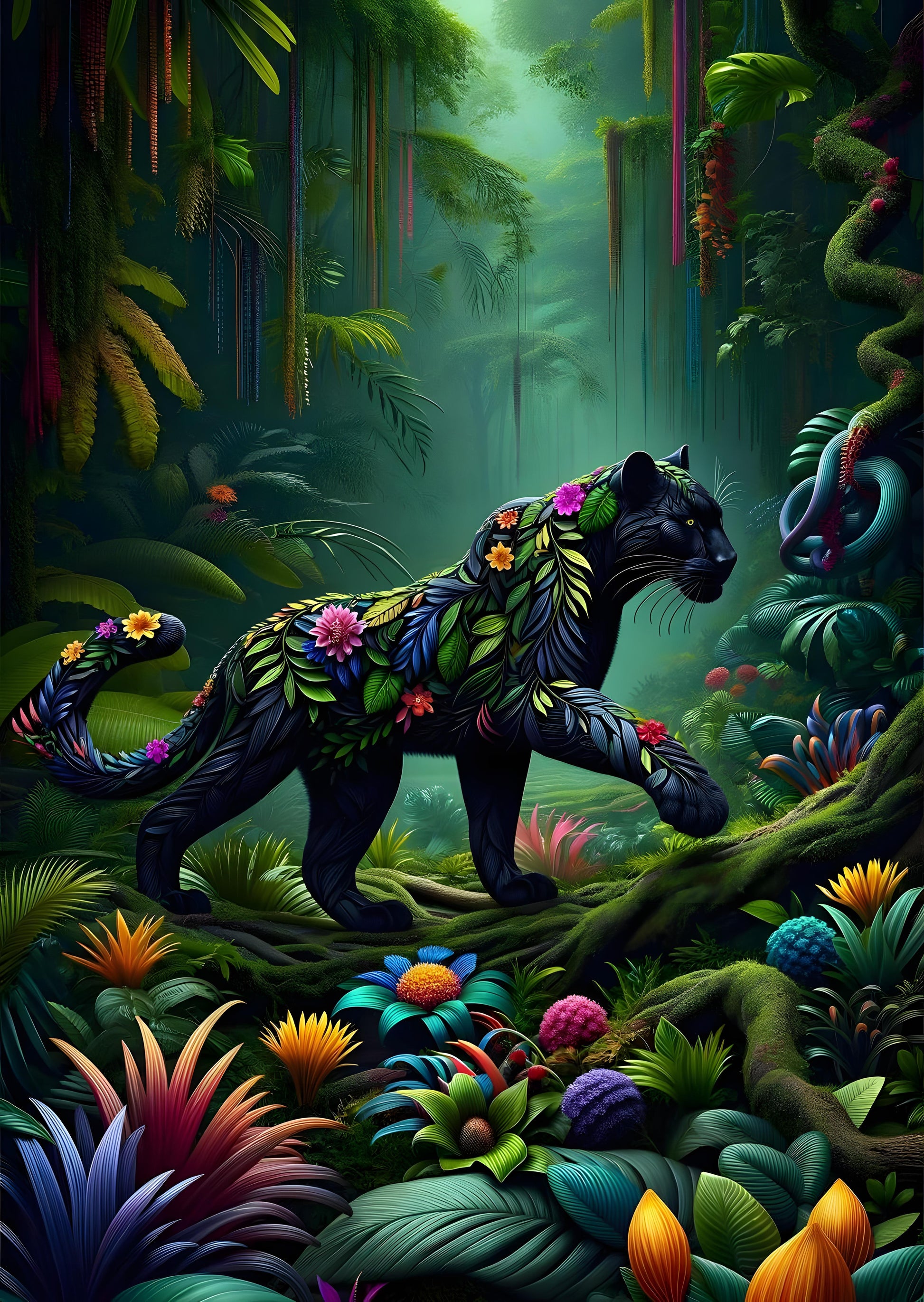 In a lush jungle, a panther adorned with vibrant flowers roams, symbolizing the unity of life. The creature, both strong and gentle, moves gracefully among the trees, its body a living garden reflecting the surrounding splendor. Each petal and leaf upon its back carries the story of the forest, whispering a message of coexistence and respect. The plants and animals share a deep bond, painting a picture of abundance where every life form contributes to the whole. This image tells a tale of interconnectedness, reminding us that beauty arises from the balance between the wild and the delicate, the bold and the bright.
