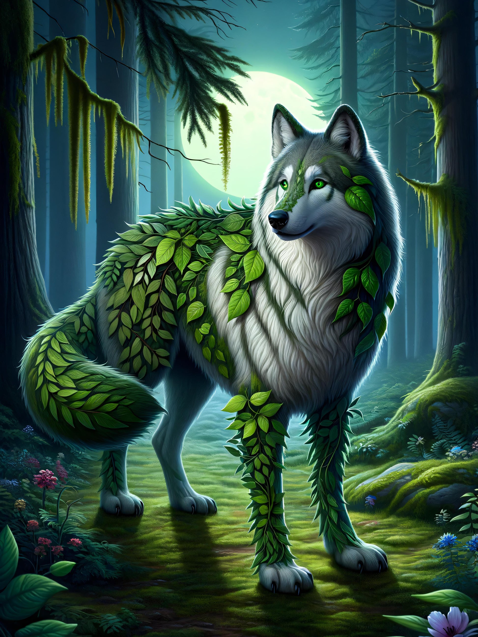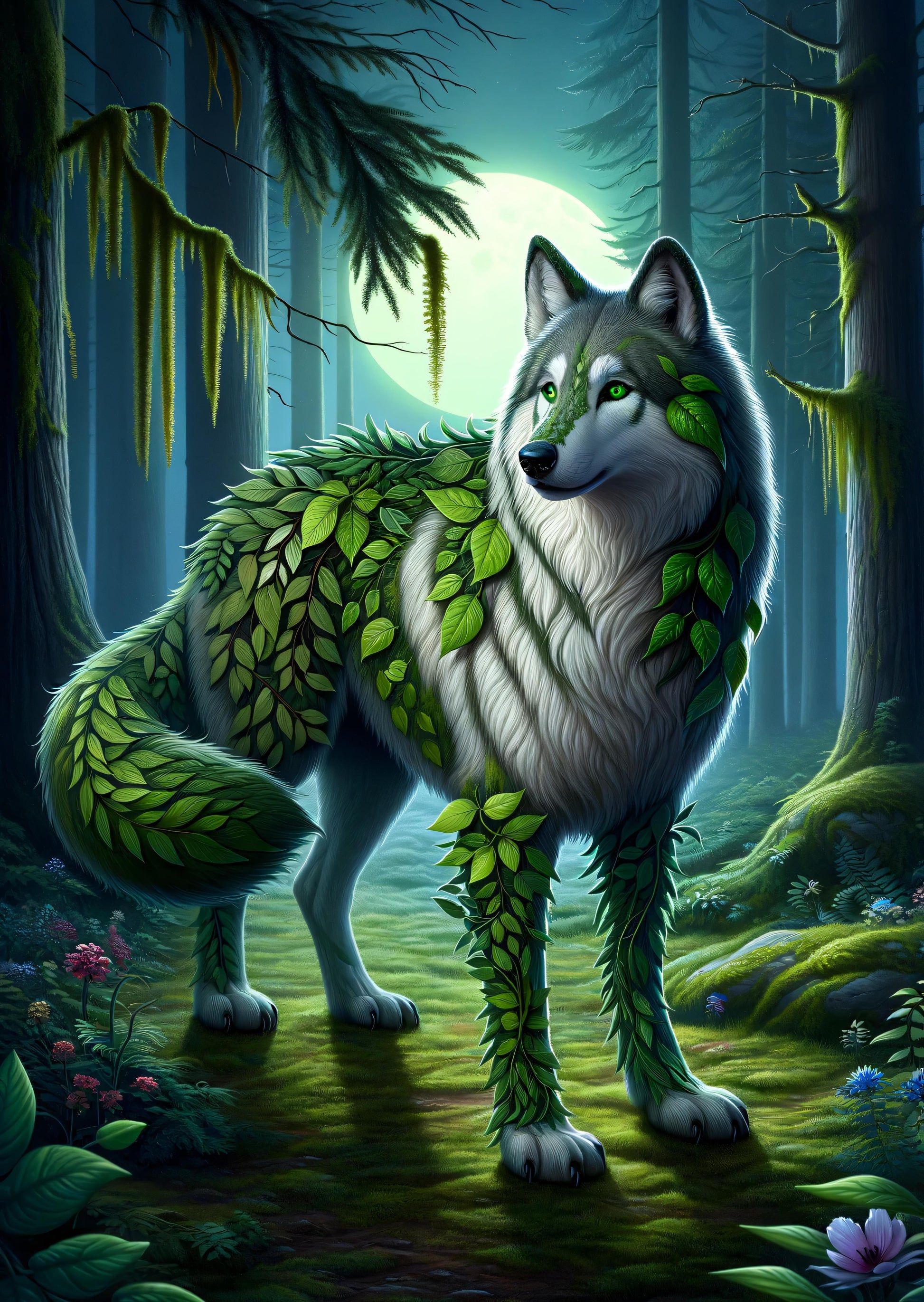 In a lush green forest, a unique wolf roamed with leaves sprouting from its fur. This creature symbolized the deep bond between life and the land. It walked with care, knowing its role as a guardian of nature's delicate balance. Each step was a gentle reminder of our connection to the earth and the responsibility to protect it. The wolf's presence was a powerful lesson that life thrives when we respect and nurture our environment.