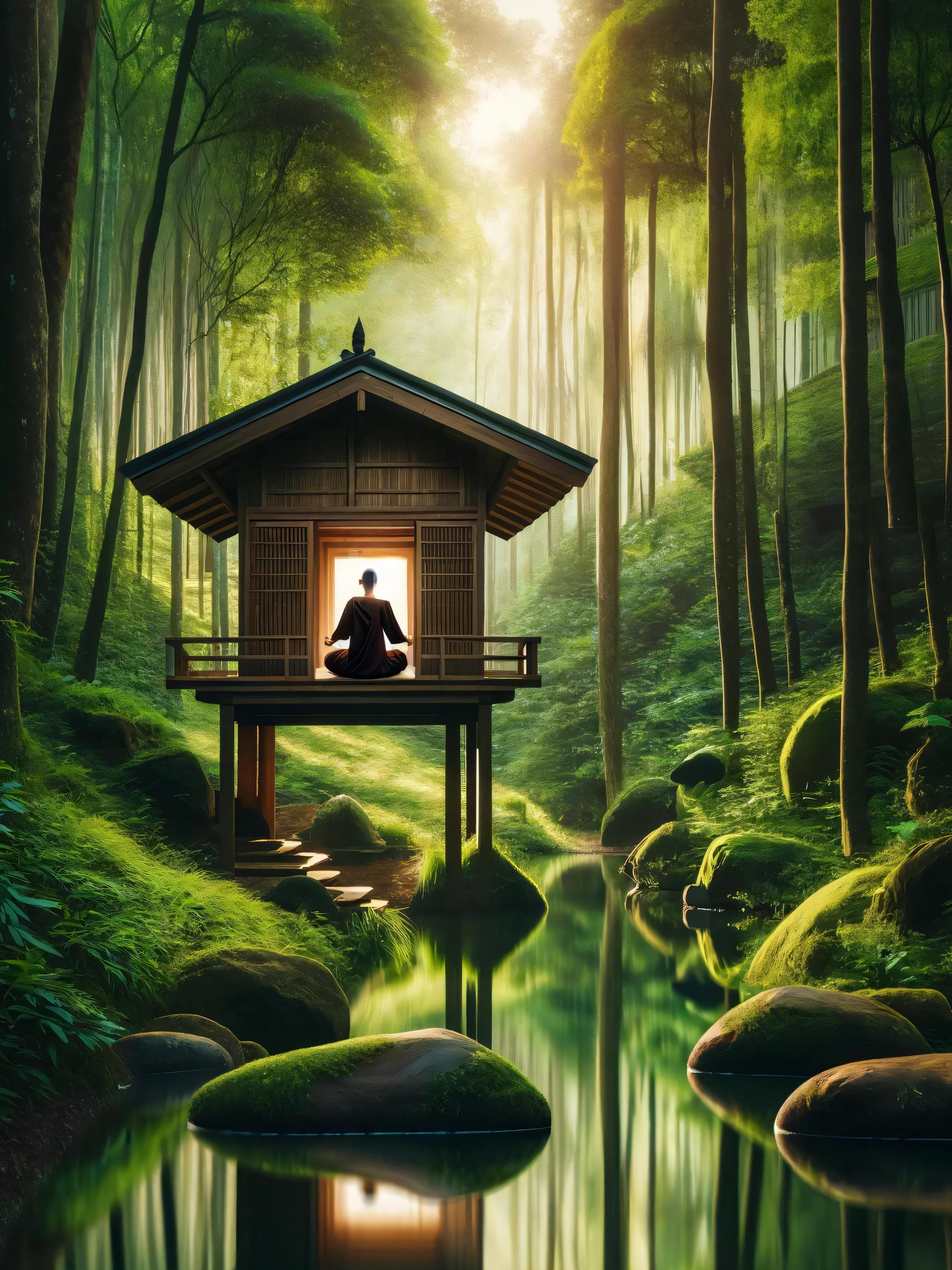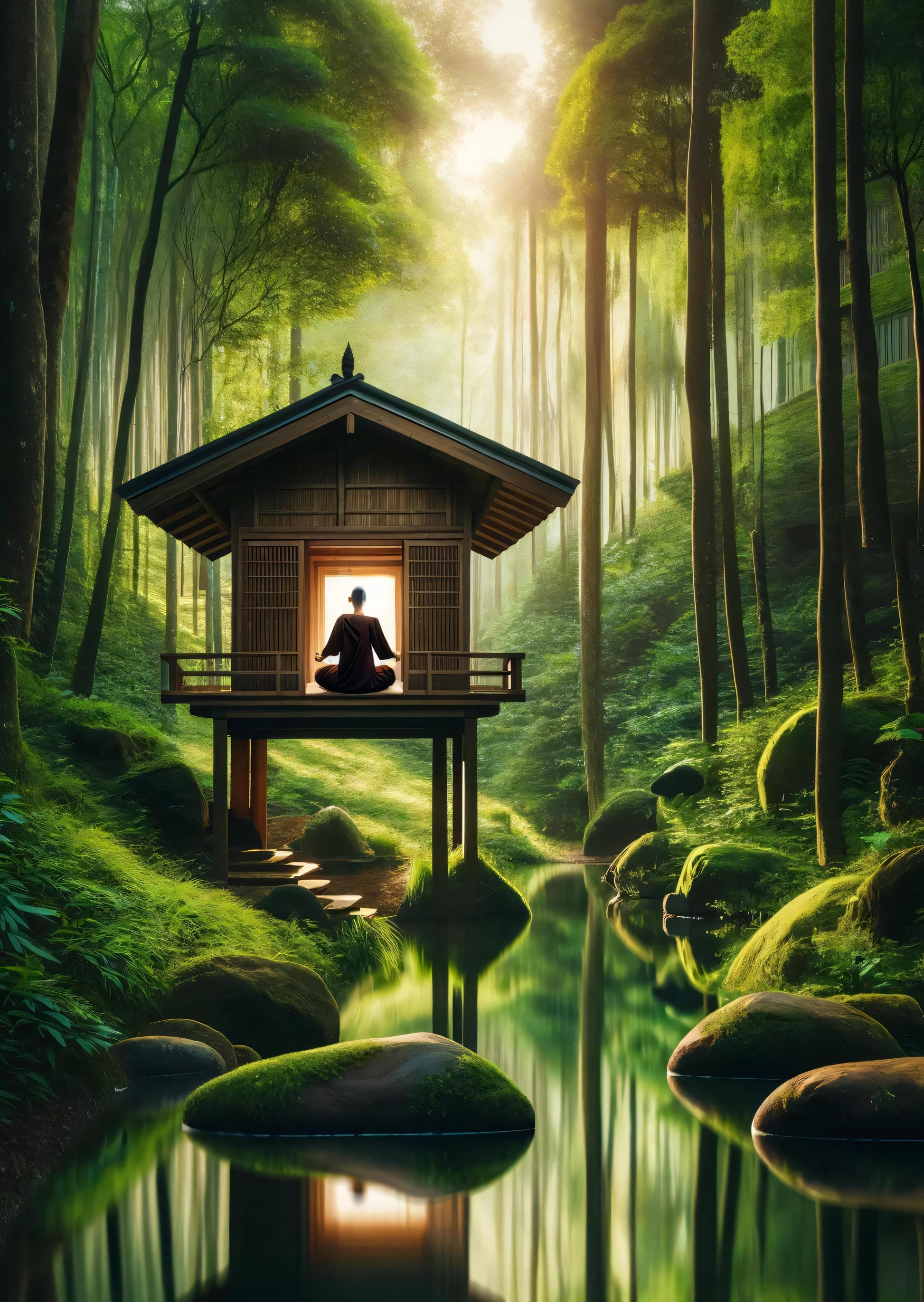 In a mystical forest, where light dances through the leaves, a person sits in quiet reflection. This small shelter stands over a still pond, a bridge to inner peace. Surrounded by towering trees, the lone figure embraces a moment apart from the noise of daily life. Here, the vital things come into focus: nature's gentle embrace, the soothing murmur of water, and the clarity found in stillness. A story unwinds where each breath is a reminder of life's beauty beyond the hustle. Such places remind us that amidst life's rush, pausing to absorb the world's simple wonders is where truth often whispers its deepest lessons.