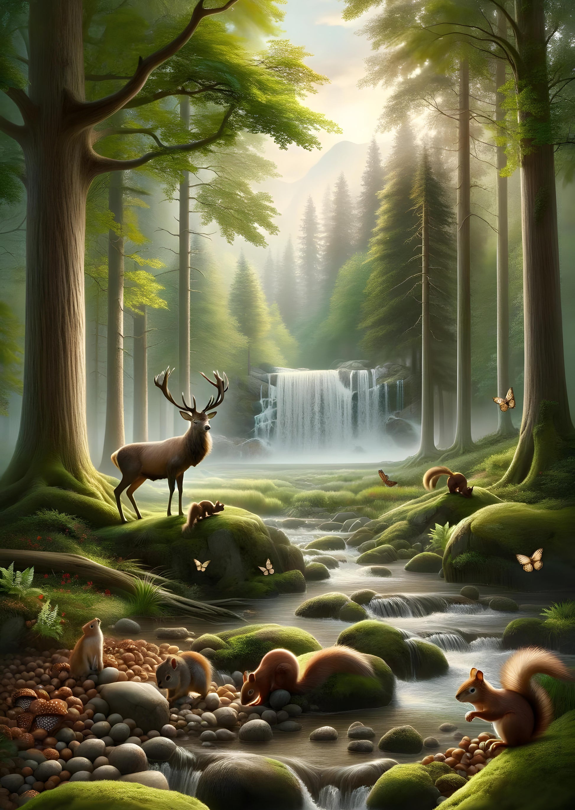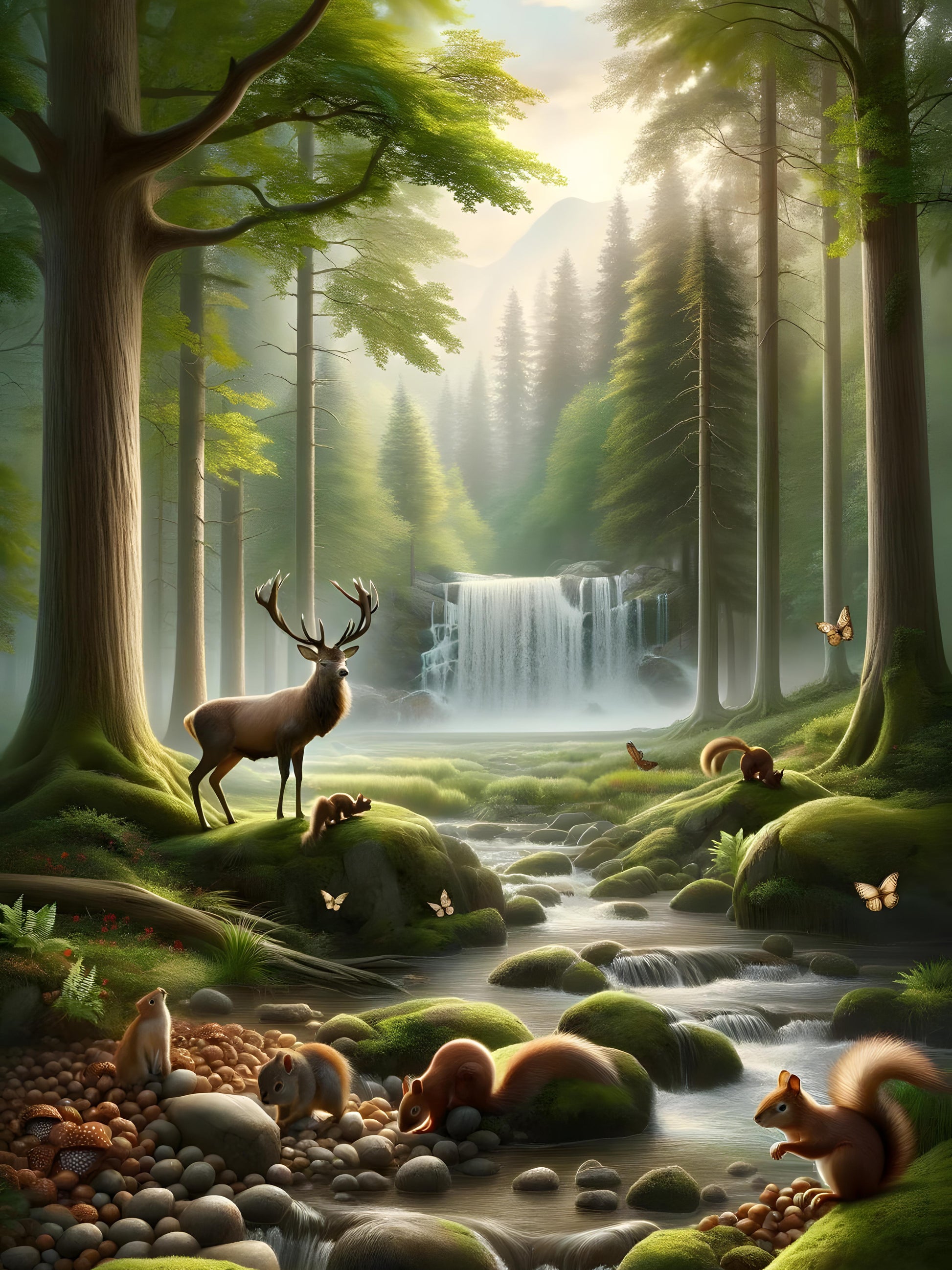 In a lush forest, sunlight filters through the canopy, casting a warm glow on the flora and fauna. A regal stag stands atop a mossy knoll, a sentinel overlooking this peaceful realm. Not far off, water cascades with a soothing murmur, feeding a babbling brook that winds gently through the scene. Playful squirrels frolic among the rocks, a tableau of life in unspoiled nature. The air is fresh, charged with the vitality of the wilderness, inviting any onlooker to pause and indulge in the beauty of this verdant sanctuary.
