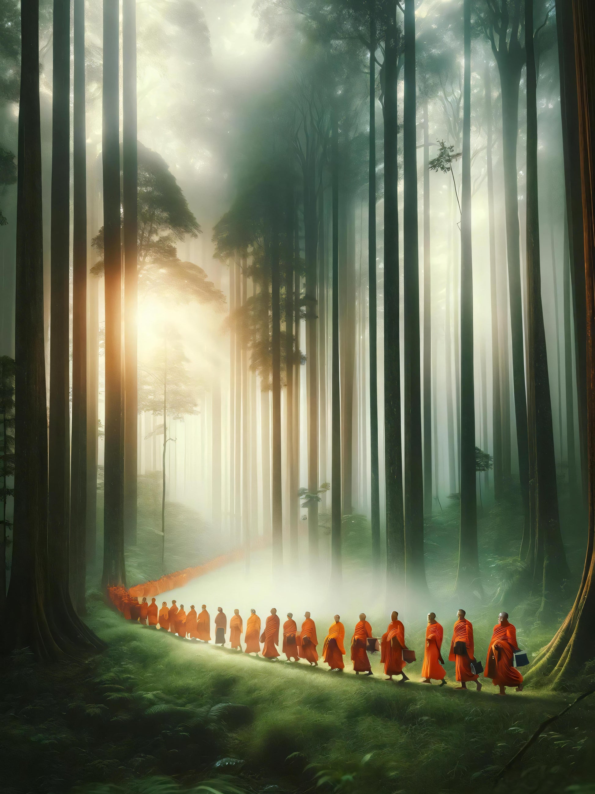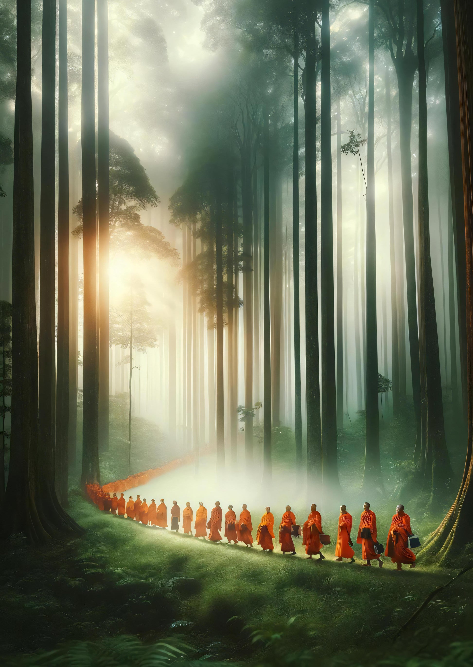 A procession of Buddhist monks draped in vibrant orange robes advances through a mist-laden forest, where towering trees reach towards the heavens. Rays of the sun break the canopy, bathing the path in a gentle, warm light. These seekers walk in quiet contemplation, surrounded by the untouched beauty of nature, embodying the principles of mindfulness and presence. This evocative scene captures a moment of profound peace and introspection, inviting the observer to reflect on the intertwined dance of light, shadow, and spiritual pursuit within the natural world.