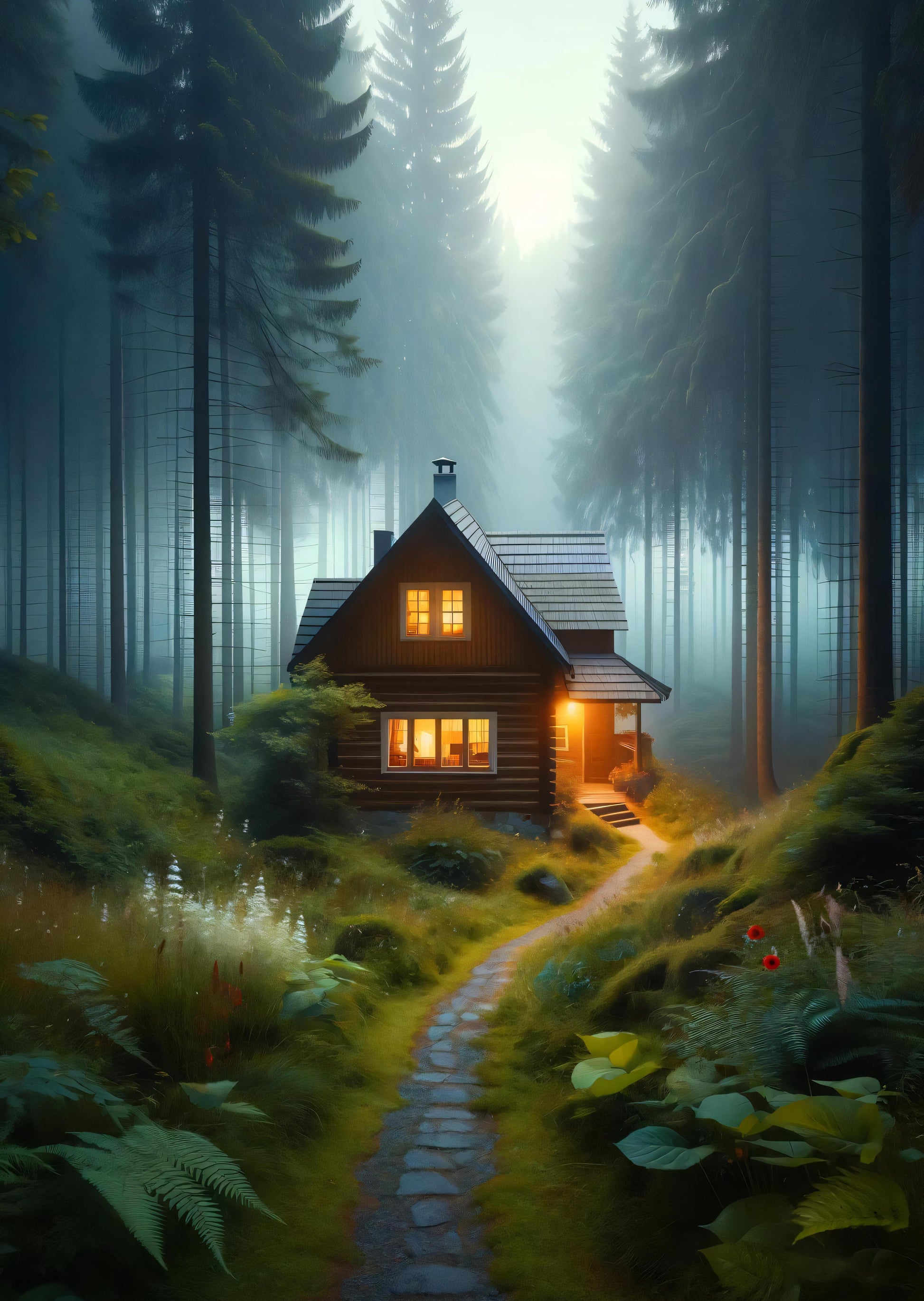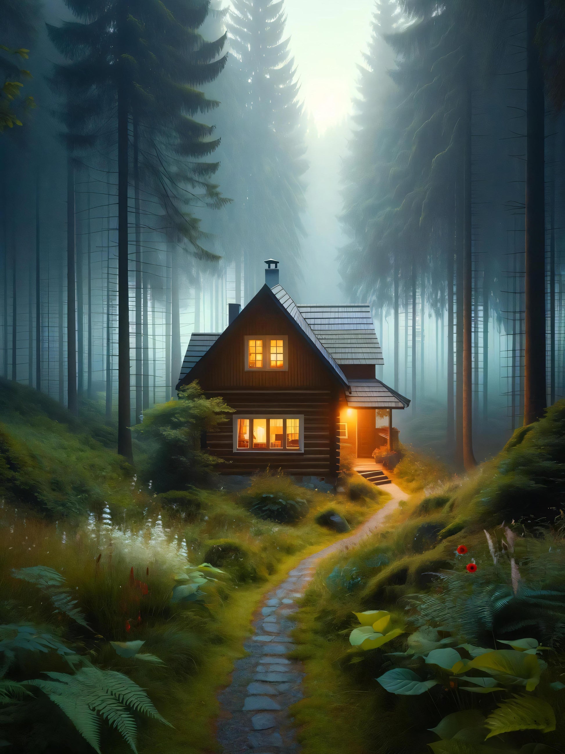 In a misty forest, a cozy house stands as a beacon of warmth. The sun, a soft glow behind lofty trees, bathes the scene in a gentle light. A winding path invites travelers to respite, suggesting the value of a journey’s pause. Lush greenery, embracing the abode, tells of nature's gentle hug. Here, in simplicity, lies an unspoken truth: the essence of home is not grandeur, but the light of familiarity and the embrace of a safe haven amid the vast unknown.