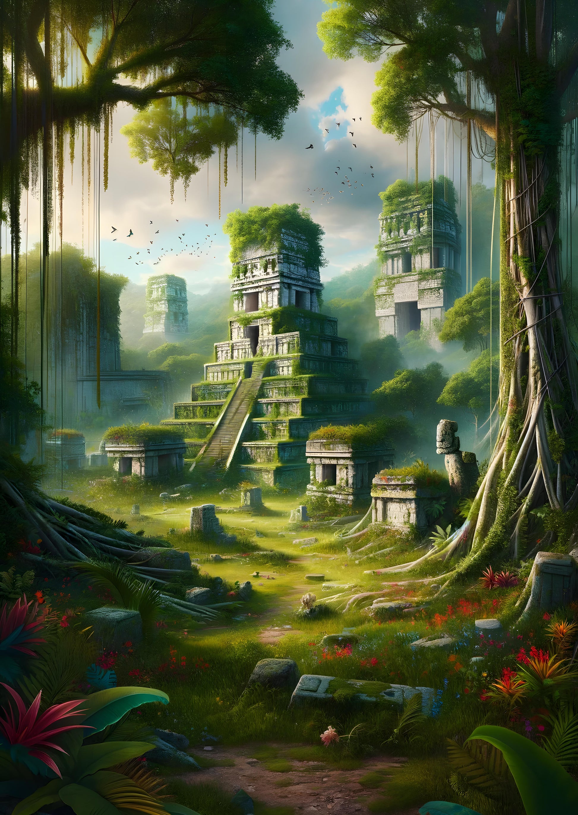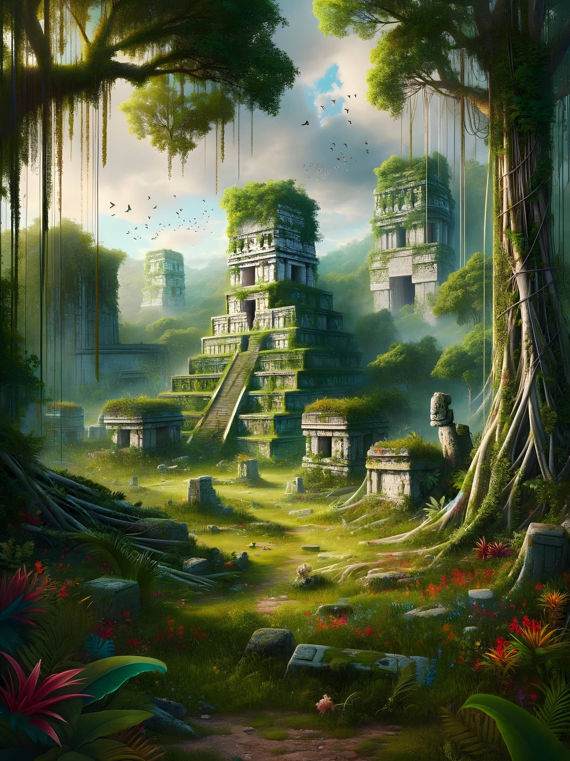In the heart of an ancient forest, a forgotten civilization's remnants rise majestically. Towering stone structures, reclaimed by vines and lush greenery, hint at a once-flourishing culture. Sunrays pierce through the canopy, illuminating the mist that clings to the ruins like a gentle caress from history. Flocks of birds take flight, adding a dynamic pulse to the scene. Below, the remnants of pathways and columns are embraced by vibrant flora, which bursts with color against the grey stones. Nature's gentle reclaiming of human architecture tells a timeless story of life's persistence and the circle of growth and decay. The beauty of the scene invites one to contemplate the countless untold tales that these structures once bore witness to.