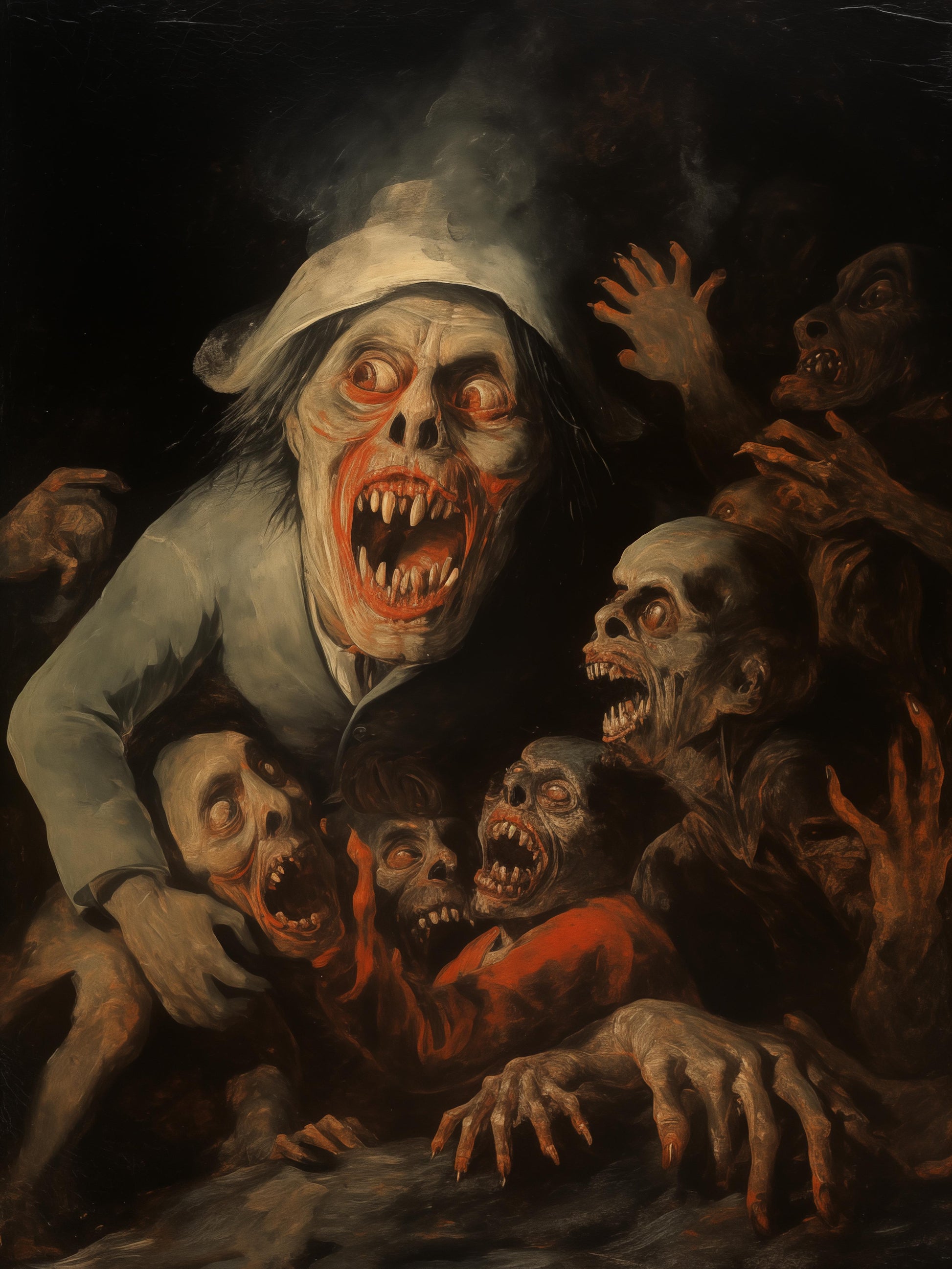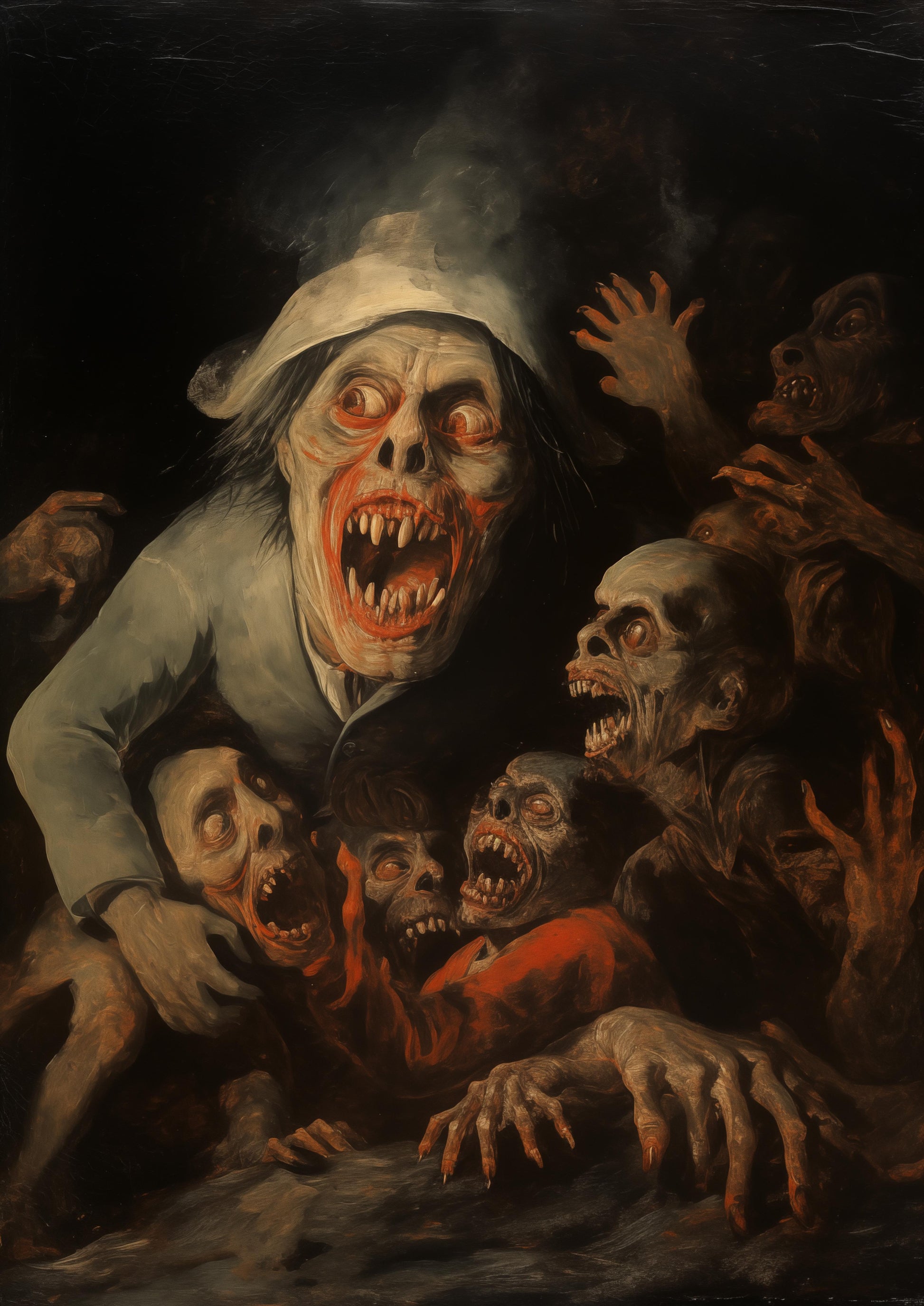 In a dim and ominous realm, a ghoulish assembly emerges from the shadows. At the forefront, a pale creature with wild eyes and an open maw exudes horror, as it appears to scream into the void. The entities surrounding it are equally terrifying, with gaunt faces and expressions twisted in terror. Their haunting appearance and outstretched limbs suggest a desperate clamor for something beyond their reach. The dark backdrop enhances the foreboding atmosphere, emphasizing the figures as they seem to exist outside the bounds of the earthly plane. This unsettling tableau captures a moment of intense fright, frozen in time, leaving an indelible mark on the observer's psyche.