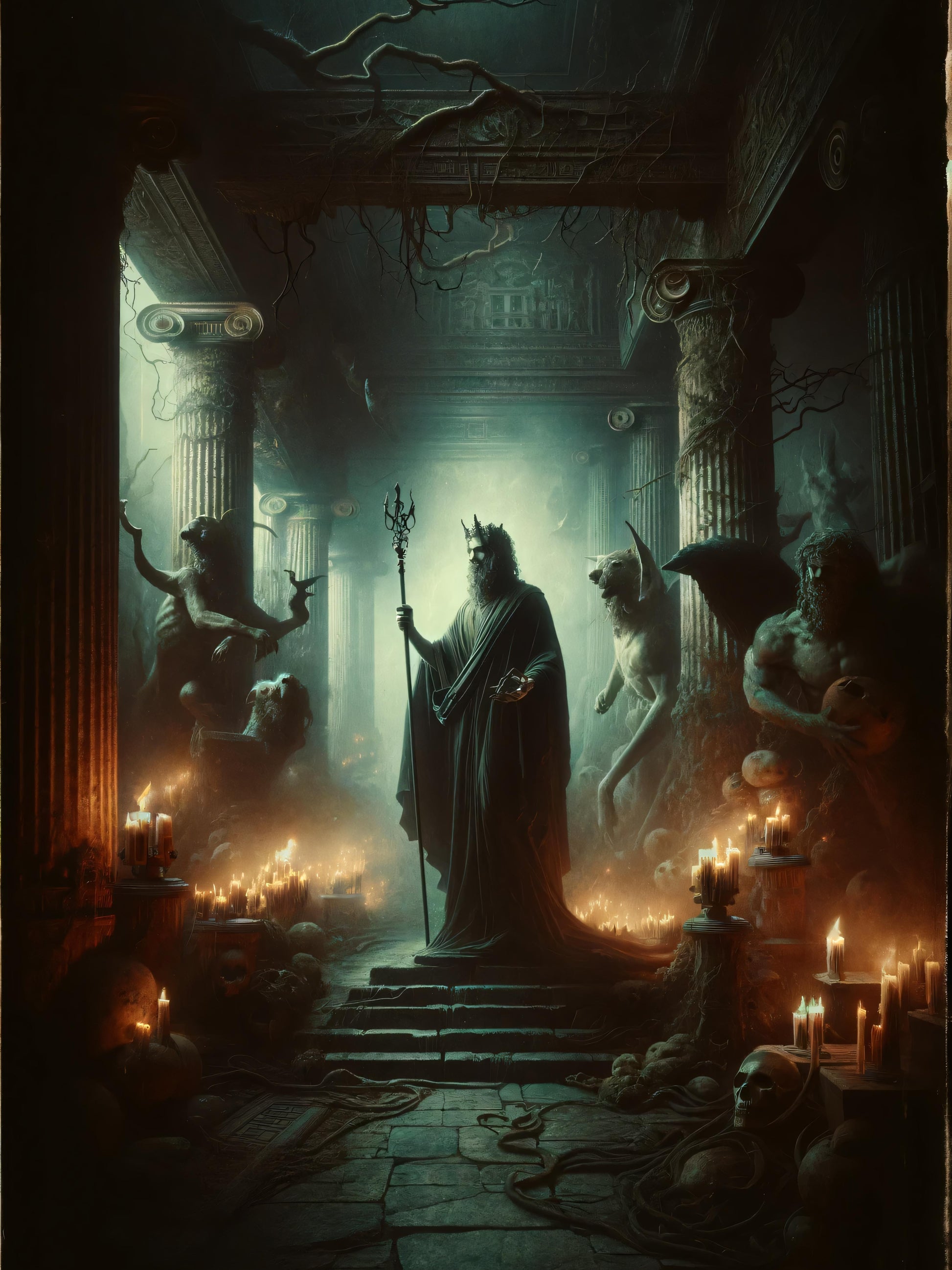 Behold the majestic yet foreboding realm of Hades, god of the underworld and the dead In the shadowed depths of his eerie dominion, Hades stands cloaked in darkness, wielding his powerful bident A realm where whispered secrets echo through the ancient ruins, candlelight flickers casting a ghostly glow and serpentine creatures slither among scattered skulls The regal god oversees the silent whispers of souls and the subtle stirrings of spectral beings His figure commands both fear and respect, a deity shrouded in the enigma of eternal night The underworld beckons, offering a glimpse into the kingdom where legends roam and myths breathe Silent guardians flank the pathway, their stony gazes forever watchful Dive into the chilling embrace of mythology and encounter the unseen world beneath our feet.