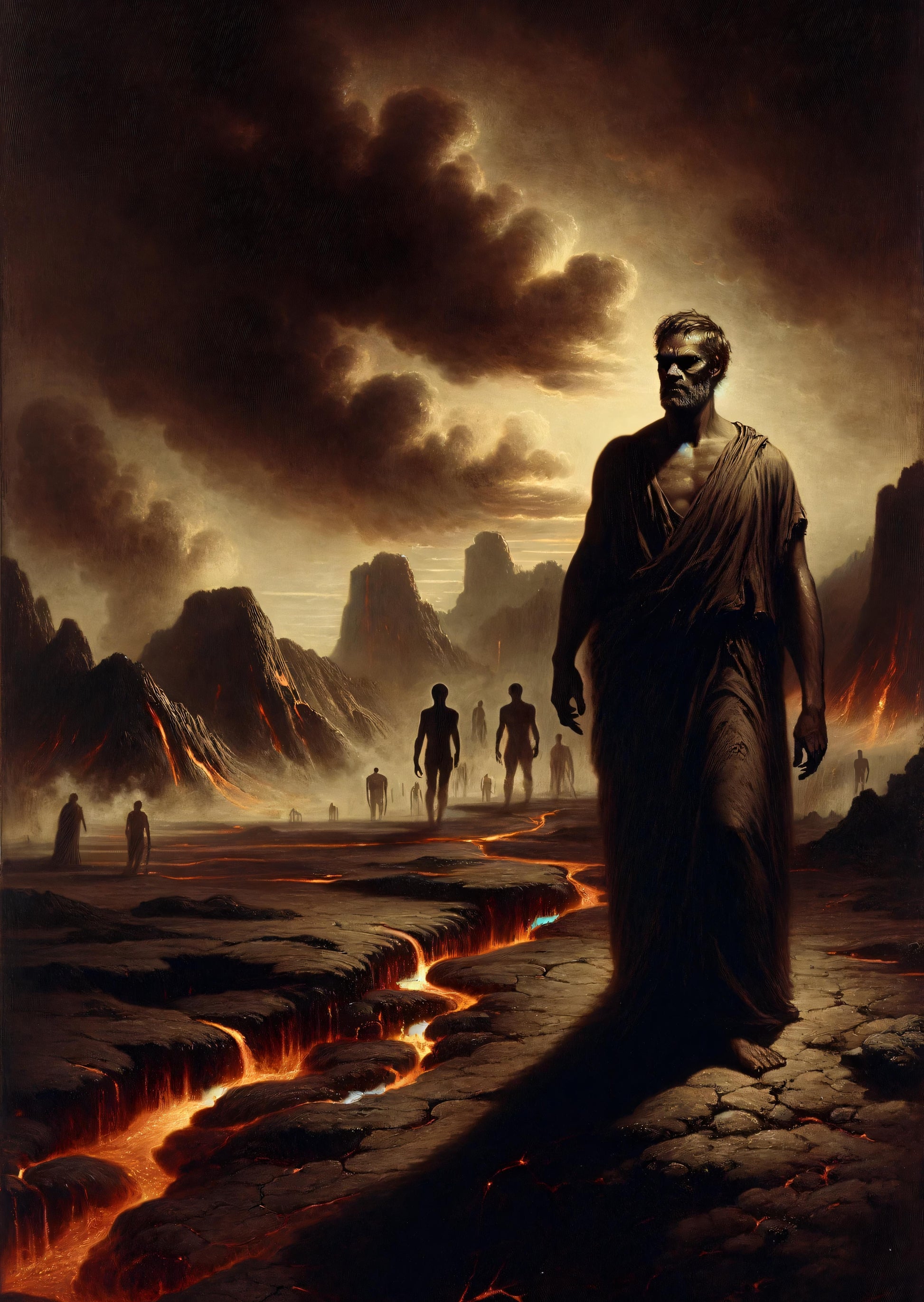 Witness the somber dominion of Hades, the ancient Greek god of the Underworld, as he stands amidst the fiery rivers and infernal landscapes of his eternal realm. Cast in an ominous glow, the stoic deity rules over the souls of the departed as they traverse the bleak, volcanic terrain. Shadows loom large in this kingdom where the sun never rises, and hope is a mere memory. Hades, brother to Zeus and Poseidon, wields absolute power here, in the dark corridors beneath the world of the living. This haunting depiction captures the unyielding might and melancholy of a god seldom seen but always present in the whispers of myths long past.