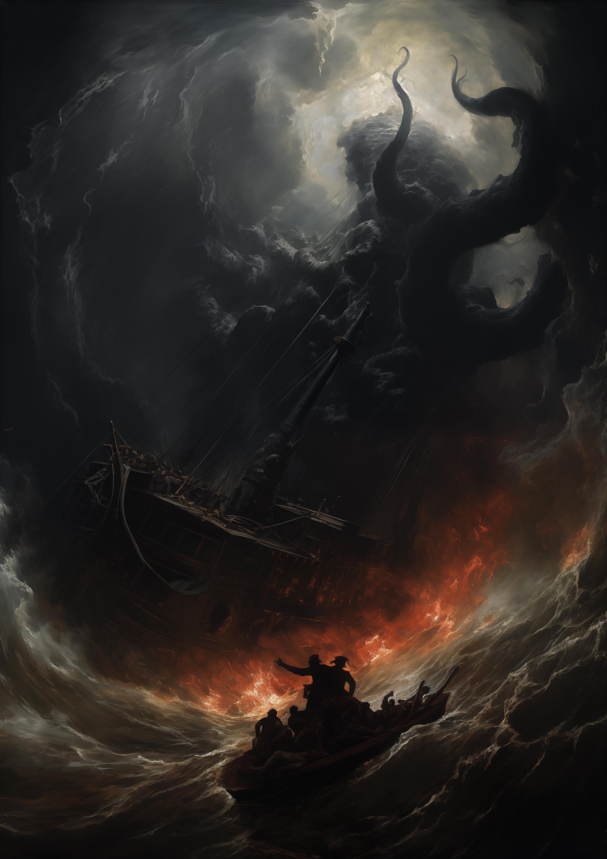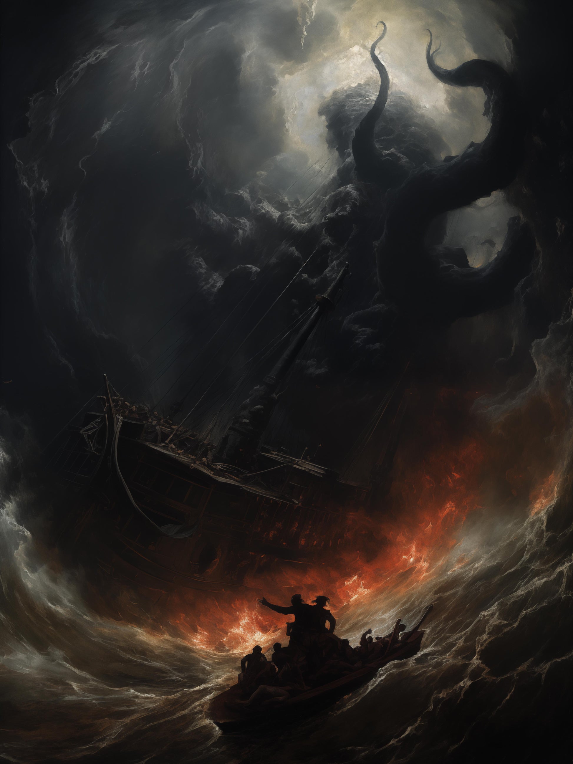 In a realm of churning skies and abyssal oceans, a ship's crew confronts a daunting leviathan, tentacles grasping from the void. As an aperture of light pierces ominous clouds, it casts an otherworldly glow over the seafarers, uniting them against the impending doom. Below, fires of resilience blaze against encroaching despair, casting defiant shadows against a hypnotic maelstrom. This picturesque battle, set upon nature's grand canvas, tells of human audacity in the face of unfathomable foes.