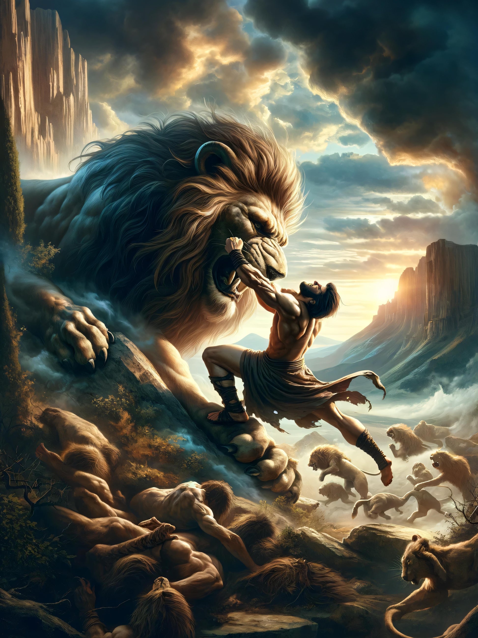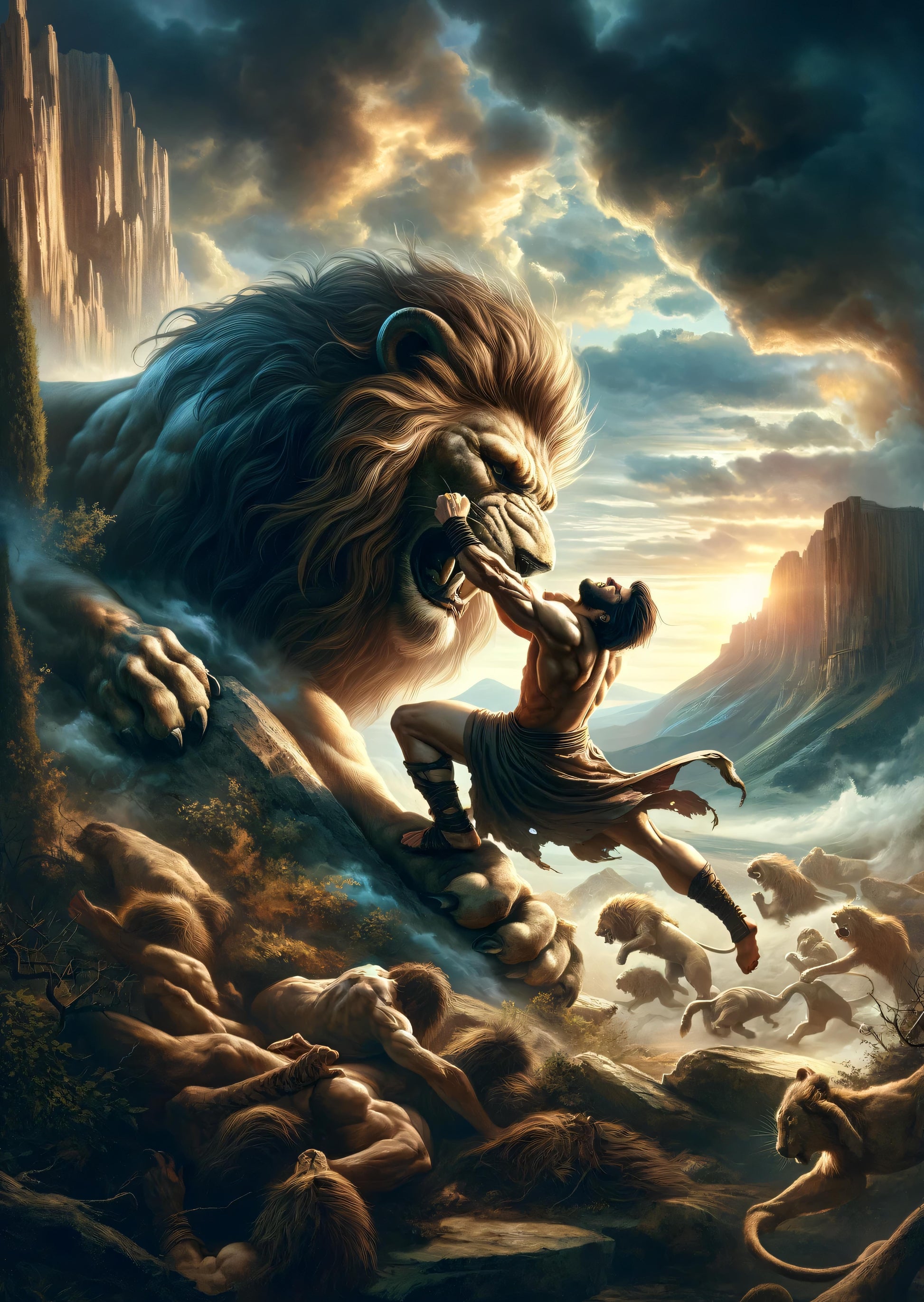 Behold the mighty showdown between man and god In a mythic landscape where earth meets sky Hercules, son of Zeus, known for his superhuman strength, takes on the Nemean lion, a beast with golden fur impervious to mortal weapons Sent by Hera to slay Hercules, the lion met its match in the first of the Twelve Labors Now immortalized in this epic scene, the struggle epitomizes the triumph of bravery over sheer force Witness the legendary battle where Hercules's cunning and might outshine the fabled creature's raw power An ode to heroism, this image captures the timeless tale from Greek mythology with a confronting gaze that challenges the onlooker to feel the intense encounter between human daring and divine challenge