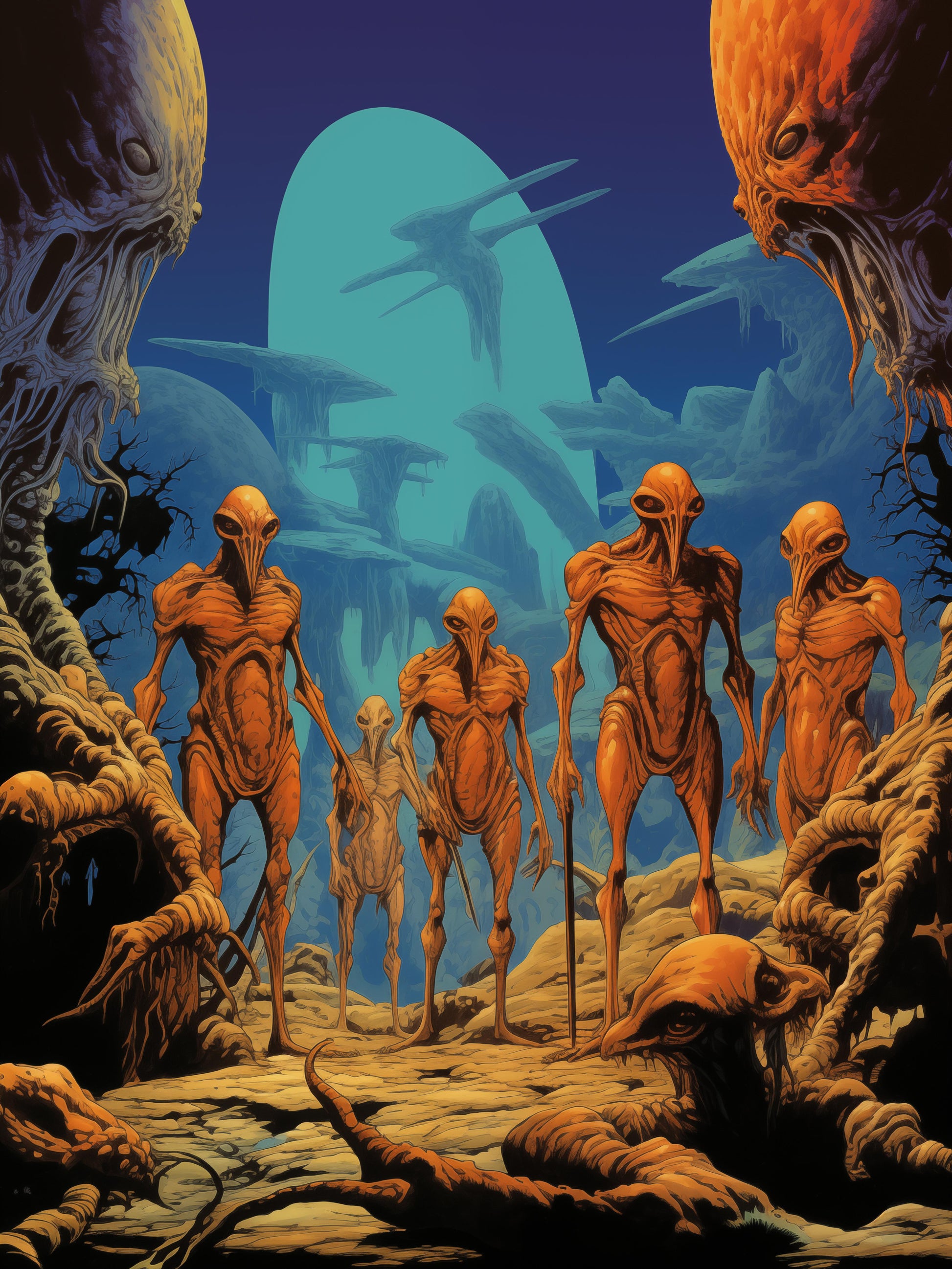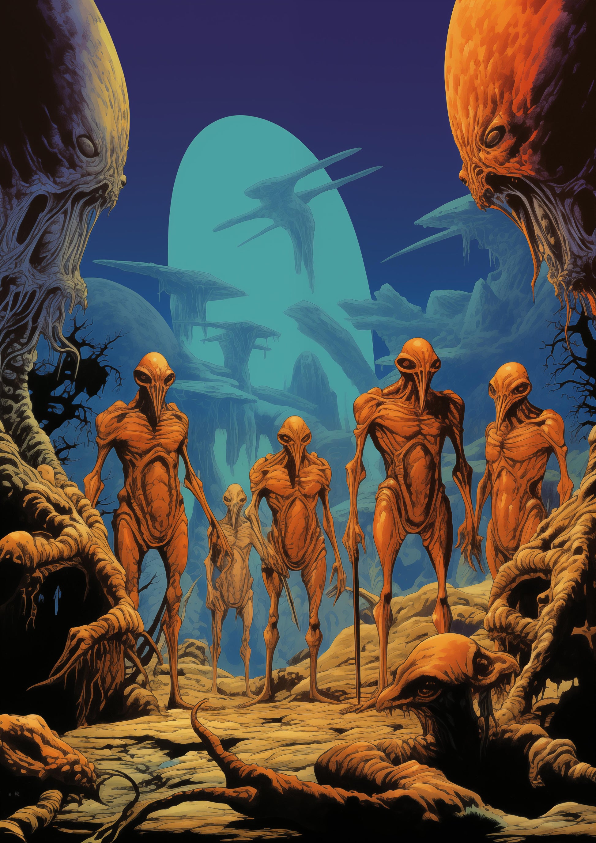 Embark on a cosmic journey with the poster “Hostile Encounter“, which is part of the collection Celestial Oddities, inspired by extraterrestrial wonders. Explore bizarre landscapes, encounter unique aliens, and witness futuristic scenes that blend seamlessly with the cosmos. Each poster captures the essence of cosmic exploration, portraying otherworldly scenery and the enigmatic beauty of extraterrestrial realms.