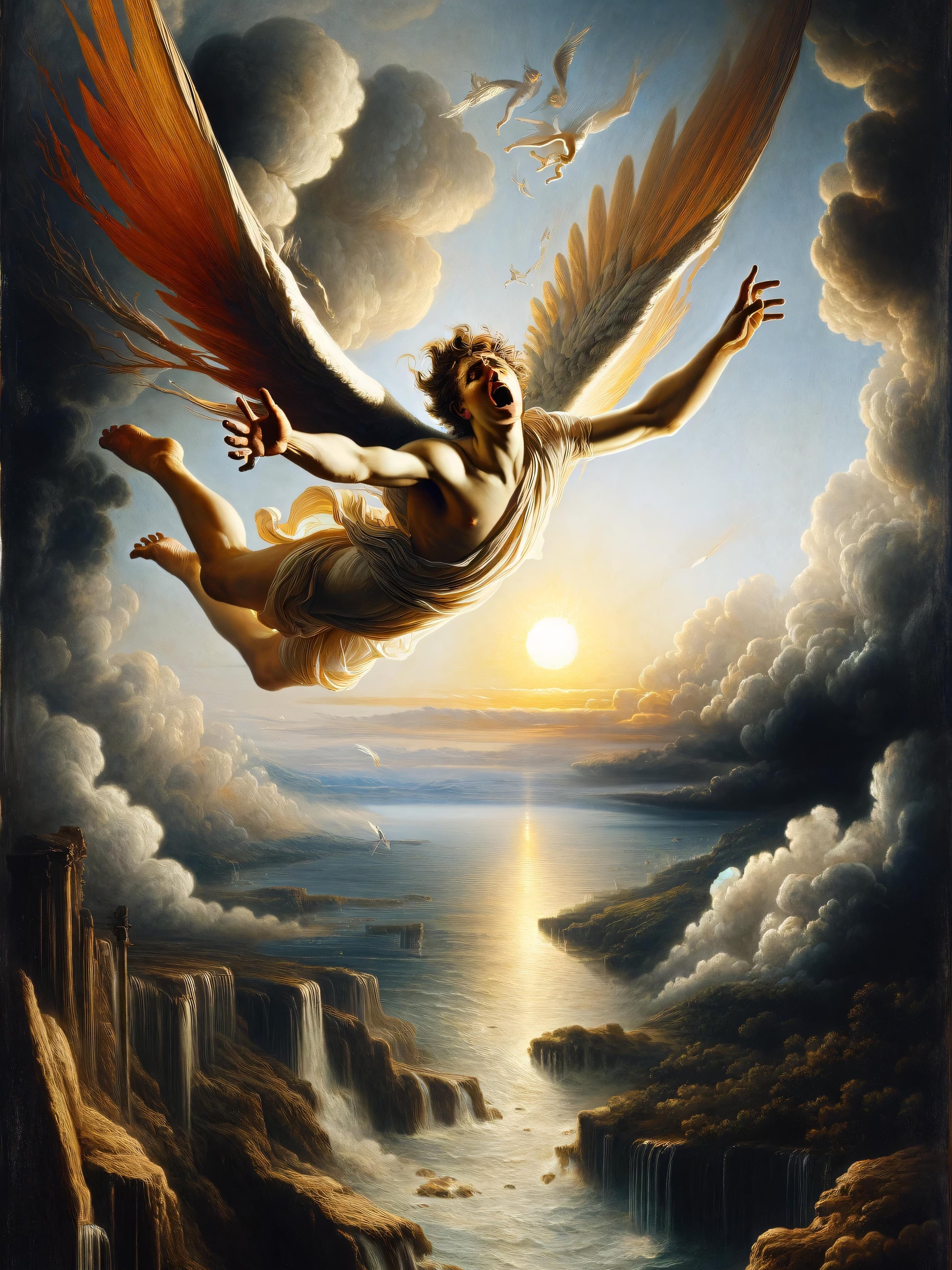 Witness Icarus, son of Daedalus, in his tragic descent towards the sea In Greek mythology, Icarus is known for his father's invention of wings made of feathers and wax, granting the gift of flight Daedalus warns his son not to fly too close to the sun or the sea, but Icarus, engulfed by the thrill of soaring, ascends too high The wax melts, and he tumbles down, a timeless symbol of human aspiration and the consequences of hubris The artwork captures the pivotal moment of fall, dramatizing the clash between human ambition and the harsh laws of nature.