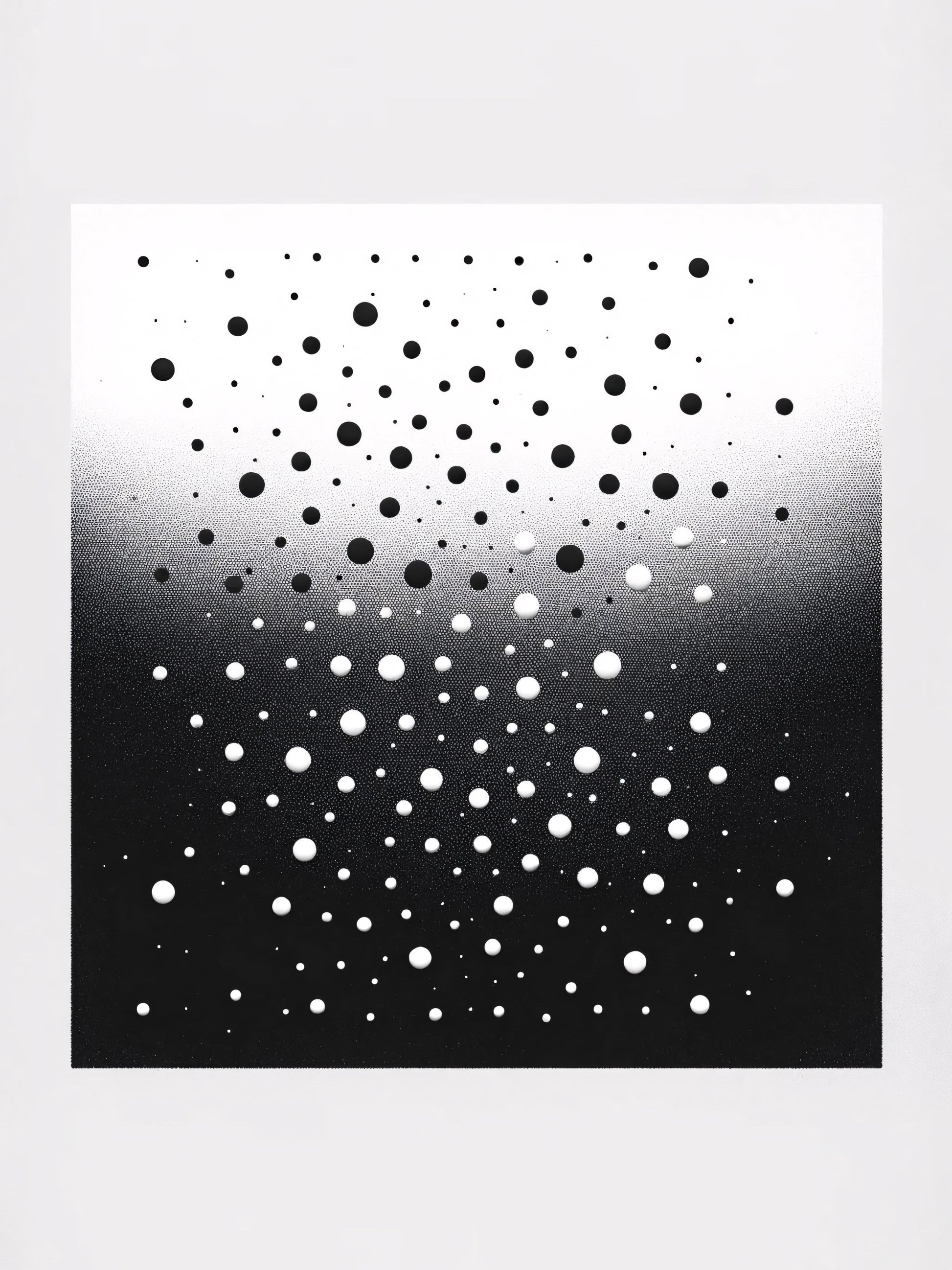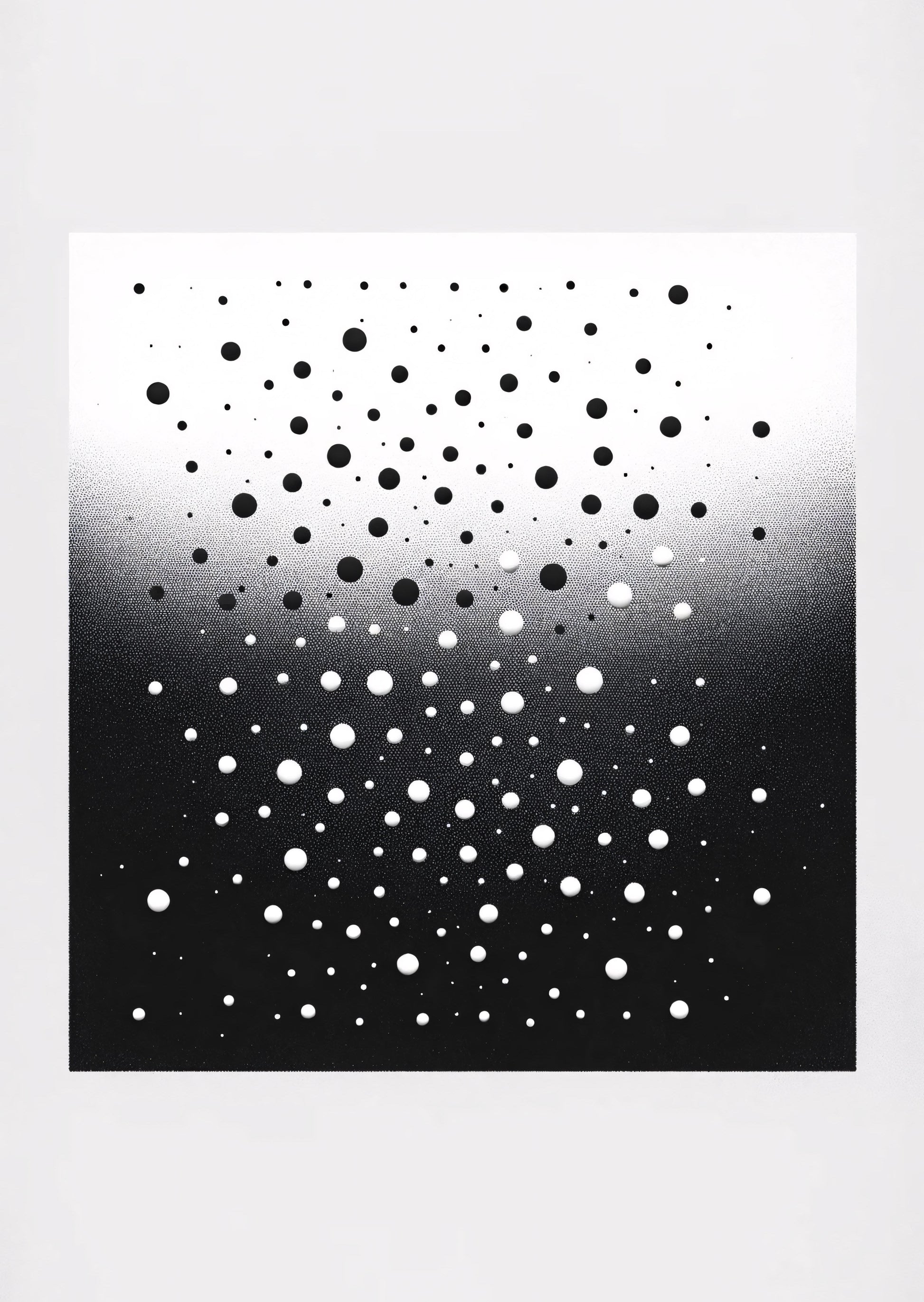In a vast canvas of existence, each spot of white represents a moment in a life, a story, a memory. Some are big, full of impact and easy to see. Others are smaller, quieter, yet still part of the whole. As they fade from dark to light, they remind us of life's journey from the unknown to the known, from the beginning to the end. Every spot is connected, creating a tapestry of human experience, showing us that our lives, while unique, are part of a larger picture, a shared human story.