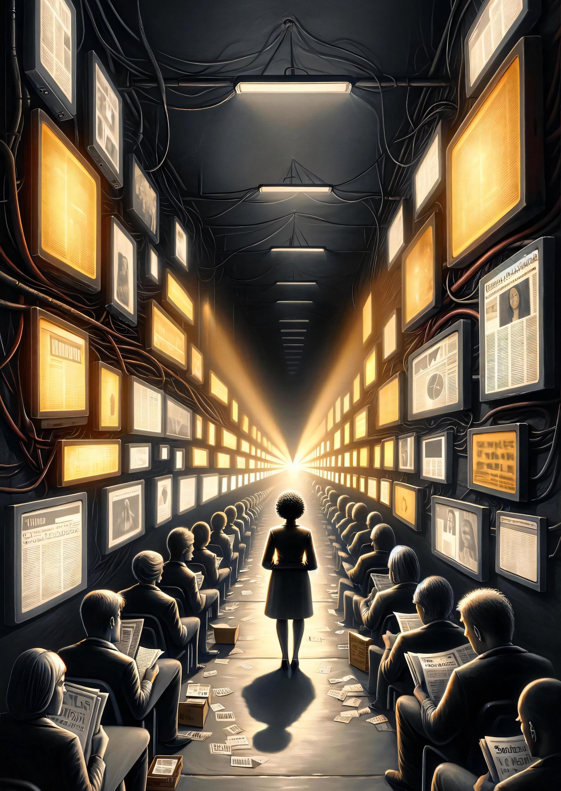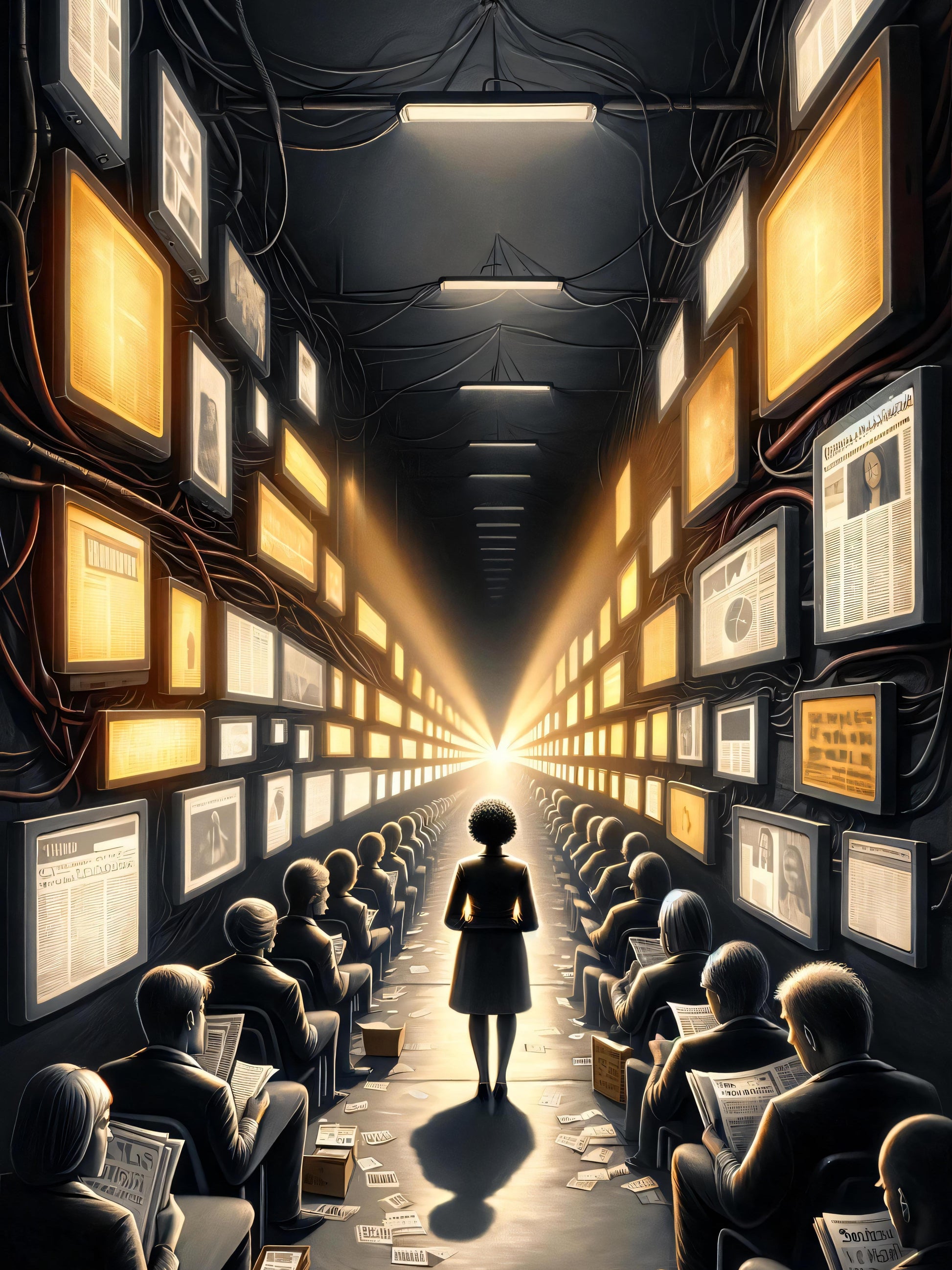 Step into a corridor of consciousness where the psyche's imprints illuminate the path. A lone silhouette advances, framed by the glow of countless screens and framed narratives. This visual tapestry weaves the duality of media influence and self-awareness, casting light on the observer's journey through a media-saturated existence. Every screen symbolizes the echo of societal norms while the surrounding observers, absorbed in their papers, present the ubiquity of information consumption. The figure's path towards the bright unknown may represent the quest for personal truth amidst a world of curated realities. Deconstruct the layers of perception and cognitive bias in this emblematic depiction of the modern mind navigating through the architecture of thought and cultural constructs.