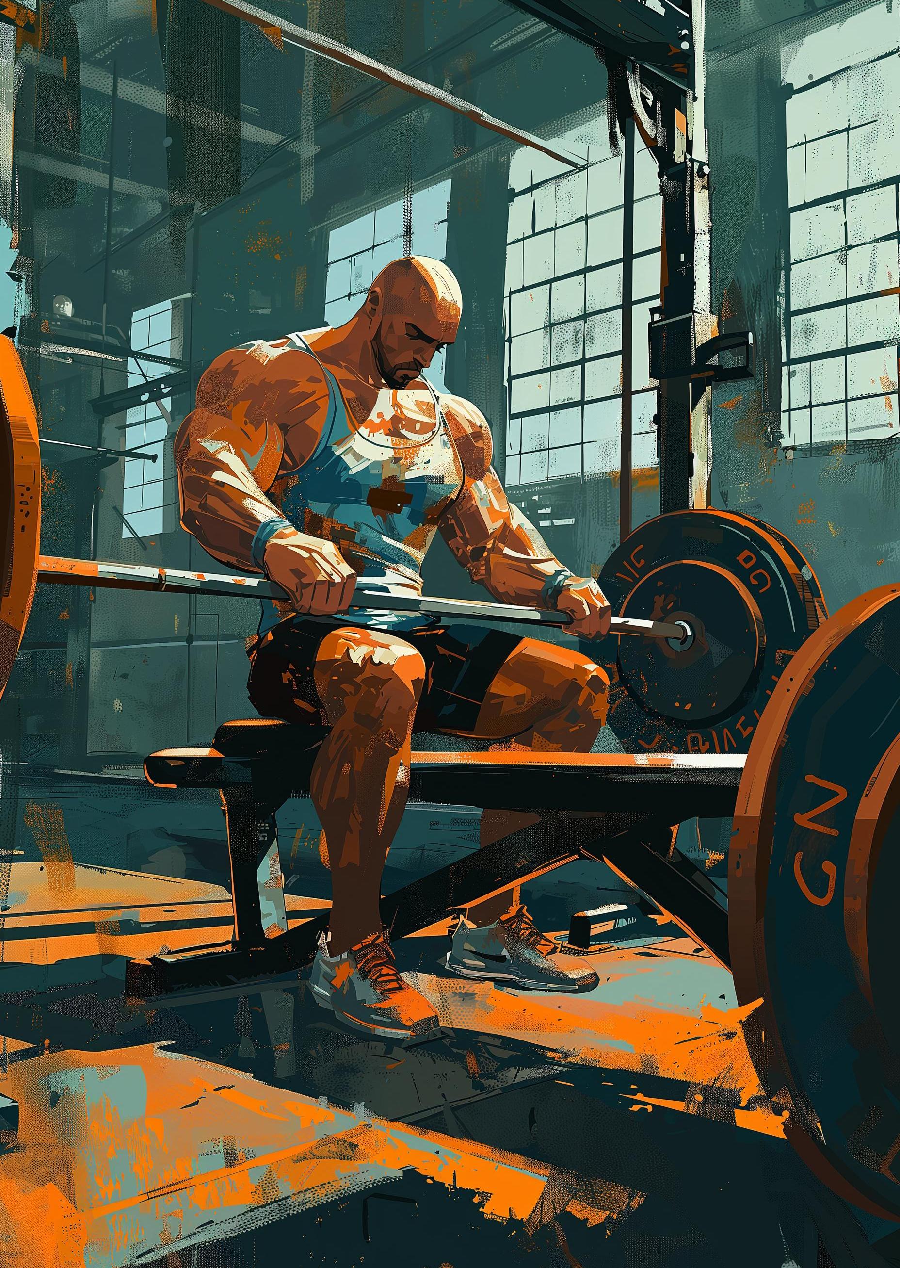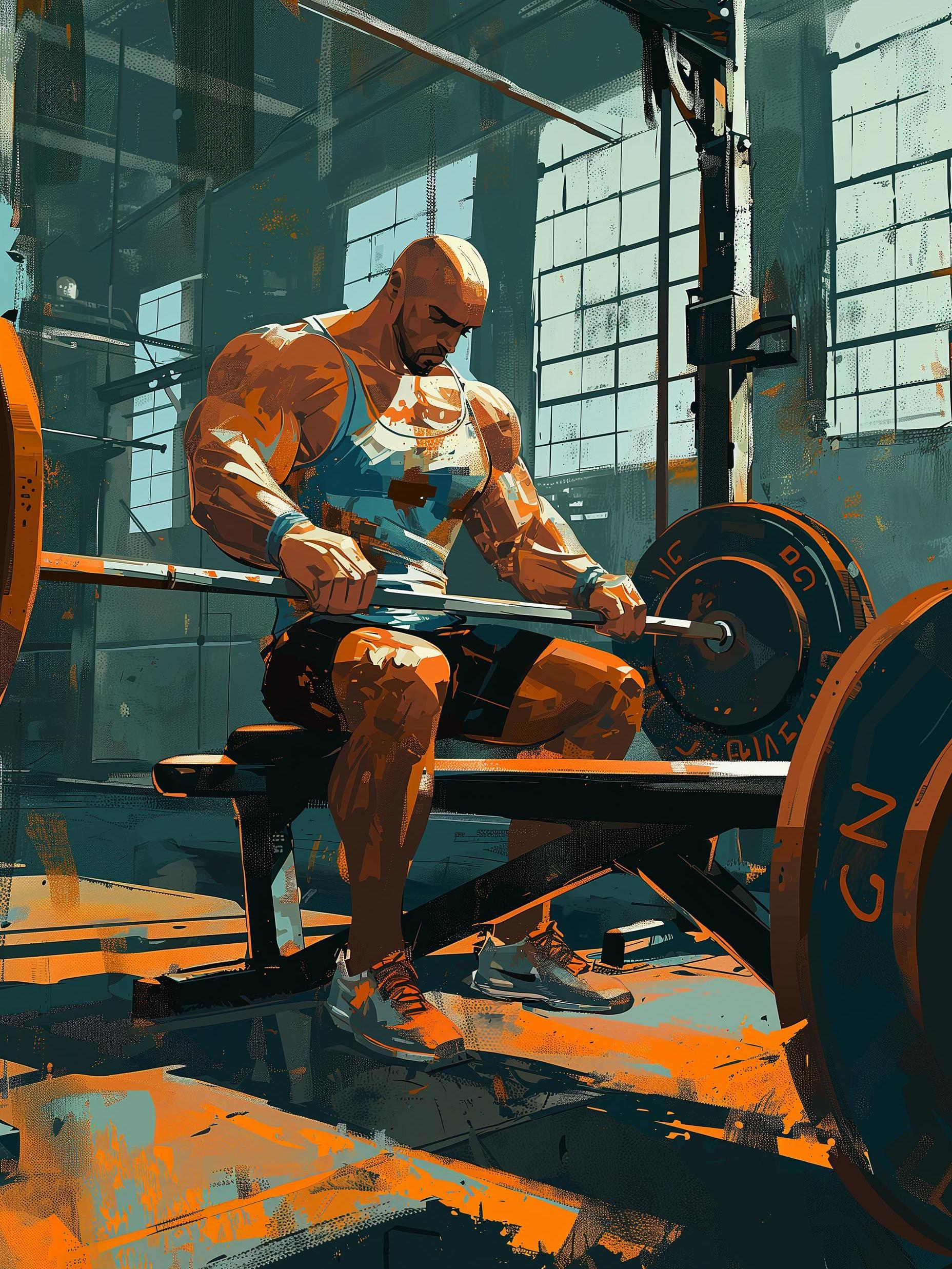 In a gritty gym, a strong lifter sits, steel bar in hand. Muscles tense, he's moments from lifting heavy weights. Sweat drips. His focused gaze on the metal, knowing every lift counts. The cold iron waits to challenge his power and will. It's him against gravity, a silent battle of strength, every rep a step towards victory. The weight feels vast, but his determination is vaster. With a deep breath, he's ready to conquer.