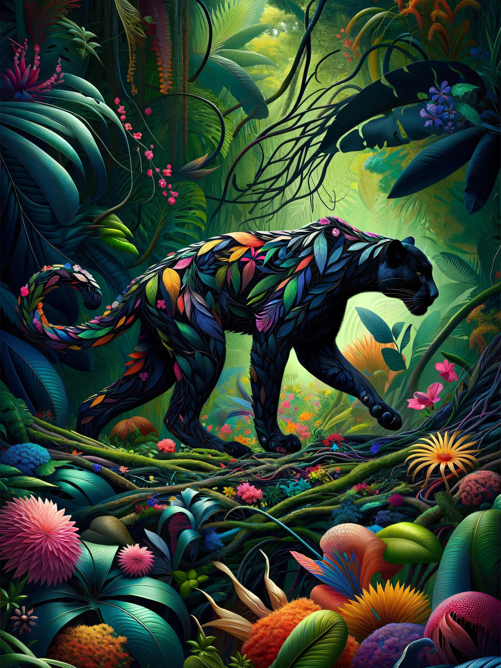 In a lush jungle, a magnificent panther made of vibrant leaves and flowers treads softly. Its coat is a mosaic of nature's palette, reminding us that life is both varied and united. This creature represents the beauty of diversity and the strength of unity. Amid the dense foliage, the panther moves with purpose, embodying the idea that every piece of the ecosystem is essential. Just as the panther's colors blend into a stunning whole, our world thrives when different elements coexist in respect and mutual support.