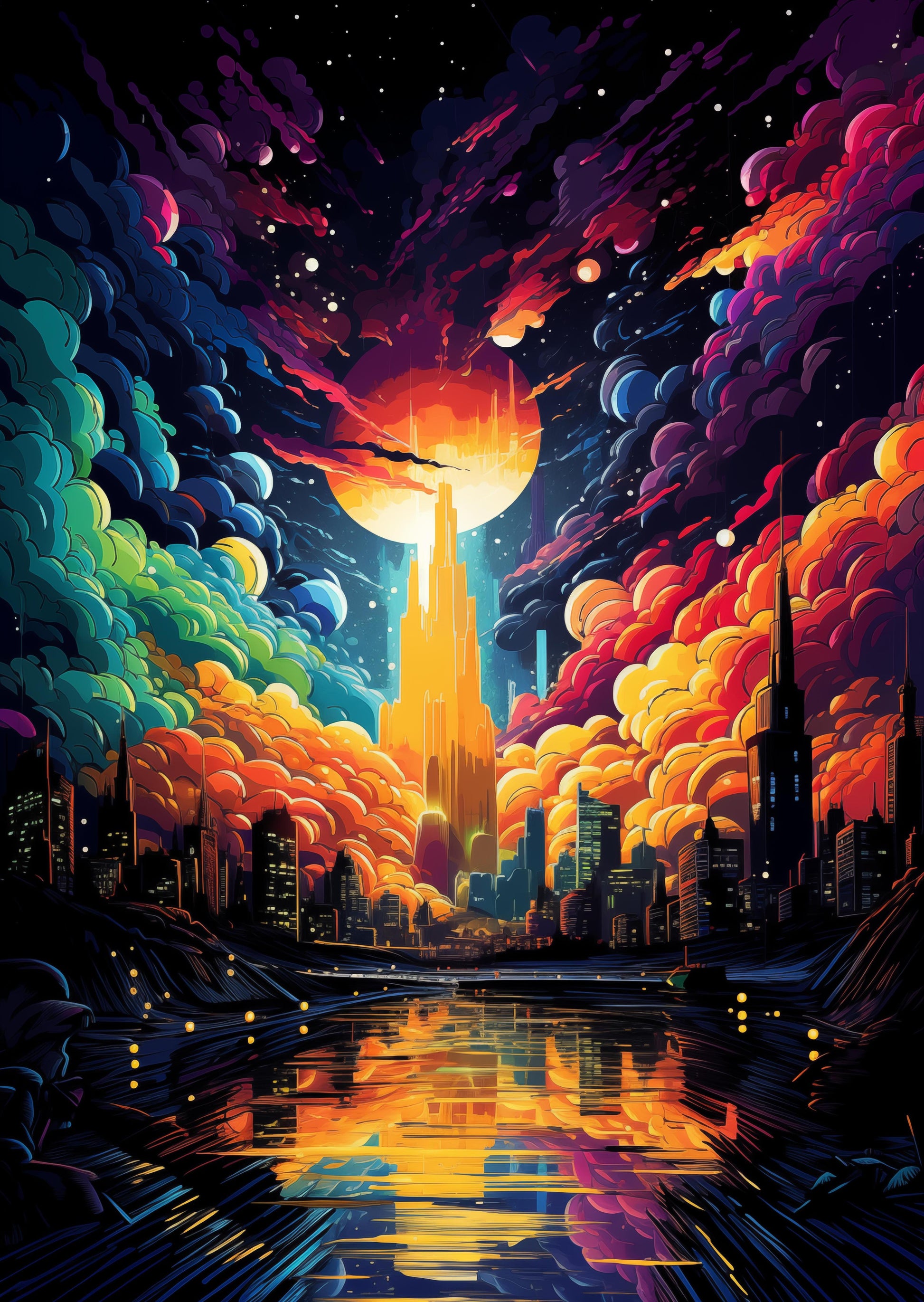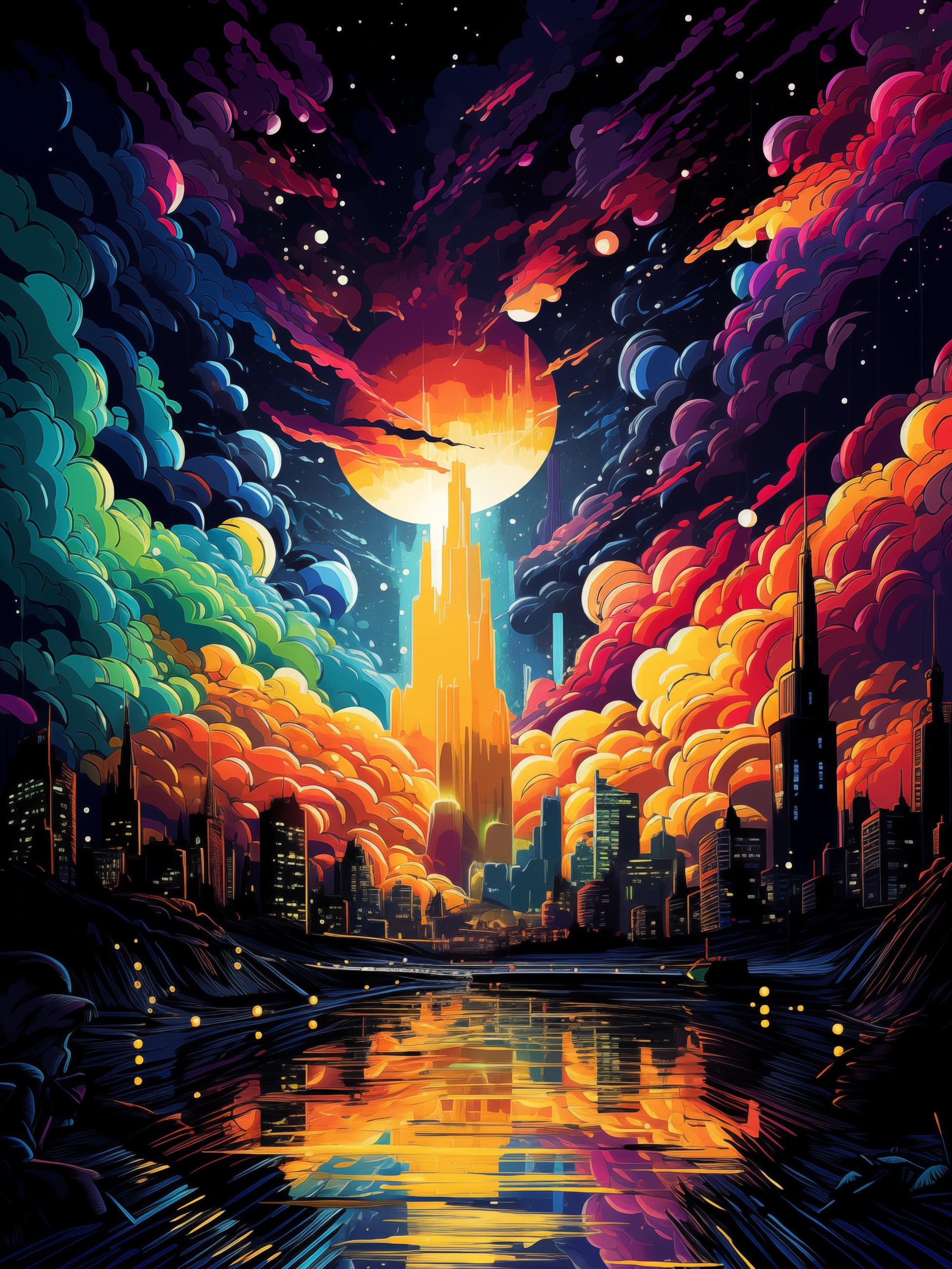 In a vibrant metropolis, illumined by the radiance of a setting sun, the cityscape basks in a kaleidoscope of color. Opulent clouds, infused with the glow of twilight, hover above skyscrapers, casting reflections upon the peaceful river that courses through the urban expanse. Stars emerge in the night sky, hinting at a cosmos full of mystery and wonder, while the city's lights flicker like fireflies, signaling life's persistent pulse in this fantastical fusion of day and night, nature and civilization. As the sun dips lower, the liminal moment is captured, where day meets night, dreams blend with reality, and every citizen feels like a part of something larger than themselves—a tapestry of light, color, and boundless possibility.