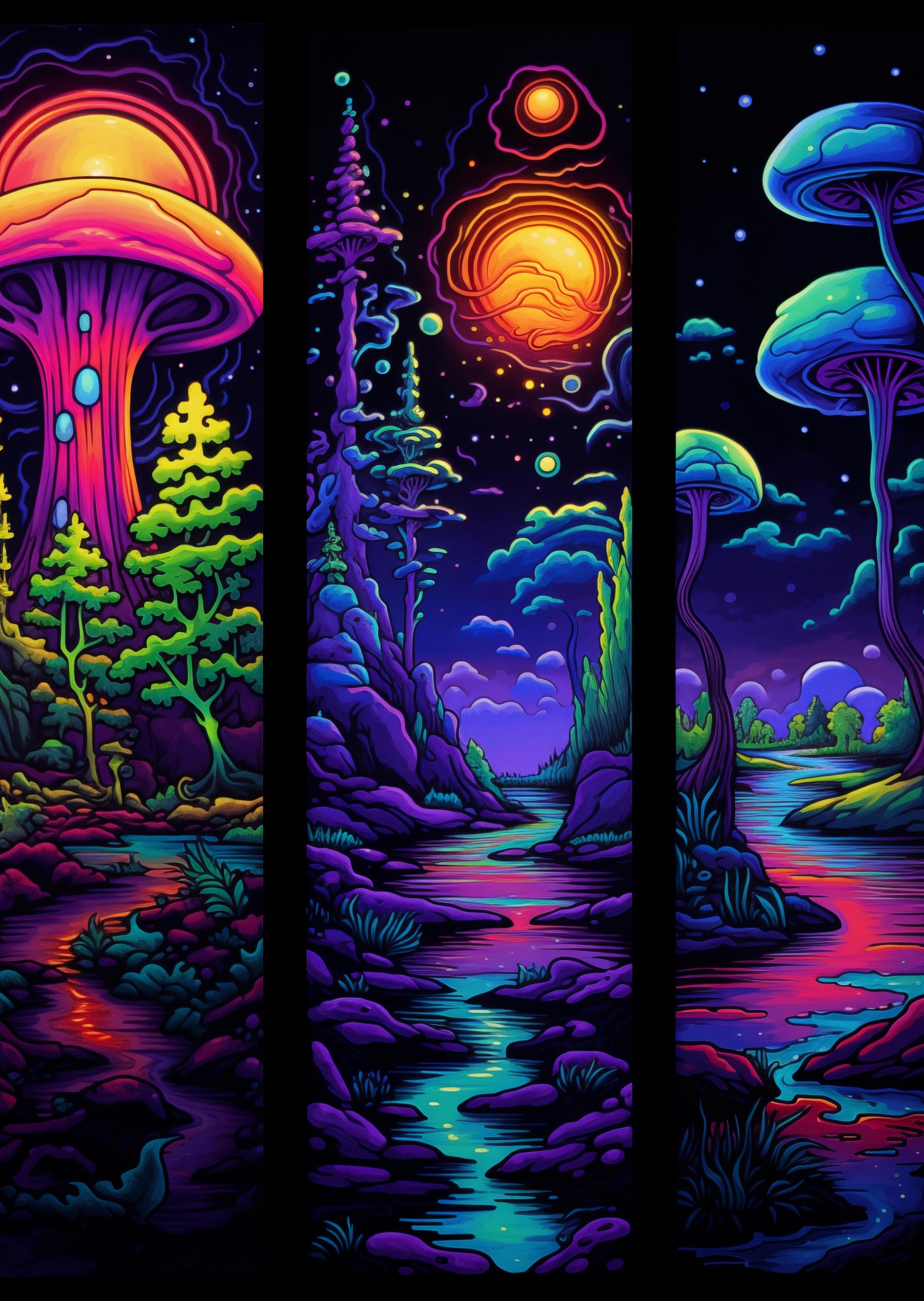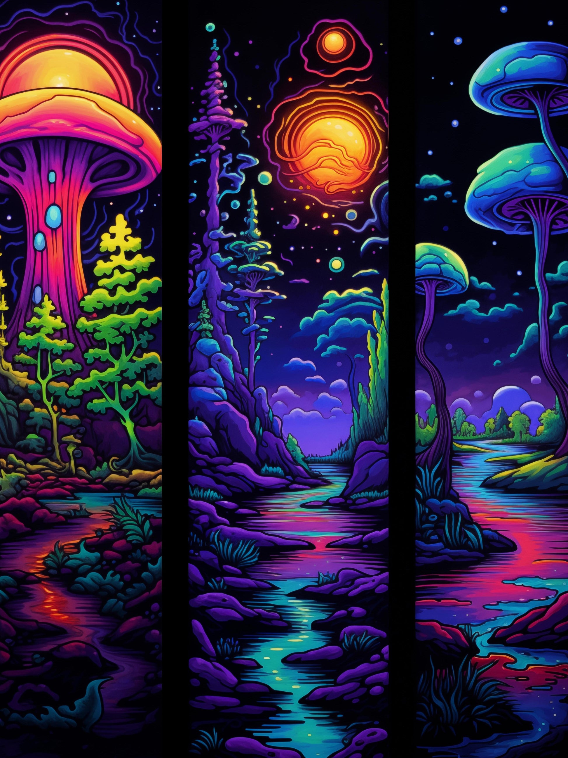 In a realm where the night sky glimmers with vibrant celestial bodies, a mystical forest thrives under the glow of oversized, luminous mushrooms. A spectrum of colors dance across the landscape, painting the rivers and foliage in hues unseen in the waking world. Plush moss and curious flora carpet the ground, offering a feast for the eyes with their outlandish shapes and shades. The air is thick with the scent of unknown blossoms and the sounds of unseen creatures, hinting at the diverse life that calls this place home. It's an untouched paradise, a canvas of nature's boldest artistry, where every turn unveils a visual feast, inviting wanderers to lose themselves in its alien beauty.