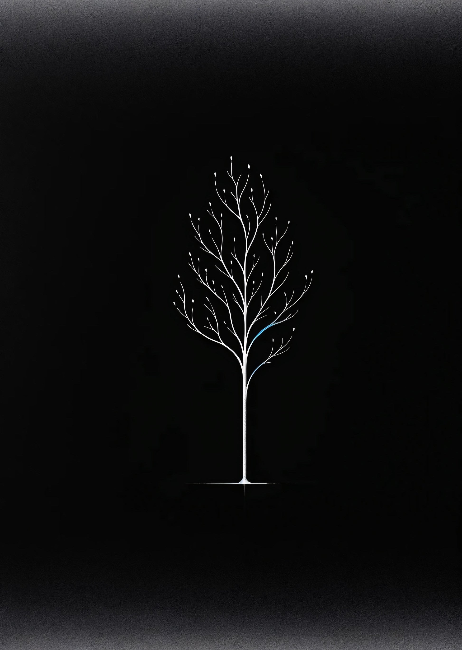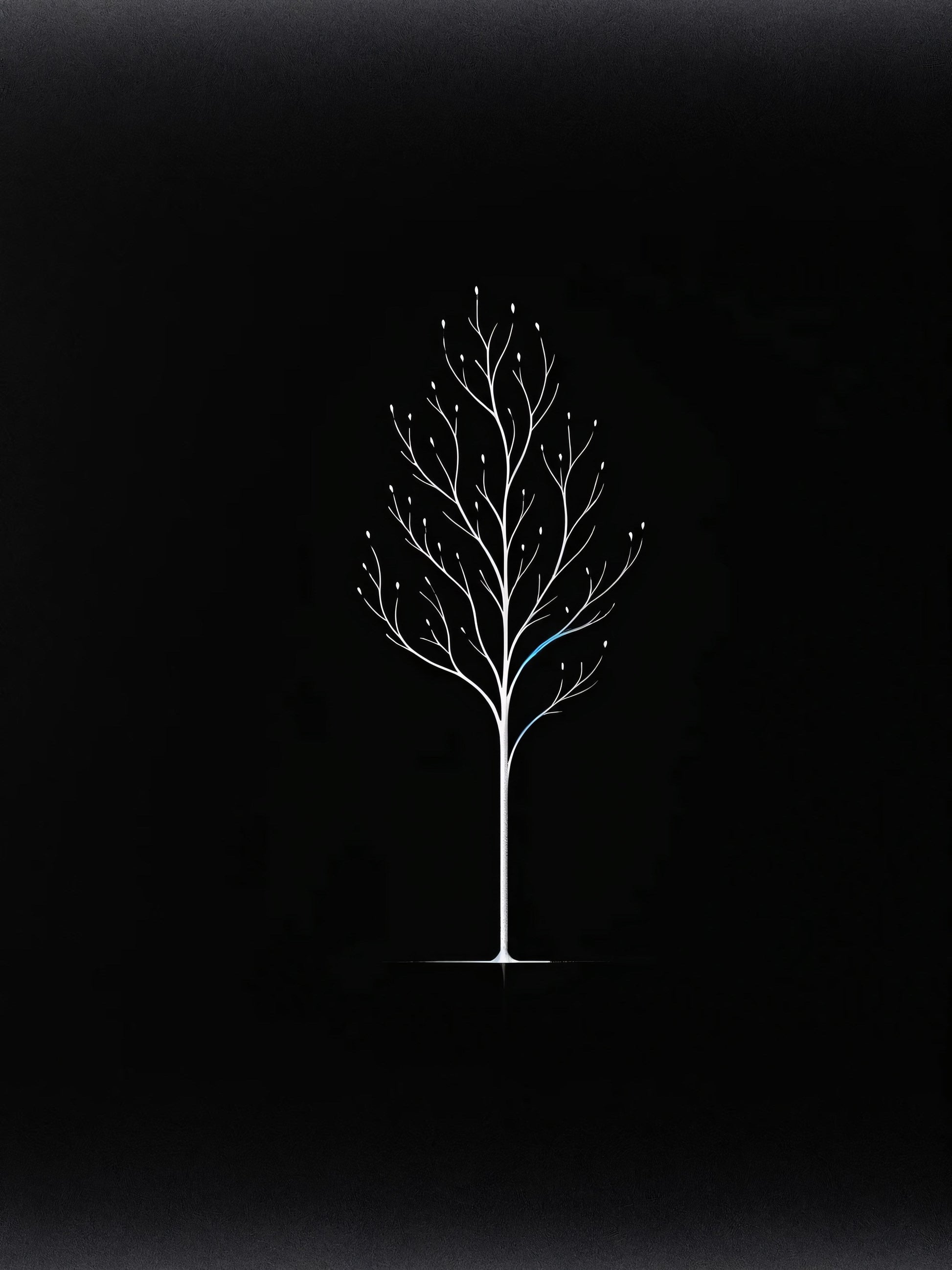 In a vast void of darkness, a lone tree glows softly, a beacon of light in the gloom. Its branches reach out as if to catch the whispers of light, each twig cradling a glimmer of hope. This image speaks to the resilience of life, the courage to stand alone and shine amidst the shadows. It reminds us that even in the depths of solitude, there can be beauty and strength. The simplicity of the tree against the endless dark portrays the essence of persistence and the power of a single bright presence to break through the mundane.
