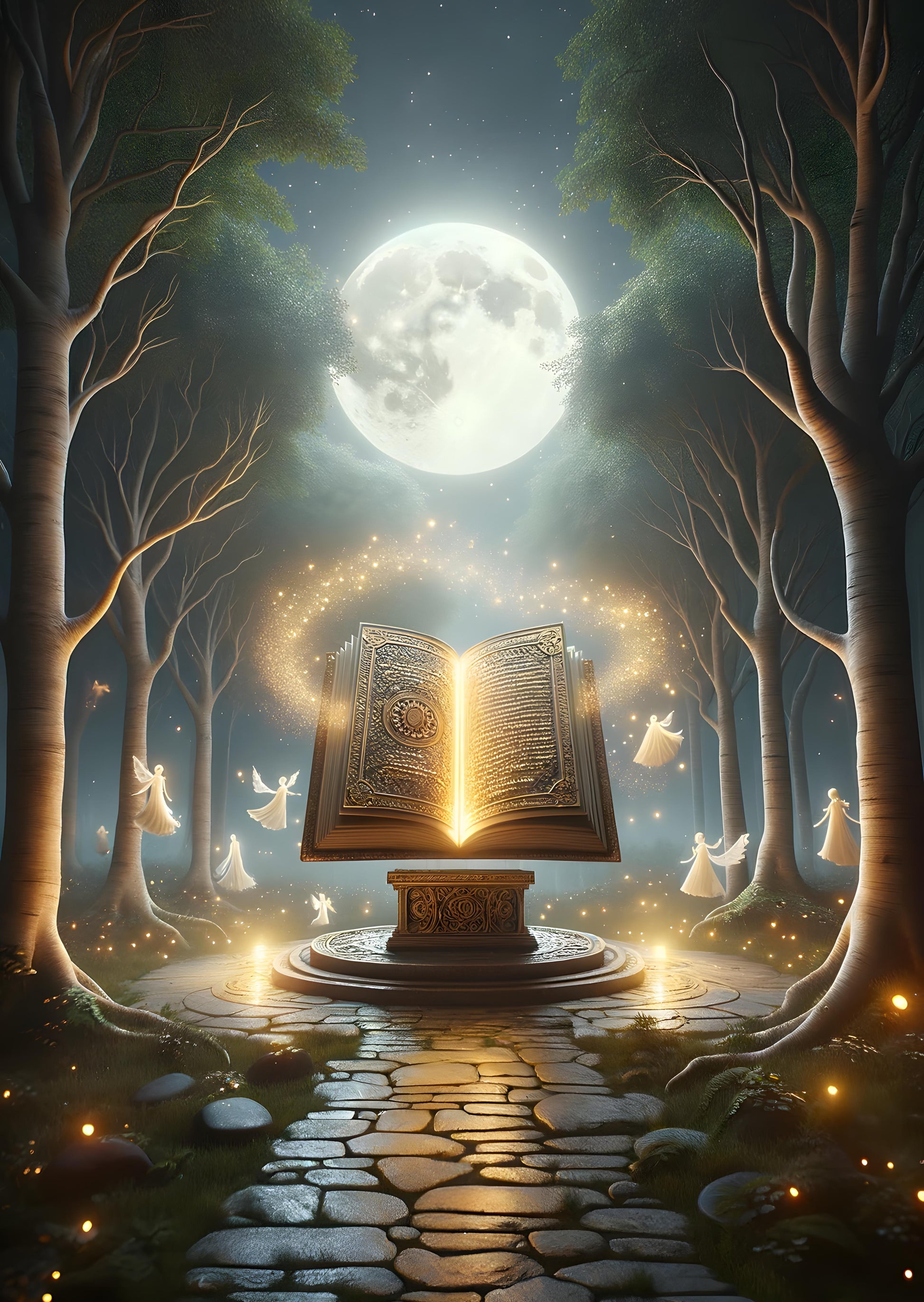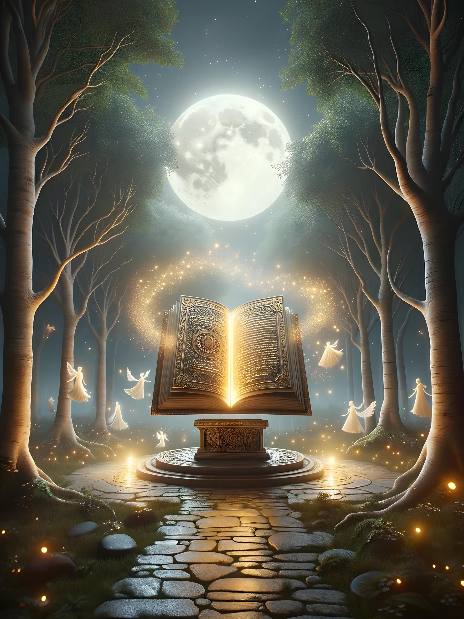 Under a luminous full moon, a mystical forest comes to life. At its heart lies an ancient tome, aglow with a golden aura, opened upon a stone pedestal as if awaiting a curious reader to unveil its arcane knowledge. Surrounding it, a gathering of ethereal figures dance in mid-air, glowing softly, as though celebrating the moon's bright watch. A cobblestone path invites wanderers to this magical scene, with delicate fireflies leading the way and trees standing as silent, protective sentinels. This is a realm where the boundaries between reality and fantasy blur, where stories weave through the branches and into the night's embrace.