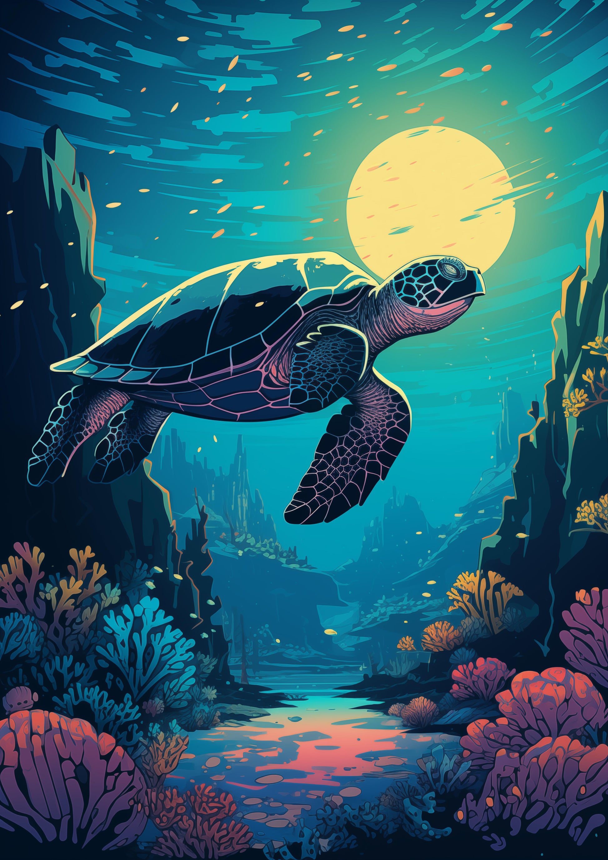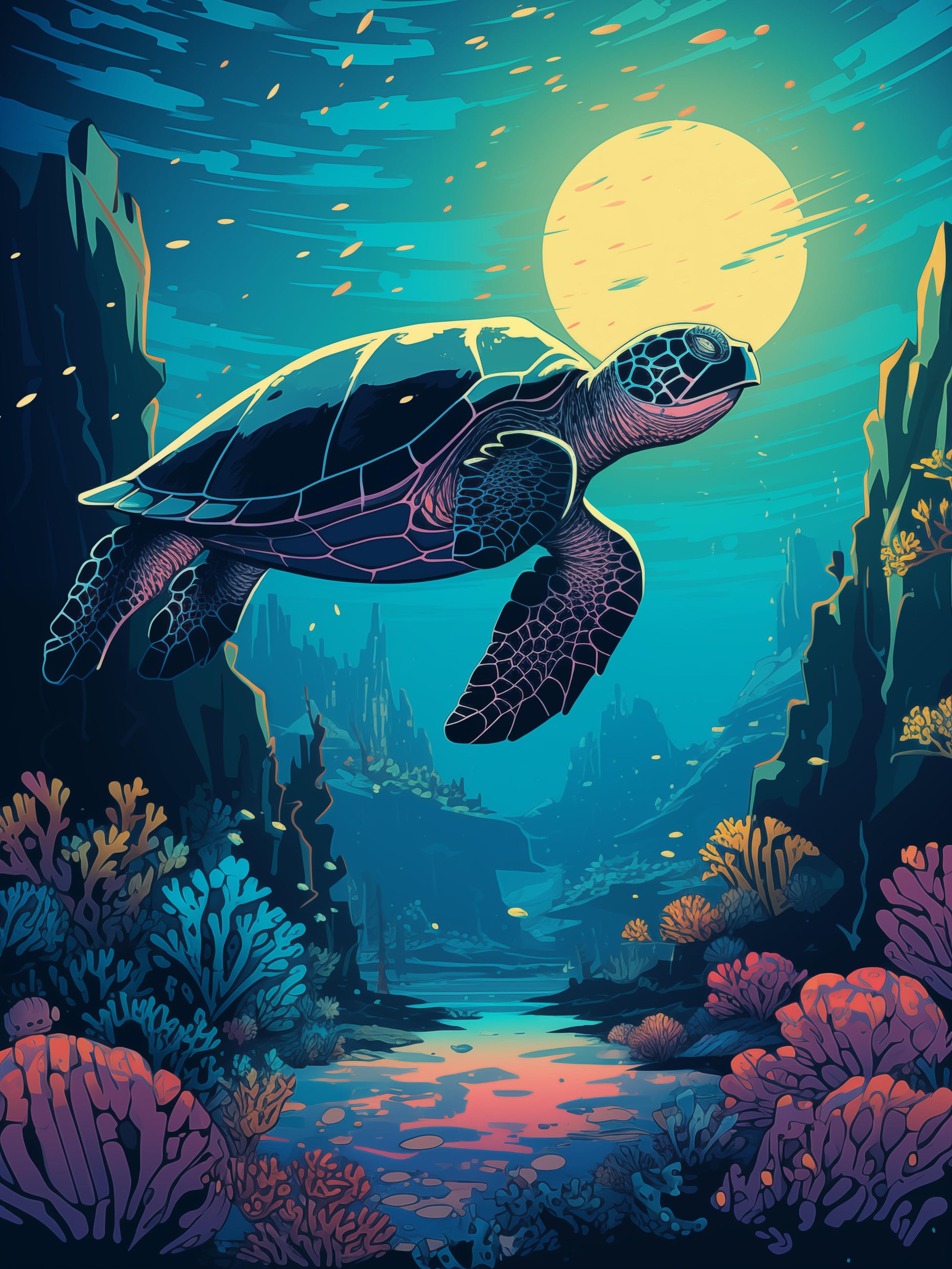 Immerse yourself in the beauty of our natural world with the breathtaking “Marine Turtle Tranquility“, part of the Enchanting Wilderness collection that captures the essence of diverse landscapes, vibrant skies, and majestic wildlife. Each poster brings the serene beauty of nature into your space. From stunning sunsets and lush forests to pscychedelic skylines, embark on a visual journey that celebrates the harmonious interplay of colors, light, and the diverse creatures that inhabit this world.