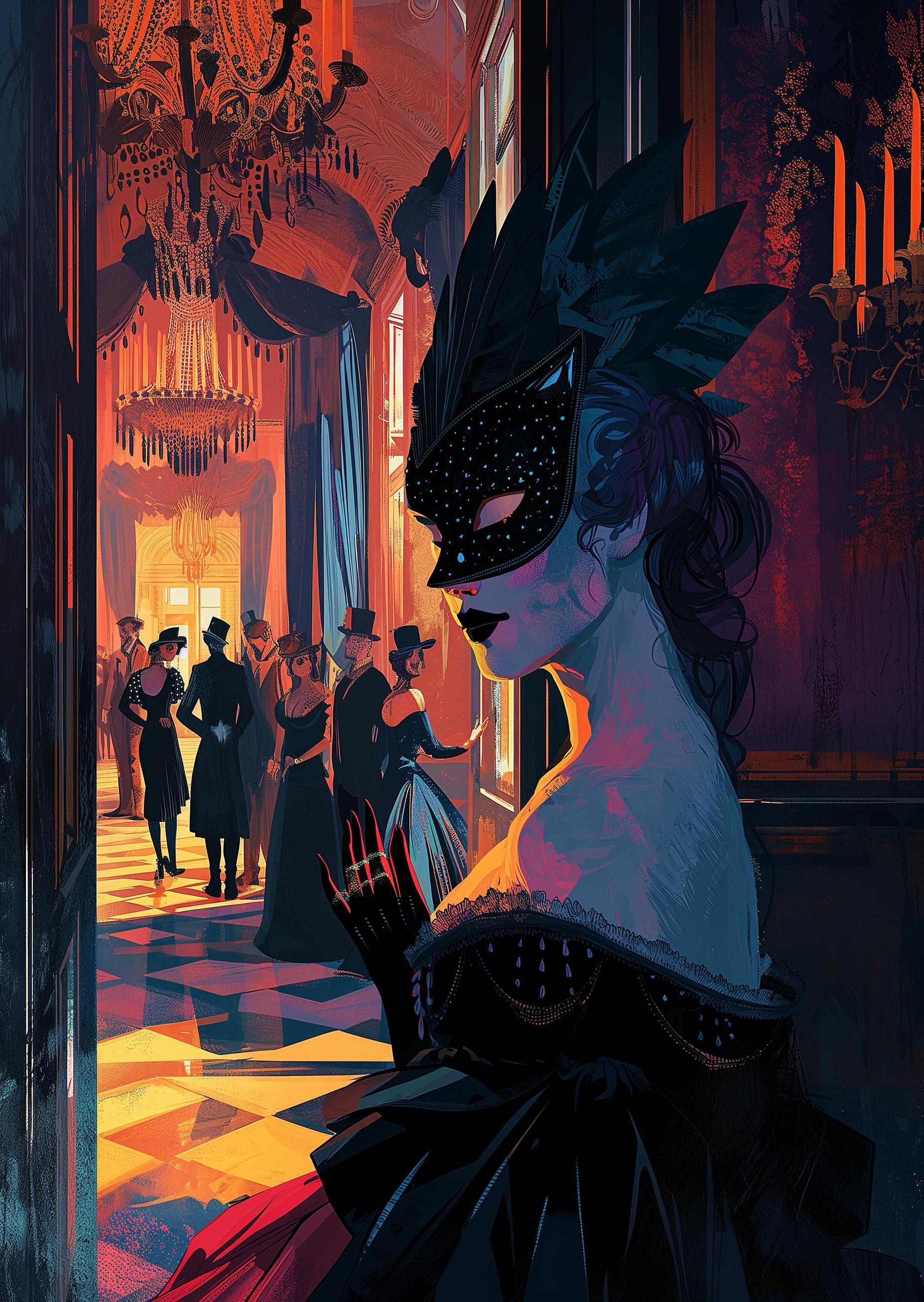 In a grand hall lit by the warm glow of chandeliers, a woman adorned with an elegant mask stands by the doorway. She gazes into the lively crowd, each guest cloaked in mystery. Their faces are hidden, but their gestures speak volumes, carrying tales of secret lives and hidden smiles. She takes a deep breath, her own mask a canvas of night and stars, and steps forward. The dance floor beckons, and for a night, everyone can be anyone, free from the world's watchful eyes. The air buzzes with music and muted laughter, a celebration of disguise and discovery.