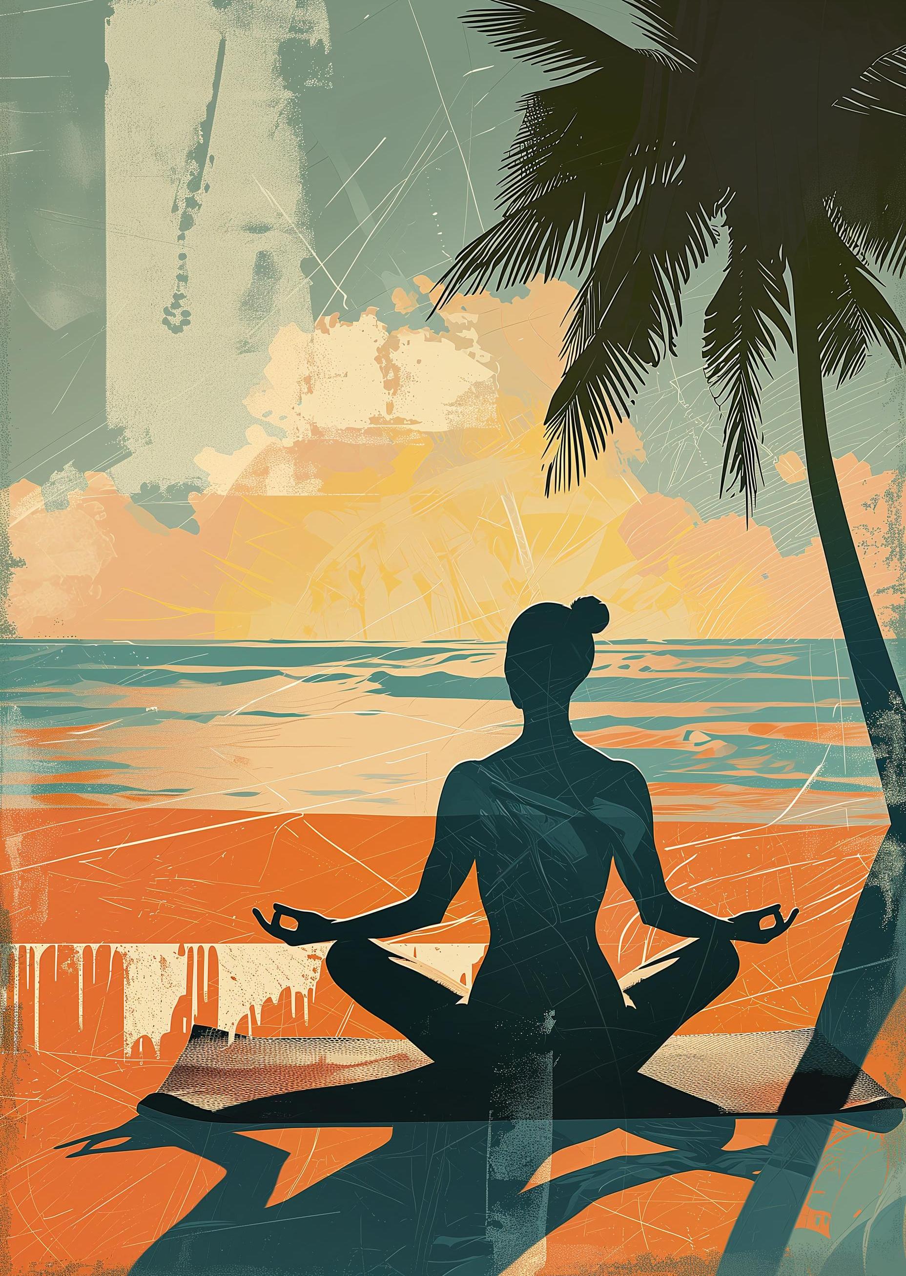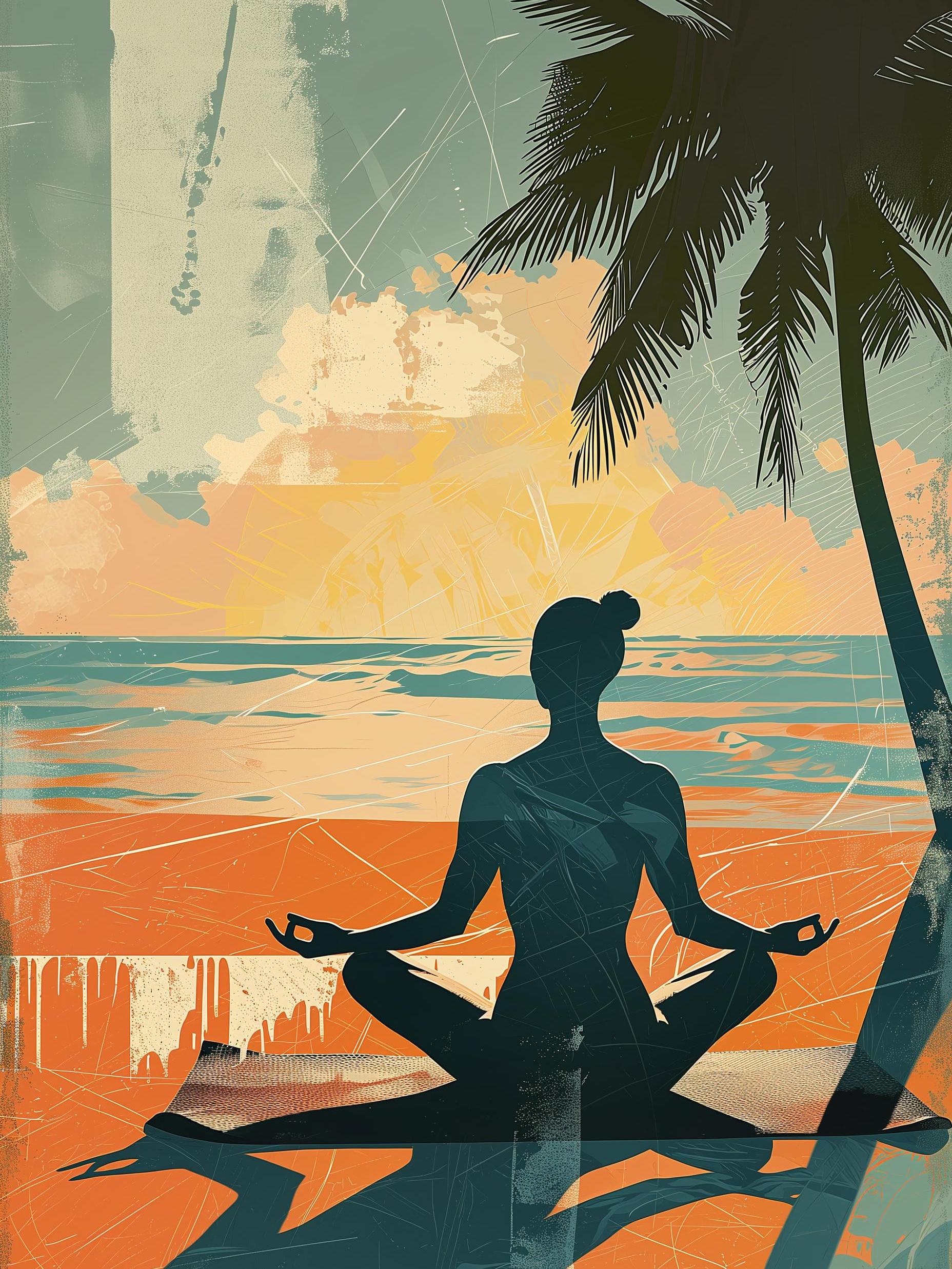 In the soothing glow of the sunset, a person finds calm. With legs crossed and palms open, they sit between the whispers of the sea and rustling palm leaves. The cool breeze dances around, as the day's heat fades away. This artwork captures a peaceful moment of reflection, with the colors of the sky painting the ocean's canvas. The figure's silhouette is a still anchor amidst nature's gentle movements. It’s a story of a soul in tune with the world's simple, quiet beauty.