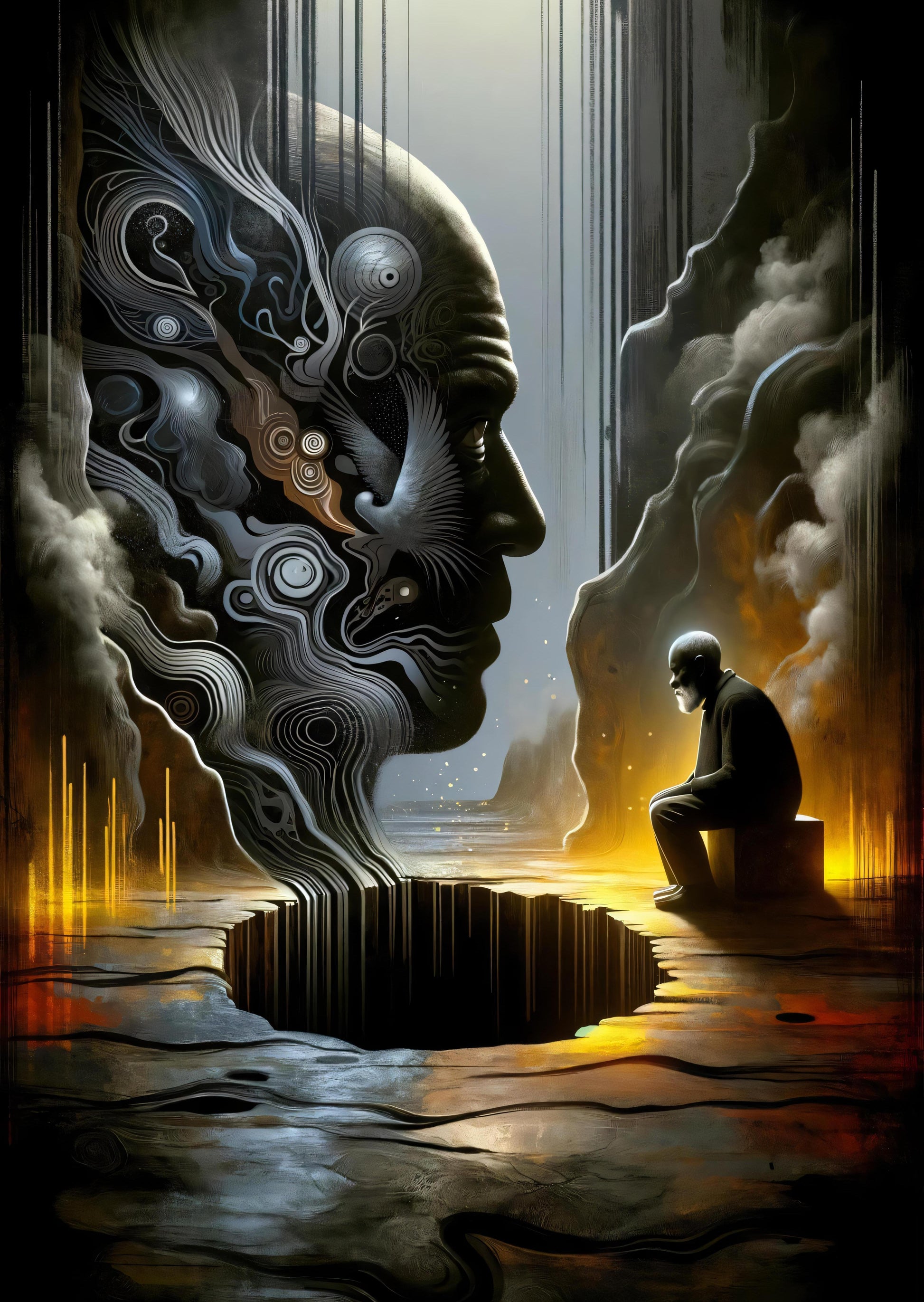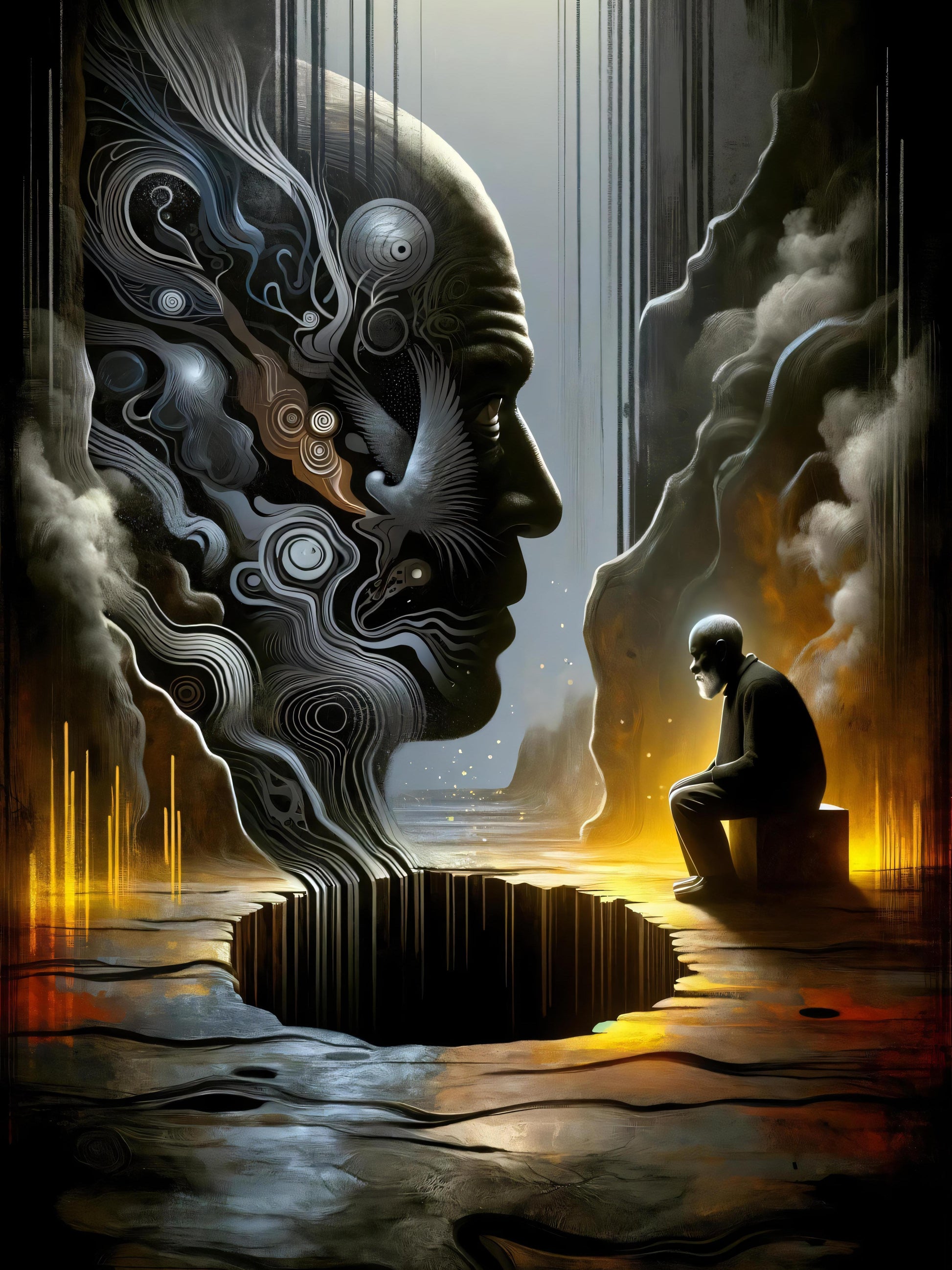 In this evocative depiction, the elements converge to represent the vast expanse of the human psyche A solitary figure contemplates beside a luminescent pool, possibly delving into self-reflection or meditation, illuminating the profound depths of inner thoughts and awareness. Above, a colossal visage comprised of swirling patterns signifies the intricate workings of the mind, its infinite complexity, and the fluid nature of consciousness. The merging of shadowy clouds and luminous streaks creates a visual metaphor for the duality of one's essence—darkness and light, the conscious and subconscious. This artwork invites viewers into a contemplative journey, probing the existential questions that linger at the core of human experience.