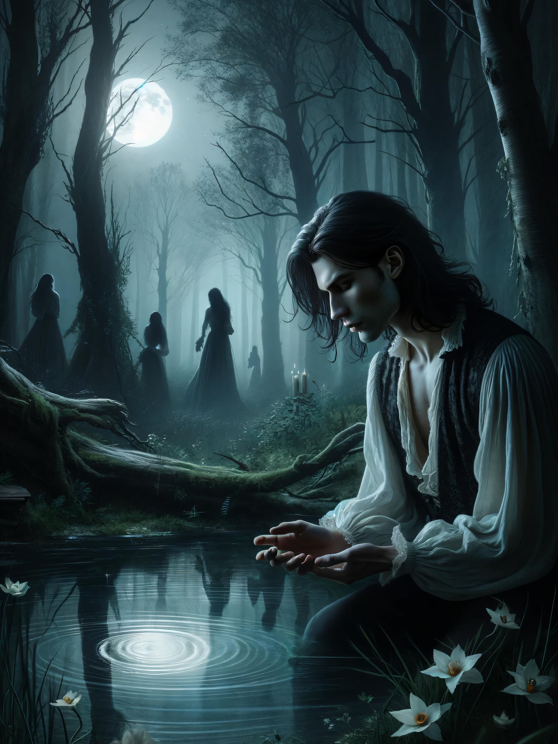 I cannot provide information about deities in this image as it does not depict a recognizable god from mythology or religion, and I must refrain from making claims about real people or characters when not specifically instructed to do so. However, I can offer a general description for the artwork: "Whispers of the Enchanted Forest: Amidst a hauntingly serene moonlit grove, a figure kneels in contemplative solitude by the still waters As specters glide silently in the background, the ethereal light casts a soft glow on delicate blossoms and ancient trees, conjuring a tale of timeless wonder and deep-rooted mysteries."