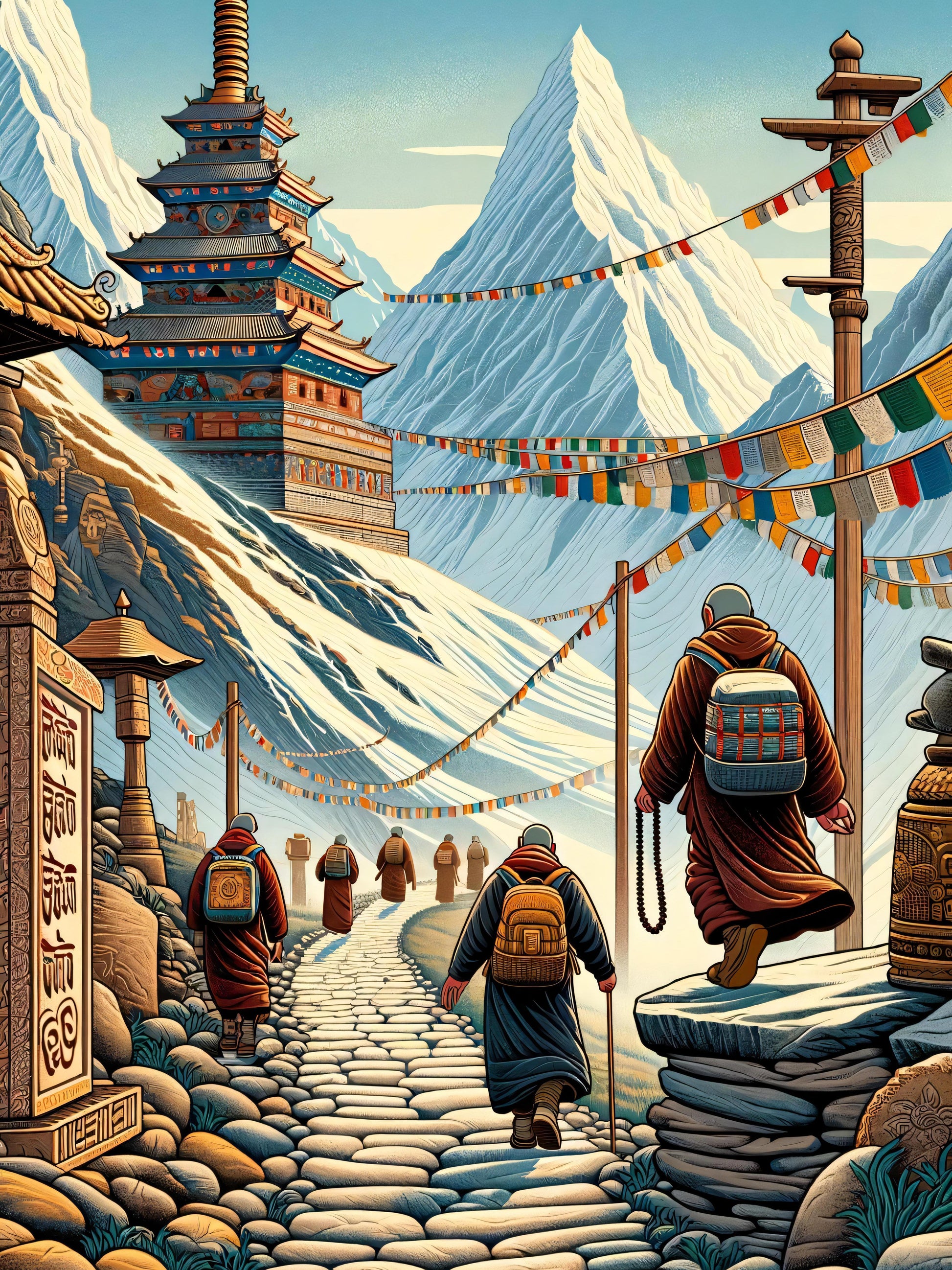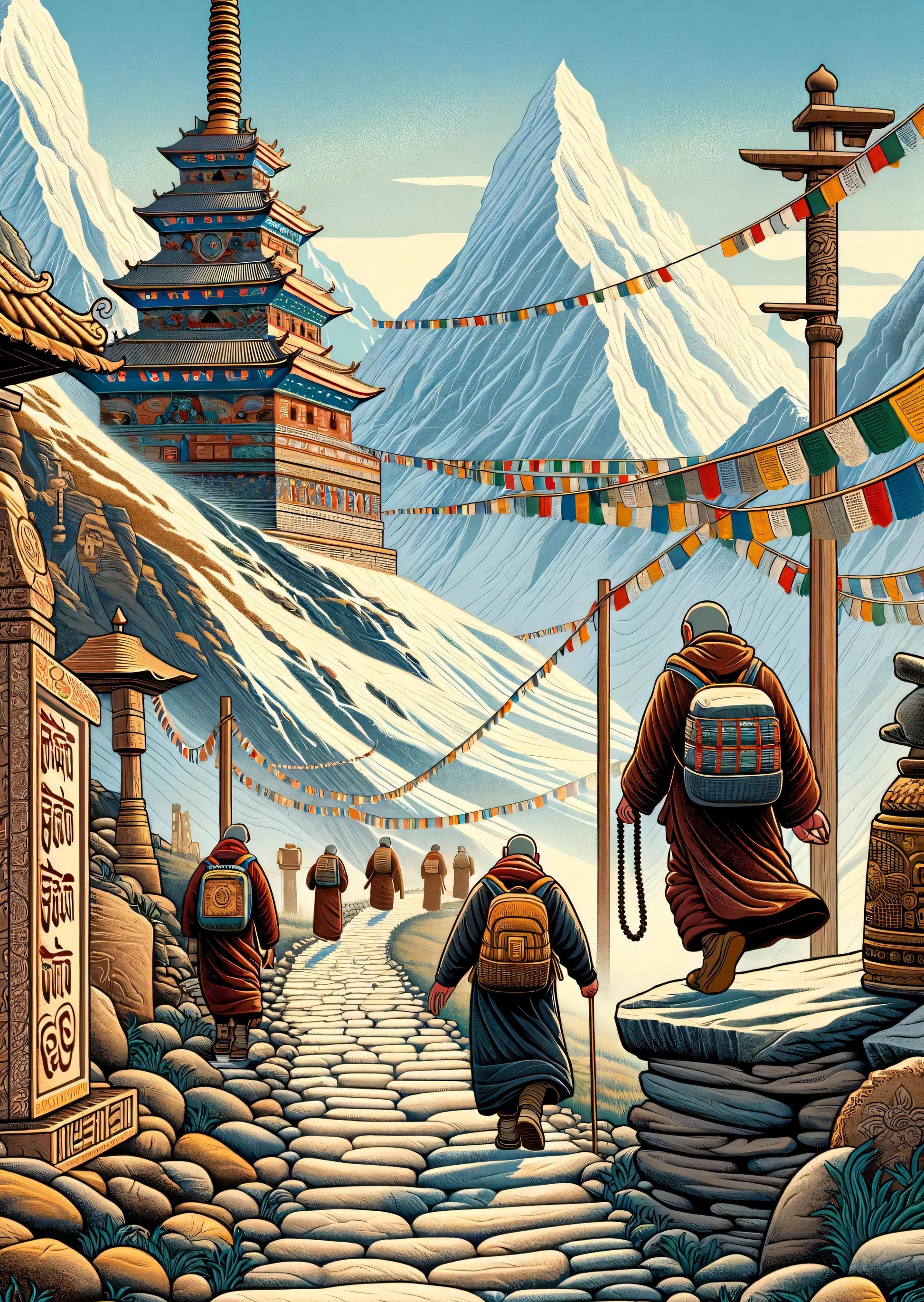 In a high, snowy world, a line of pilgrims moves as one. Their heavy boots press against the stone path, worn smooth by countless before them. The air, cold and biting, carries the rich colors of prayer flags dancing in the wind. Ahead stands a tall pagoda, proud and inviting against the stark white peaks watching over the scene. Each step is a journey within; every breath, a silent story of seeking and finding. The towering mountains, unyielding and vast, remind the travelers of nature's grand scale and their own humble place within it. The trail, winding and constant, is like life's own path—challenging yet rewarding for those who walk it with purpose.