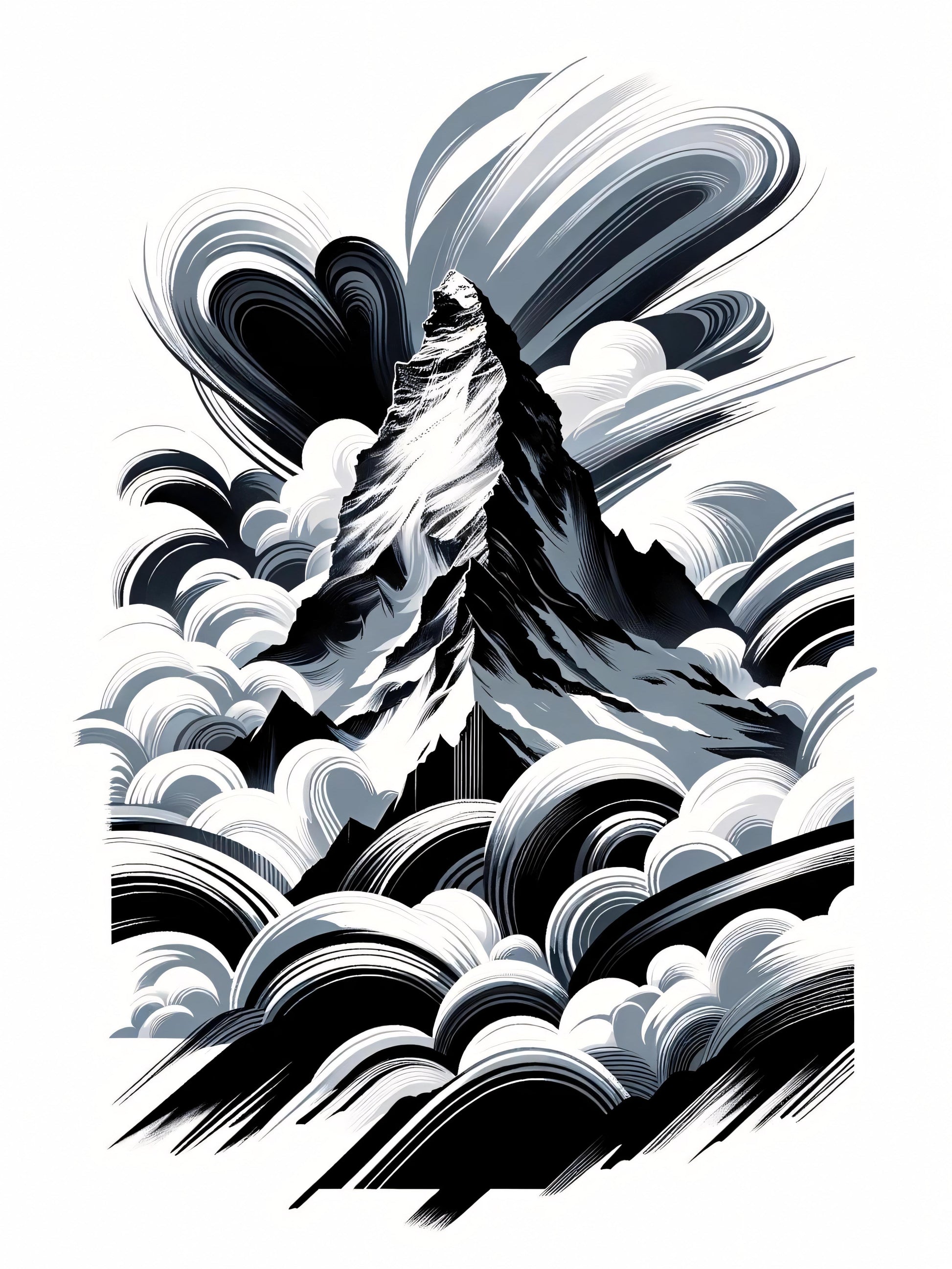 In this image, a mountain stands tall among swirling clouds, a symbol of resilience amidst constant change. Its peak, unwavering despite the swirls and flows surrounding it, teaches us about strength and endurance. The clouds, ever-shifting and dynamic, remind us that life is full of movement and transformation. Together, the mountain and clouds illustrate a balance between standing firm and embracing the fluid dance of life's experiences.
