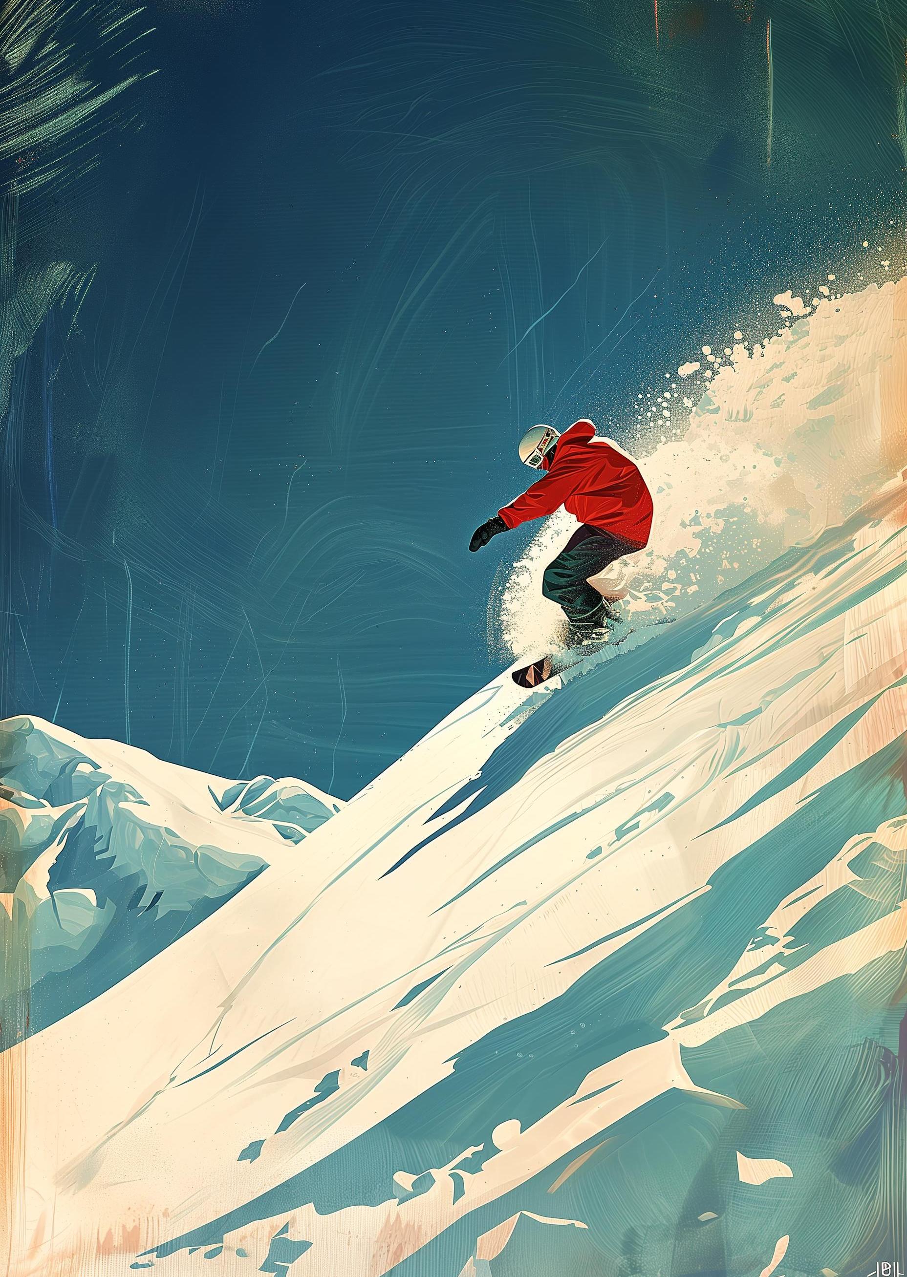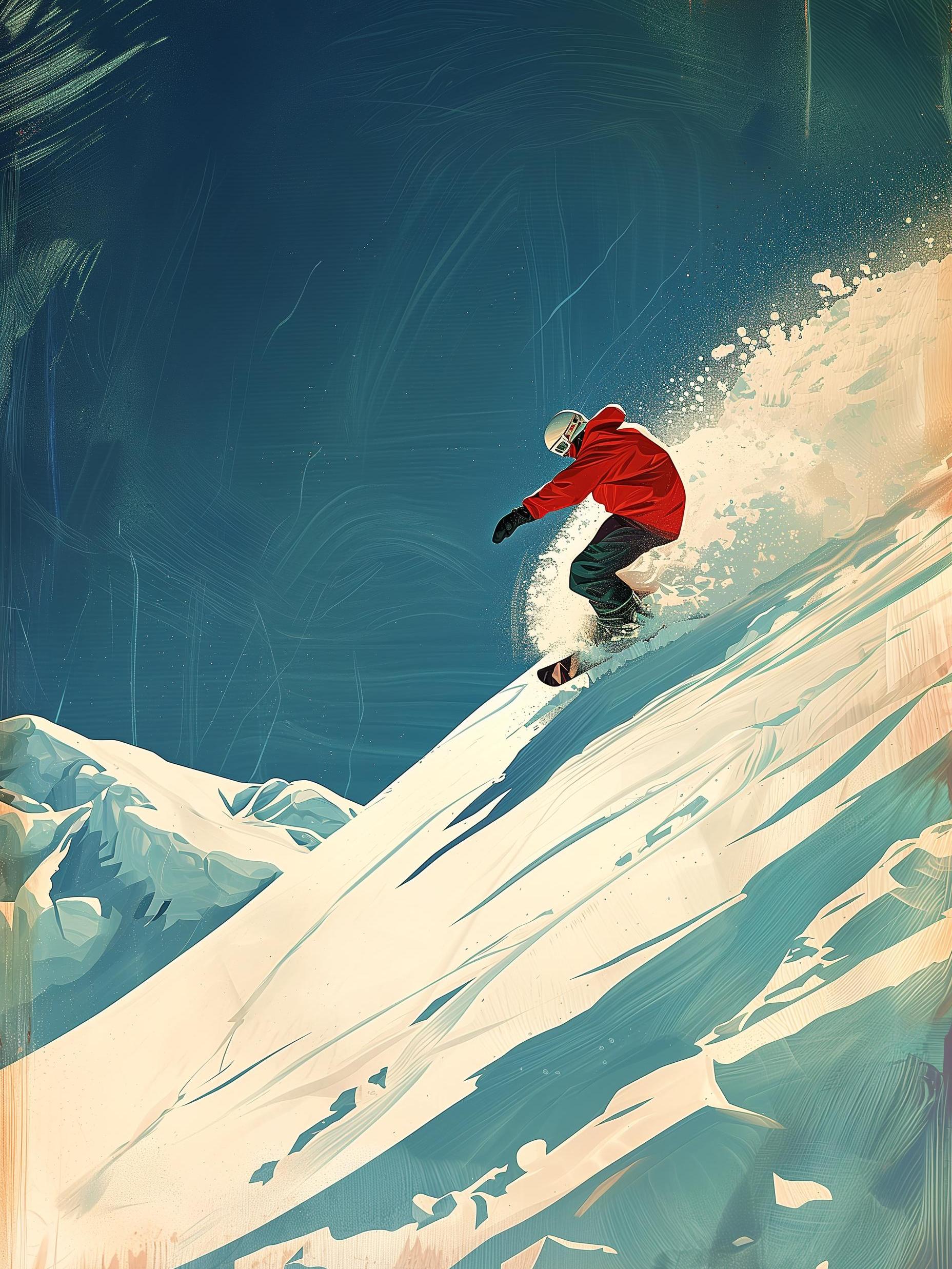 In the chill of winter, a lone snowboarder glides down the steep mountain. Snow sprays up like a wave as they carve a path through the white powder. The crisp air rushes past, and the mountain's challenge is met with fierce focus. With each swift turn, the rider dances with danger, but their skill turns risk into thrill. It's not just a sport; it's a battle against the mountain, and with every twist and jump, the snowboarder is winning.