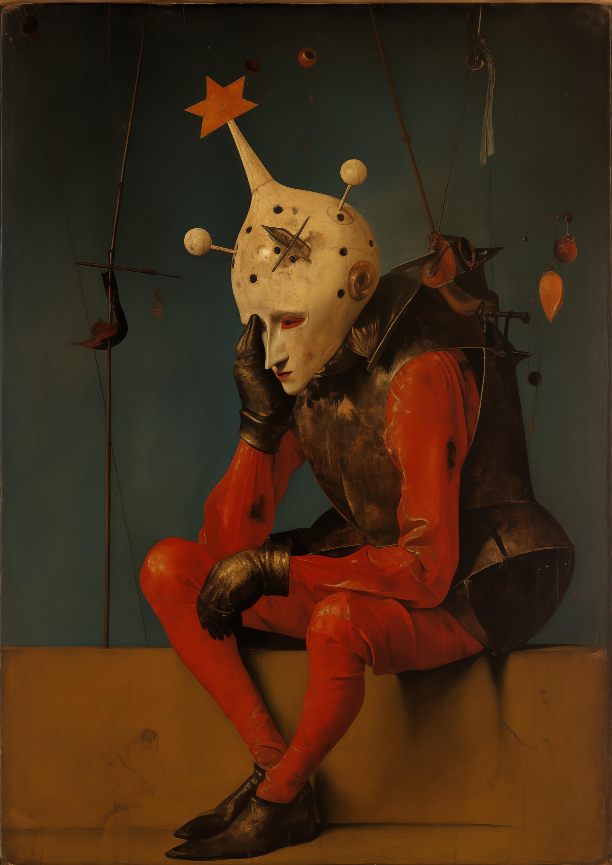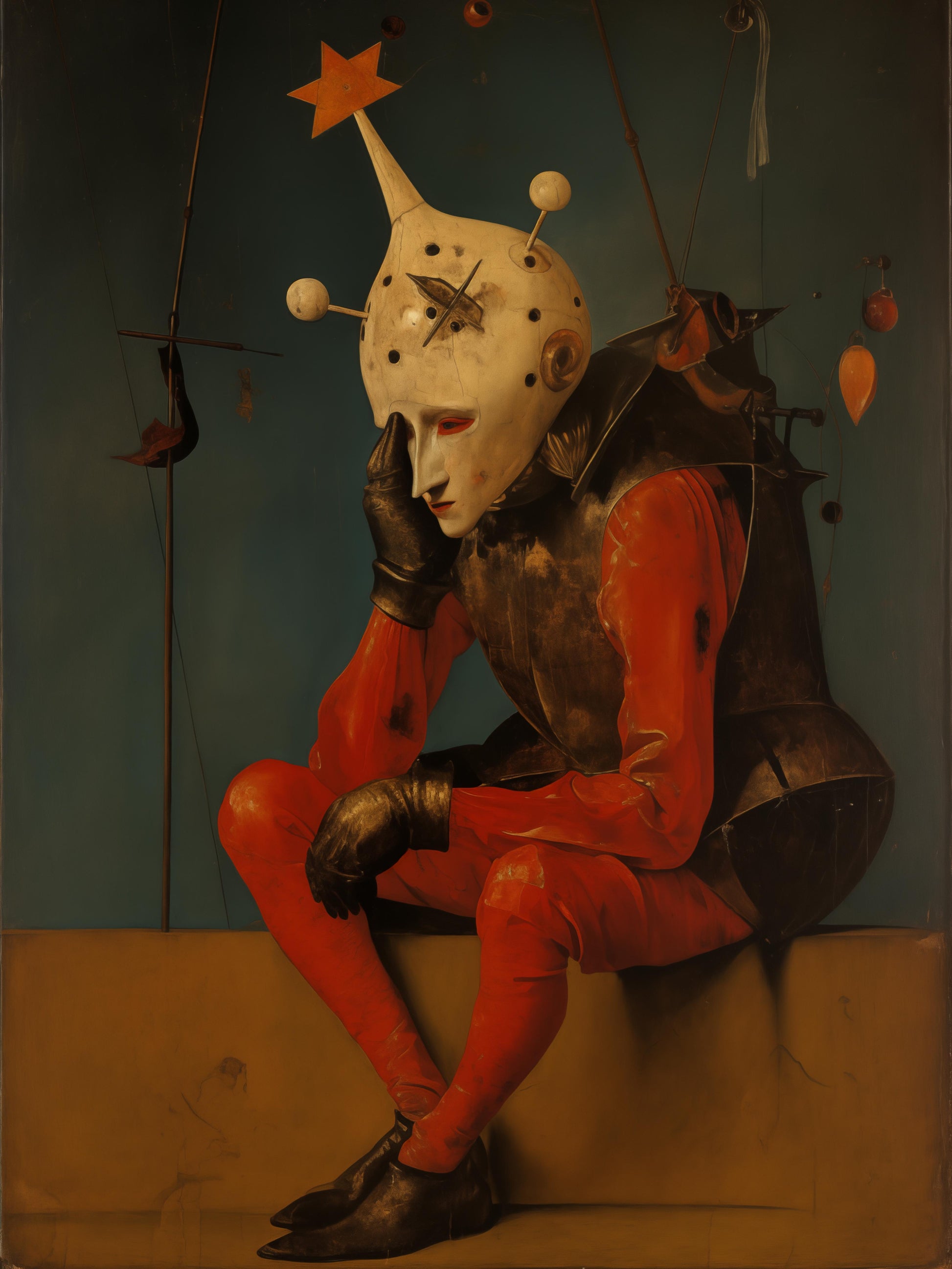 In a world tinted with the shades of imagination, there sat a thinker, cloaked in the colors of the sun's setting glow. His mind, a playground for celestial bodies, dangled with the strings of intrigue. Grappling with the vast canvas of thought, he pondered the play of life's marionette. Suspended between reality and the cosmos, he sought not what was painted before him, but rather the unseen strokes of existence, the hidden hues of meaning beyond the mere spectacle. His gaze, a silent quest for the essence nestled within the absurd and the profound, spoke of the human journey: a constant search for understanding amidst the playful artistry of the universe.