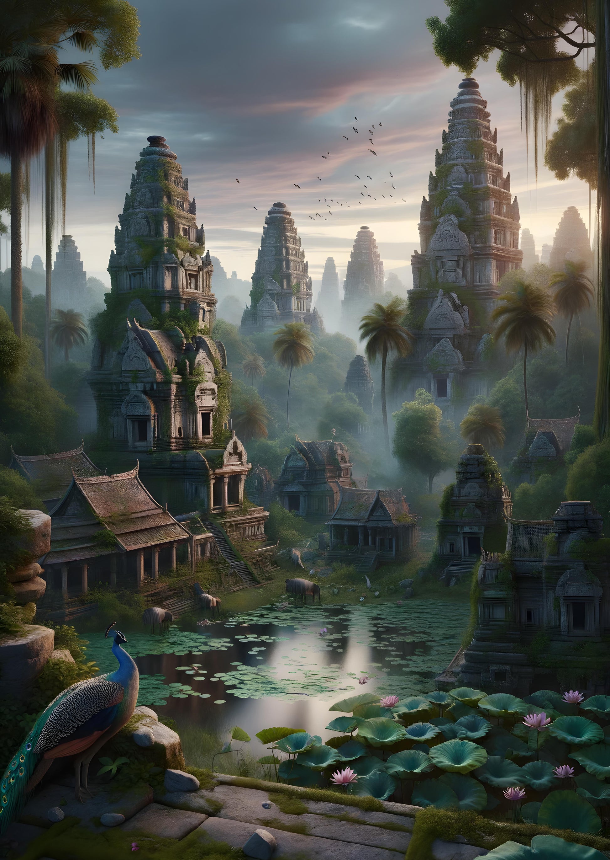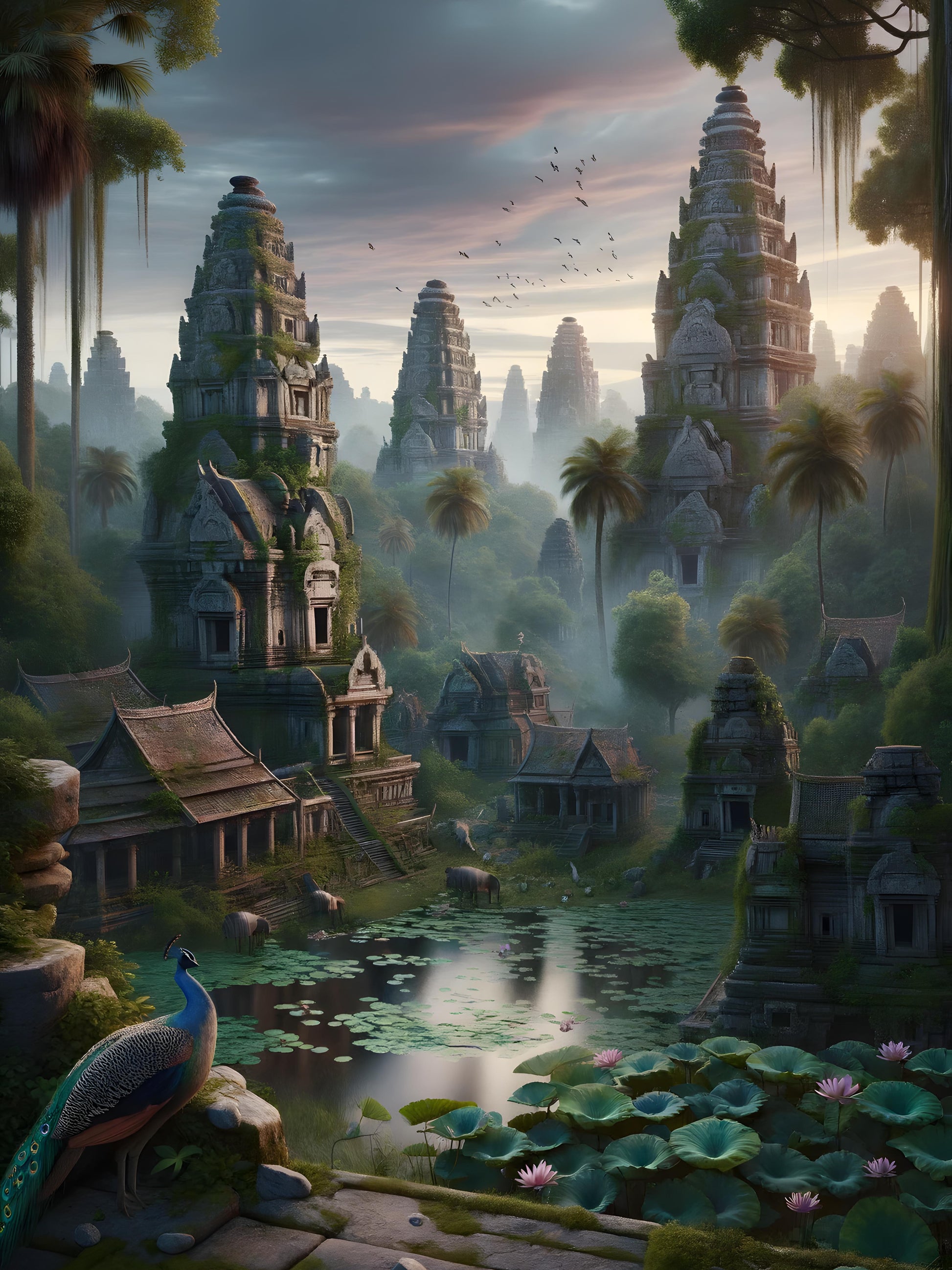In a hidden corner of the world, shrouded by high mist-clad towers and verdant foliage, lies a forgotten temple complex. It rises majestically, intertwining with nature as if rooted to the earth millenniums ago. Water mirrors the sky's first light, disturbed only by lily pads and their delicate blossoms. A peacock graces the stone stairs, its plumage a splash of vivid colors against the greys of time-worn architecture. Above, birds take flight in a coordinated dance with the dawn, creating a living, moving tapestry. This place, once pulsating with the footsteps of ancient worshipers, now breathes a different kind of life—calm, unhurried, and rich with untold narratives waiting to be rediscovered.