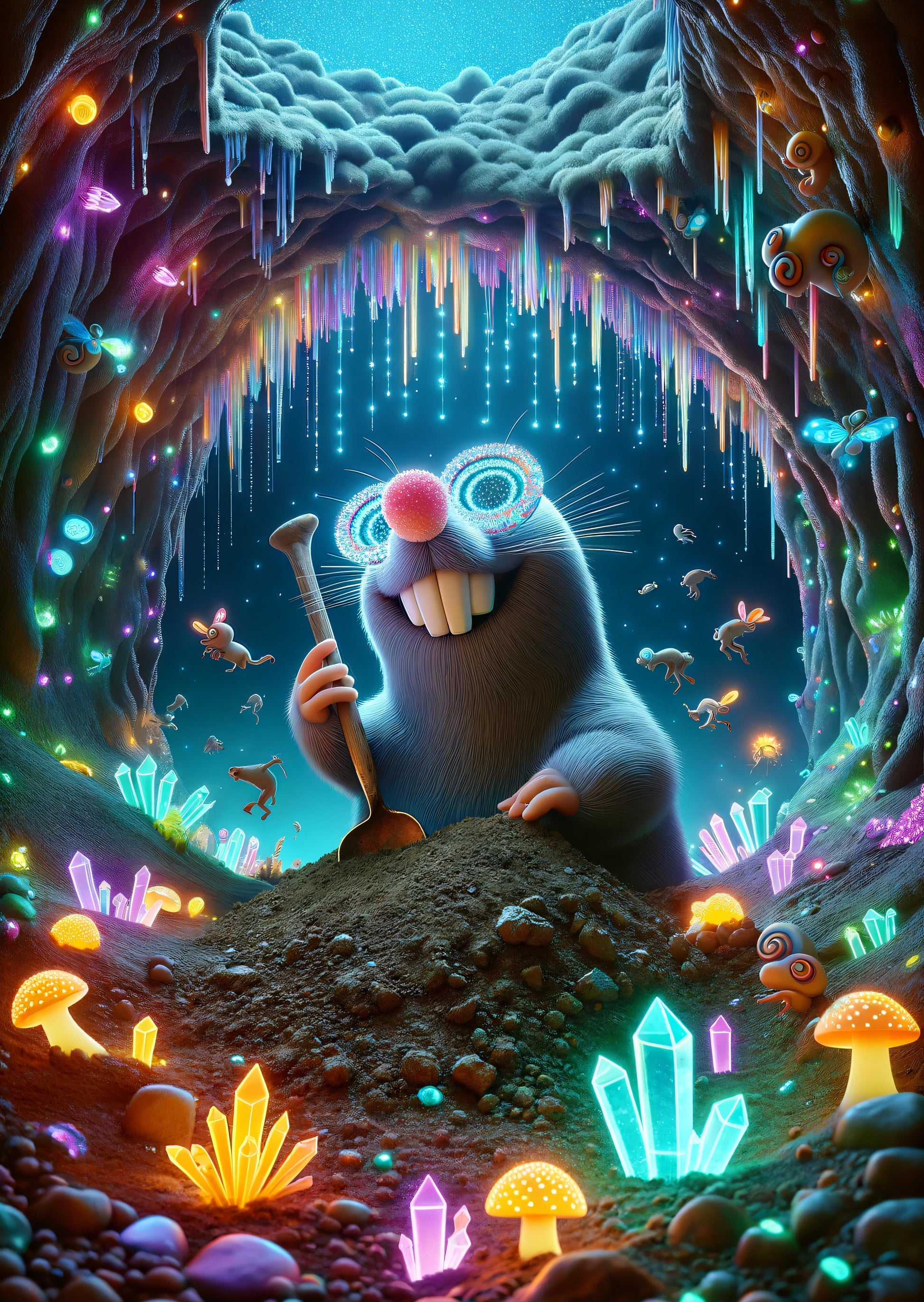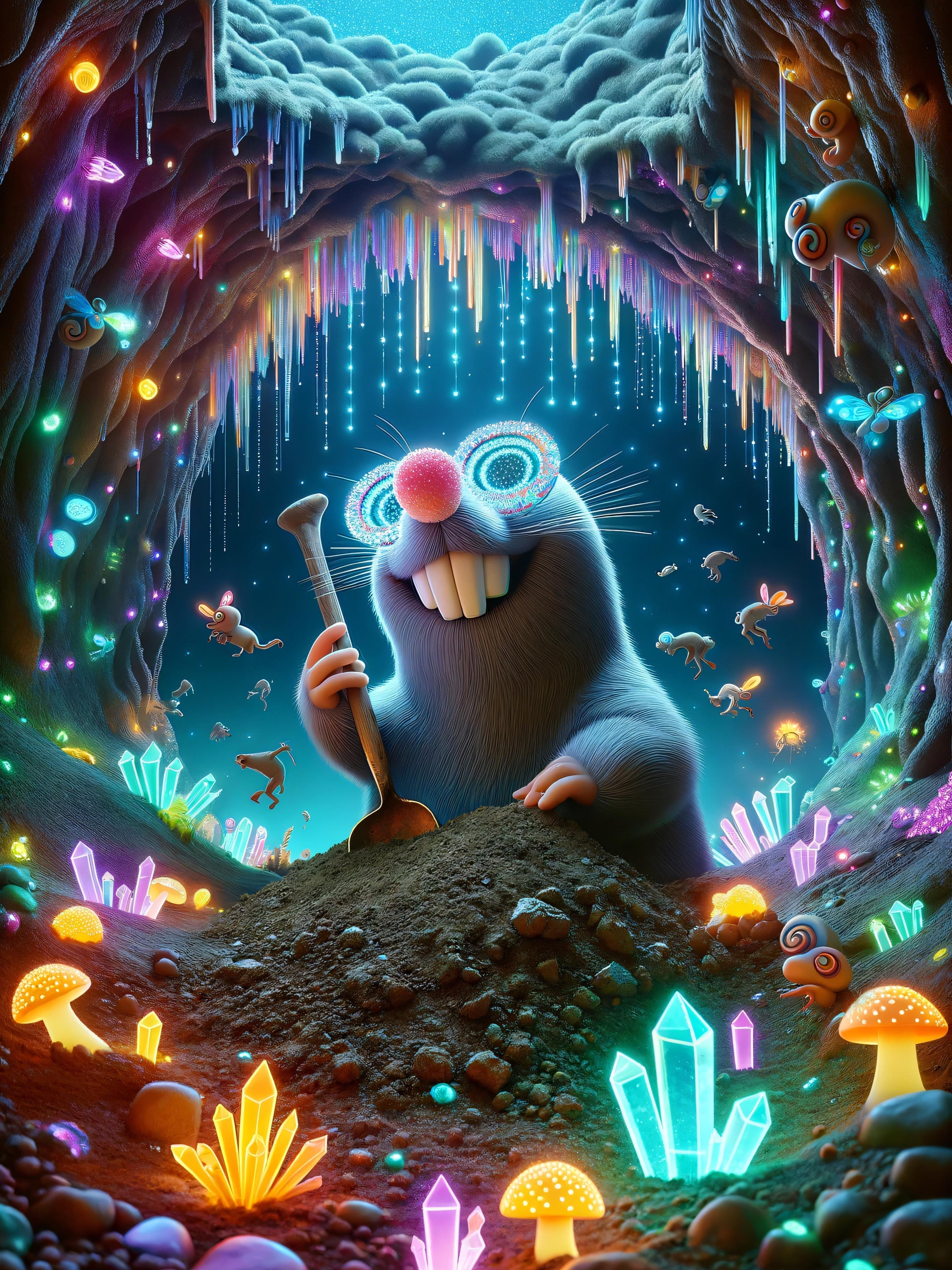 In a bright and colorful cave, a large, smiling creature gazes at a sky full of stars, which glimmer through an opening above. Around it, light falls like rain, and the air is alive with small, joyful animals. The creature holds a shovel, hinting at the work it has done to discover this hidden place. In every nook, brilliant crystals and mushrooms glow, sharing their colors with the world. This image tells us that sometimes, the results of our hard work can reveal a place full of wonder and delight, a space where light dances and life flourishes. It reminds us that there is beauty to be found when we dig deep, both into the earth and within ourselves.