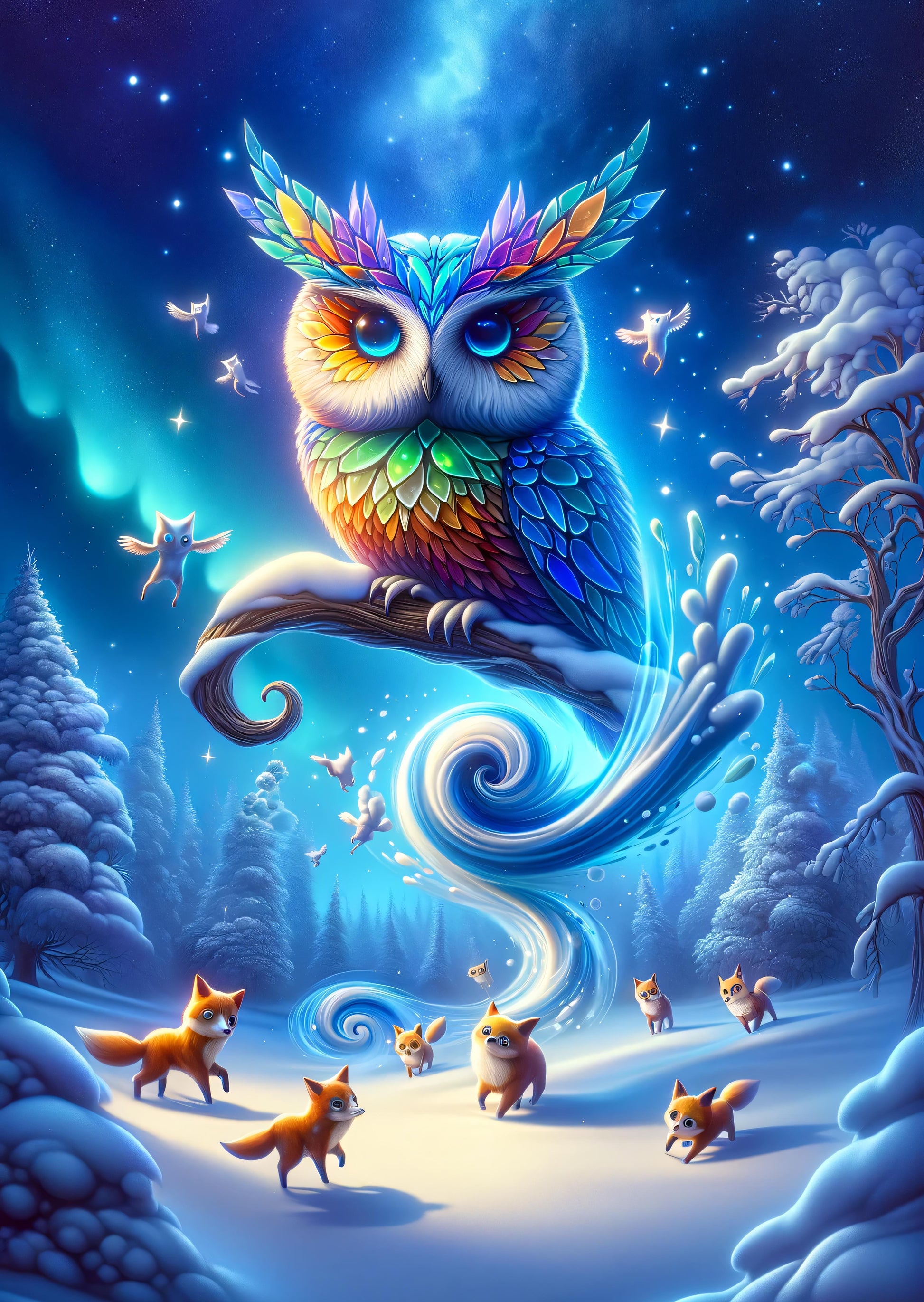 In a snowy forest, under a sparkling night sky, a colorful owl perches, wise and vibrant. It looks over a group of playful foxes with tender eyes, reminding us of the importance of guidance and knowledge. The owl's feathers, a tapestry of color, symbolize the diversity of life and the many paths wisdom can take. The foxes, curious and agile, leap joyfully, representing life's vibrant energy and the quest for learning. Stars above twinkle like thoughts, shaping ideas that dance in the mind's sky. Together, the creatures and the cosmos tell a tale of life's beauty, the pursuit of understanding, and the joy found in nature’s simple moments.