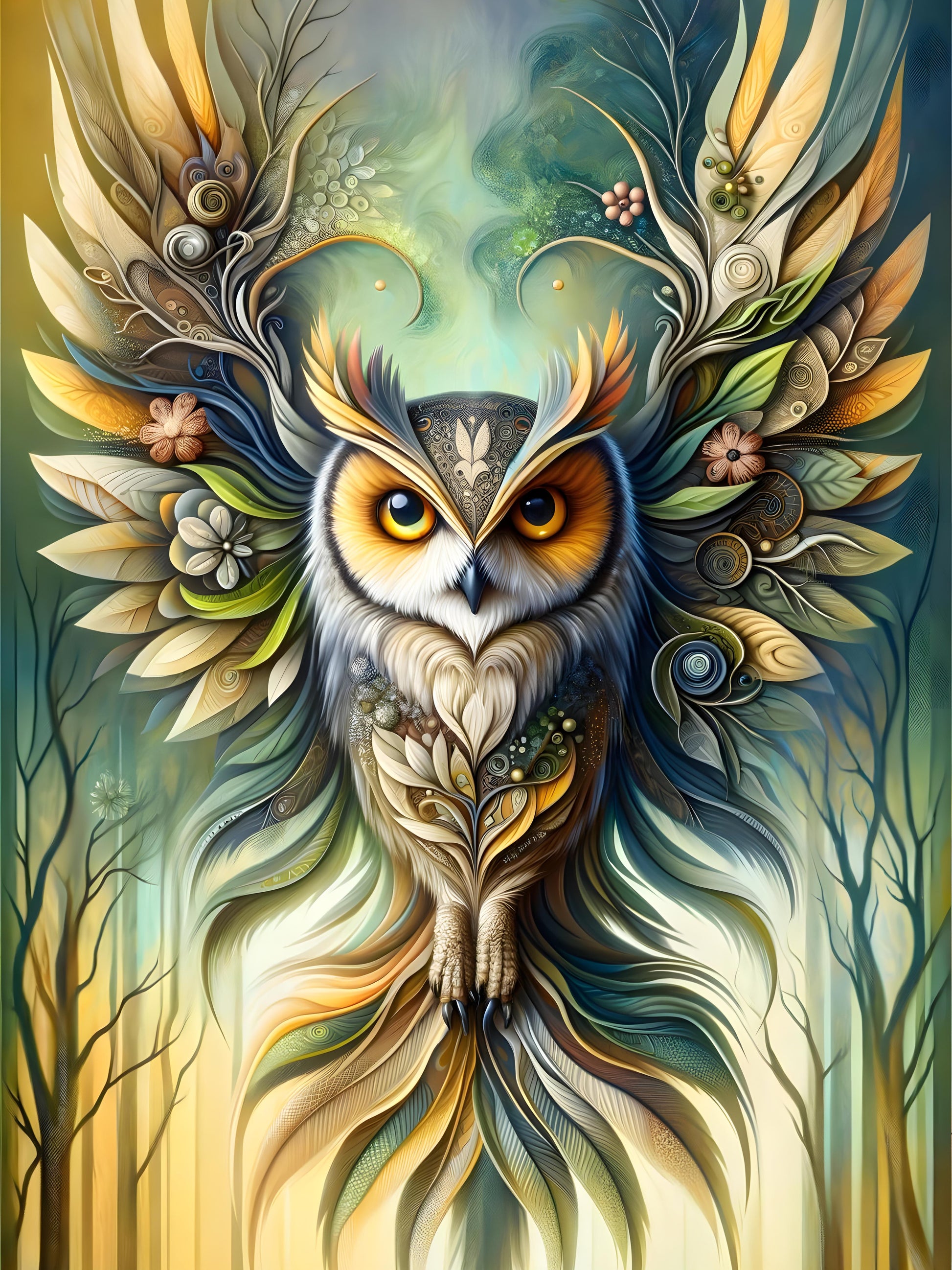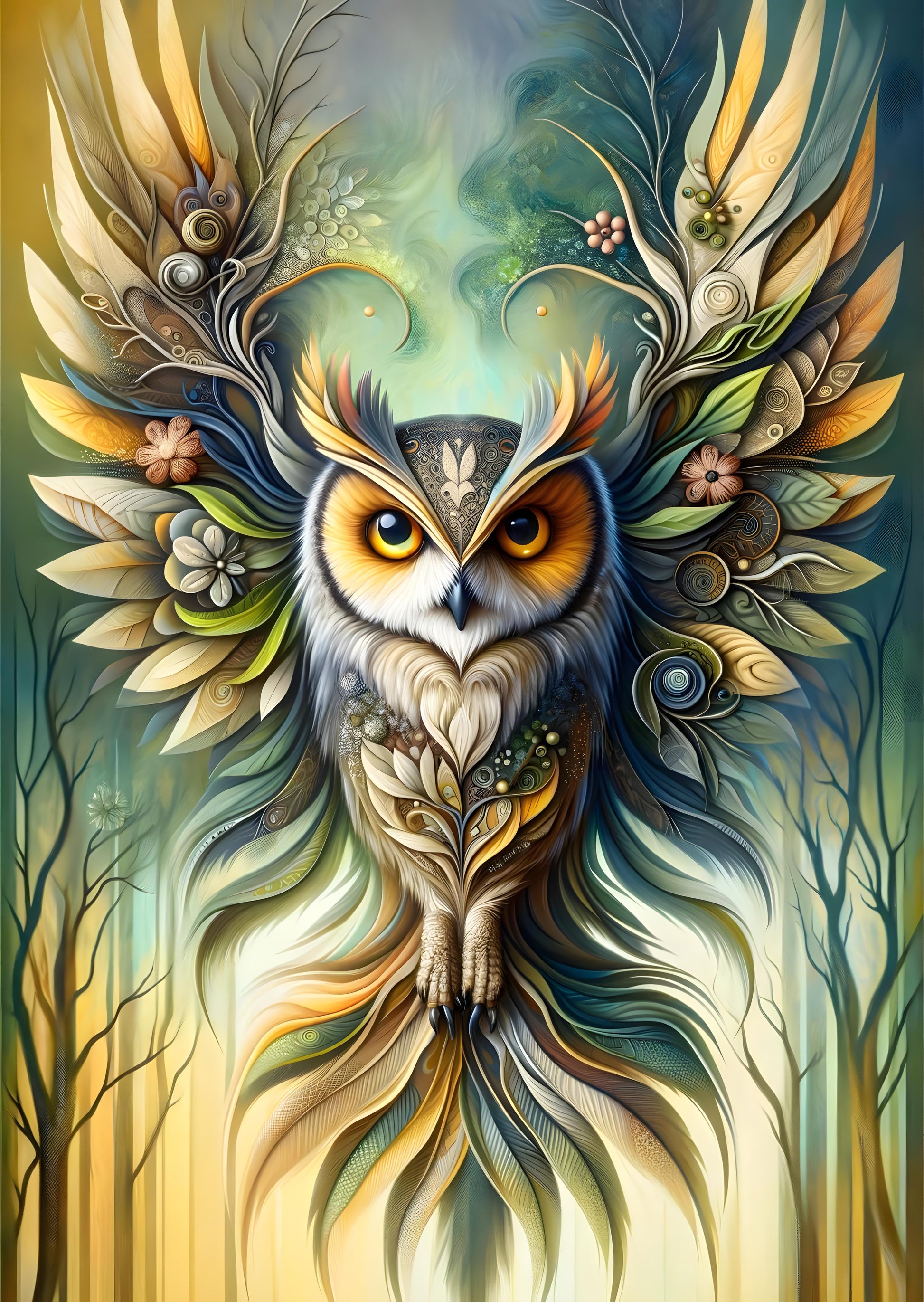 In a vibrant forest, a wise owl stood, its feathers adorned with the colors of nature. Its gaze was deep and knowing, seeing beyond the trees into the hearts of the forest dwellers. The owl, a keeper of ancient wisdom, was a guide to all creatures, sharing lessons of life's delicate balance. Its wings, a tapestry of the earth's beauty, reminded every being of the importance of unity with nature. The owl's stare, unwavering and kind, spoke of secrets not told in words but felt in the whispering leaves. Through this image, the story tells us that wisdom is found in the connection with the world around us, and life's truths are painted in the myriad colors of our experiences.