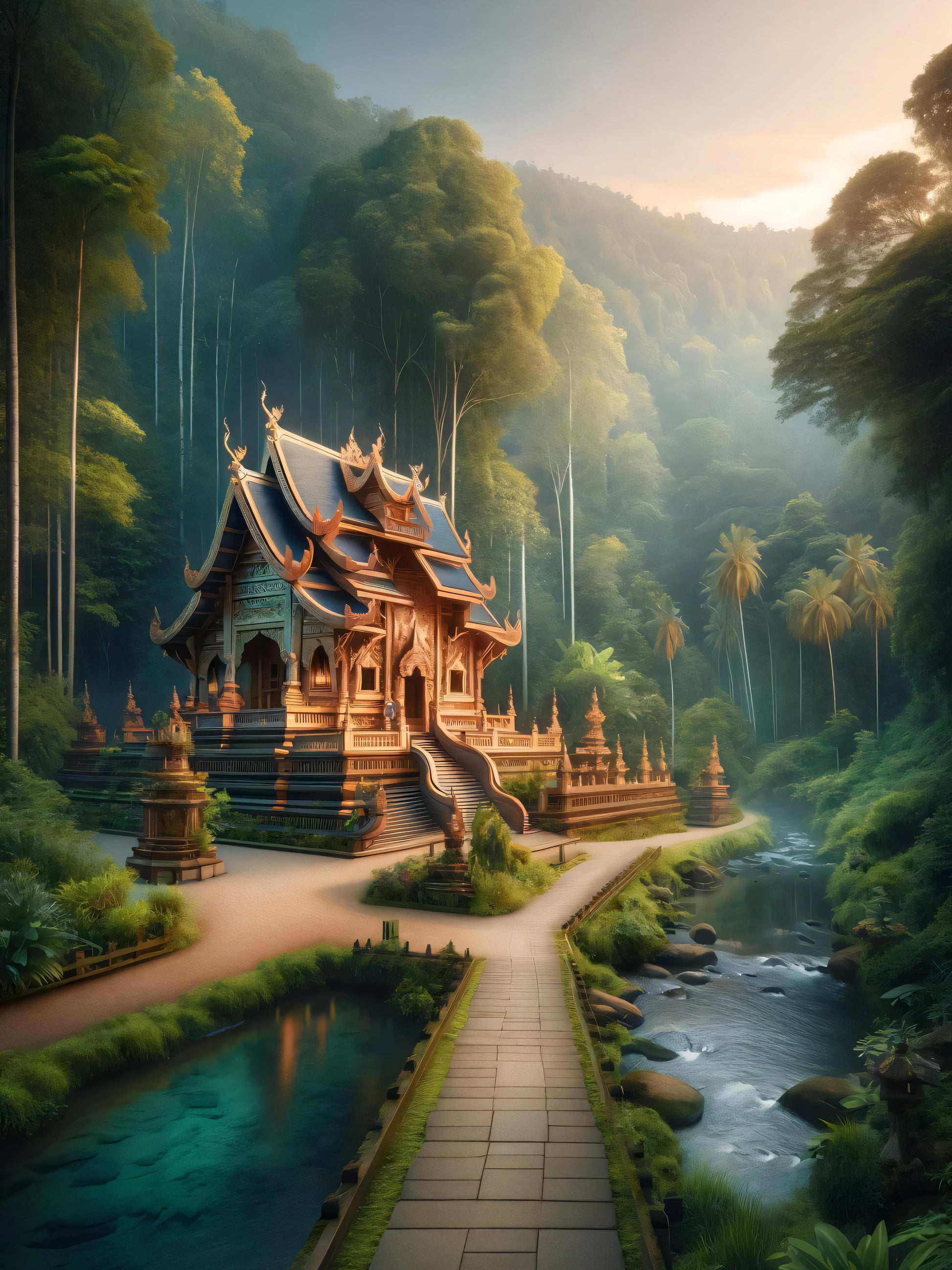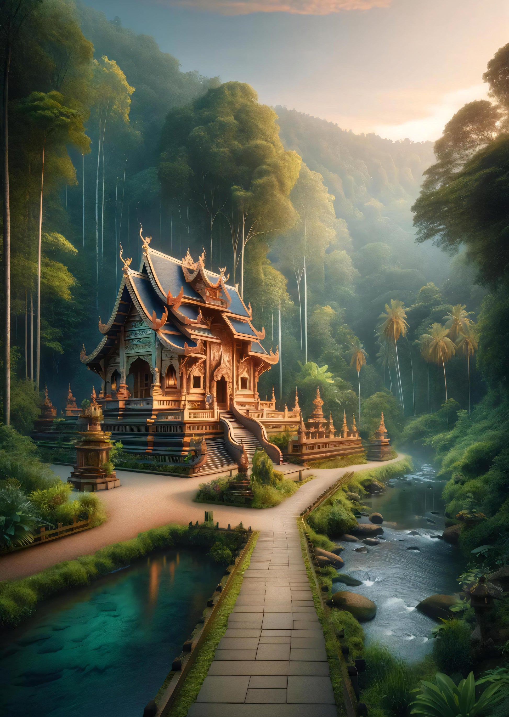 In a hidden valley, there stood an ancient temple, caressed by the soft rays of a setting sun. The temple, with its intricate woodwork and sweeping roofs, stood as a testament to time, inviting seekers on a path paved with stones of wisdom. The waters nearby, clear and calm, flowed with the graceful ease of age-old knowledge. Surrounding trees stood tall, like wise guardians of nature's own hallowed halls, their leaves whispering lessons in a language beyond words. Here, amidst the gentle natural splendor, the temple remained a silent beacon of reflection, reminding all who approached that within stillness and beauty lies the profound simplicity of life's truest treasures.