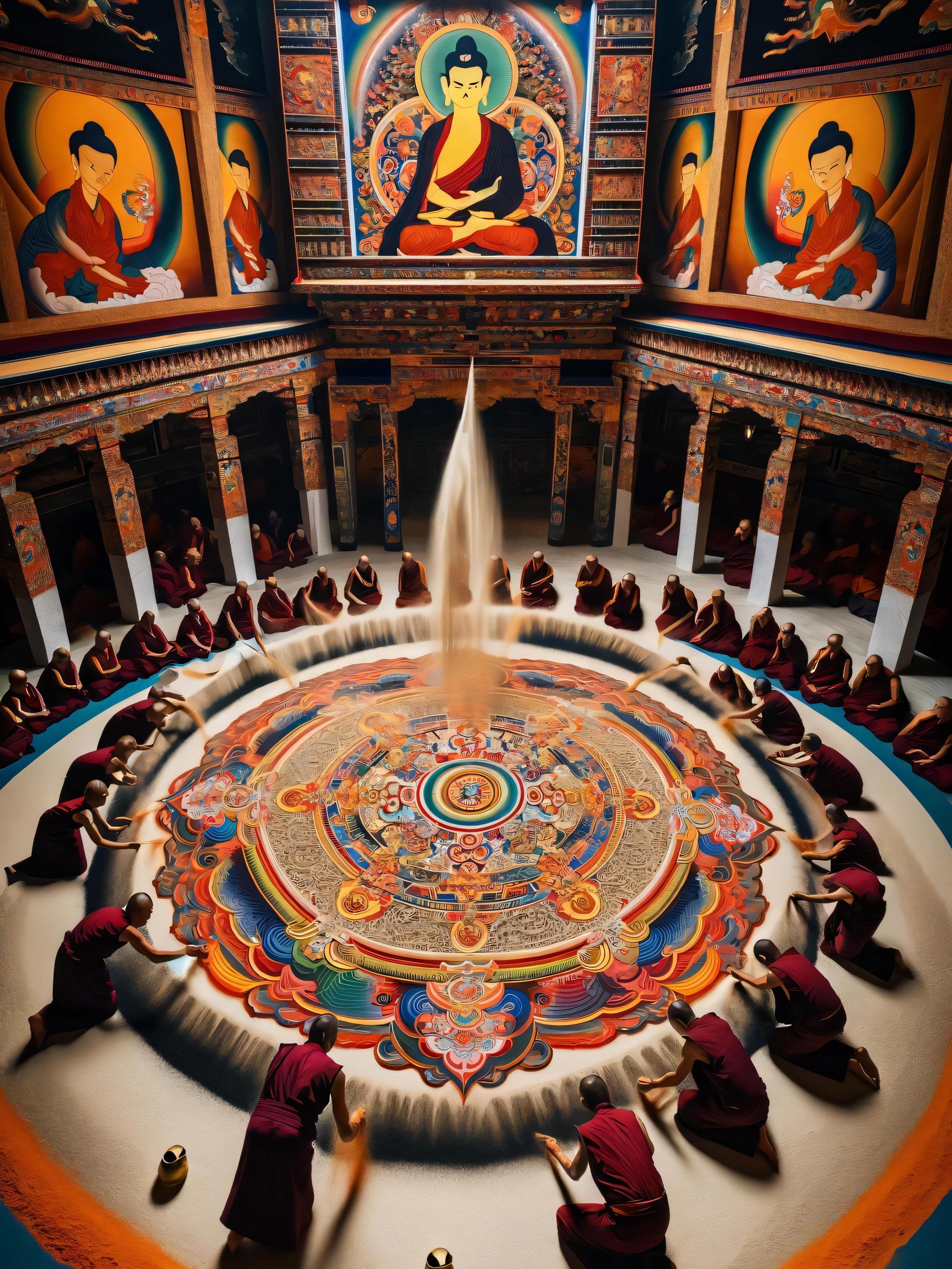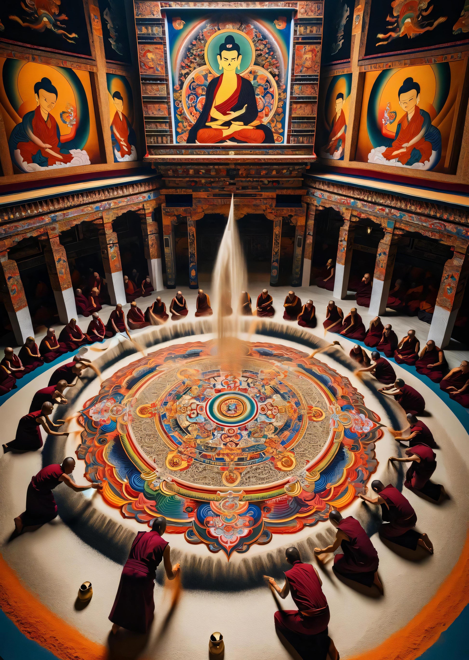 In a brightly lit space, a group of monks gather, their maroon robes a stark contrast against the vibrant colors around them. They sit in a circle around an intricate sand painting, a symbol of life's fleeting nature. At the center of the room, a fountain bursts upwards, much like the energy of life. Above, paintings of wise figures overlook the scene, offering silent guidance. The monks' quiet focus on the art before them speaks to the value of concentration and the rich beauty of creation. This moment, with its vivid depiction of focus, artistry, and tradition, captures a lesson in presence and the impermanence of existence.